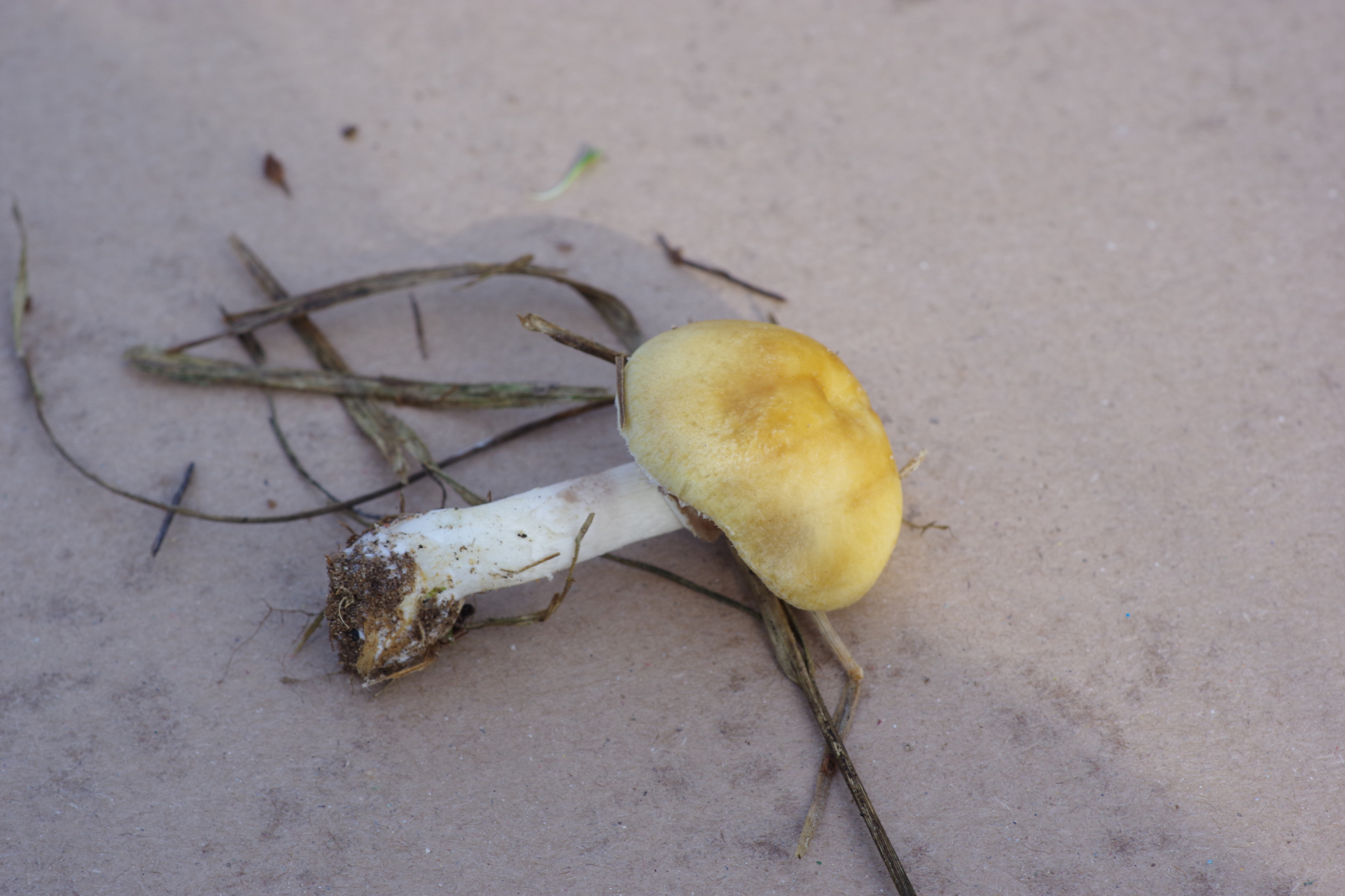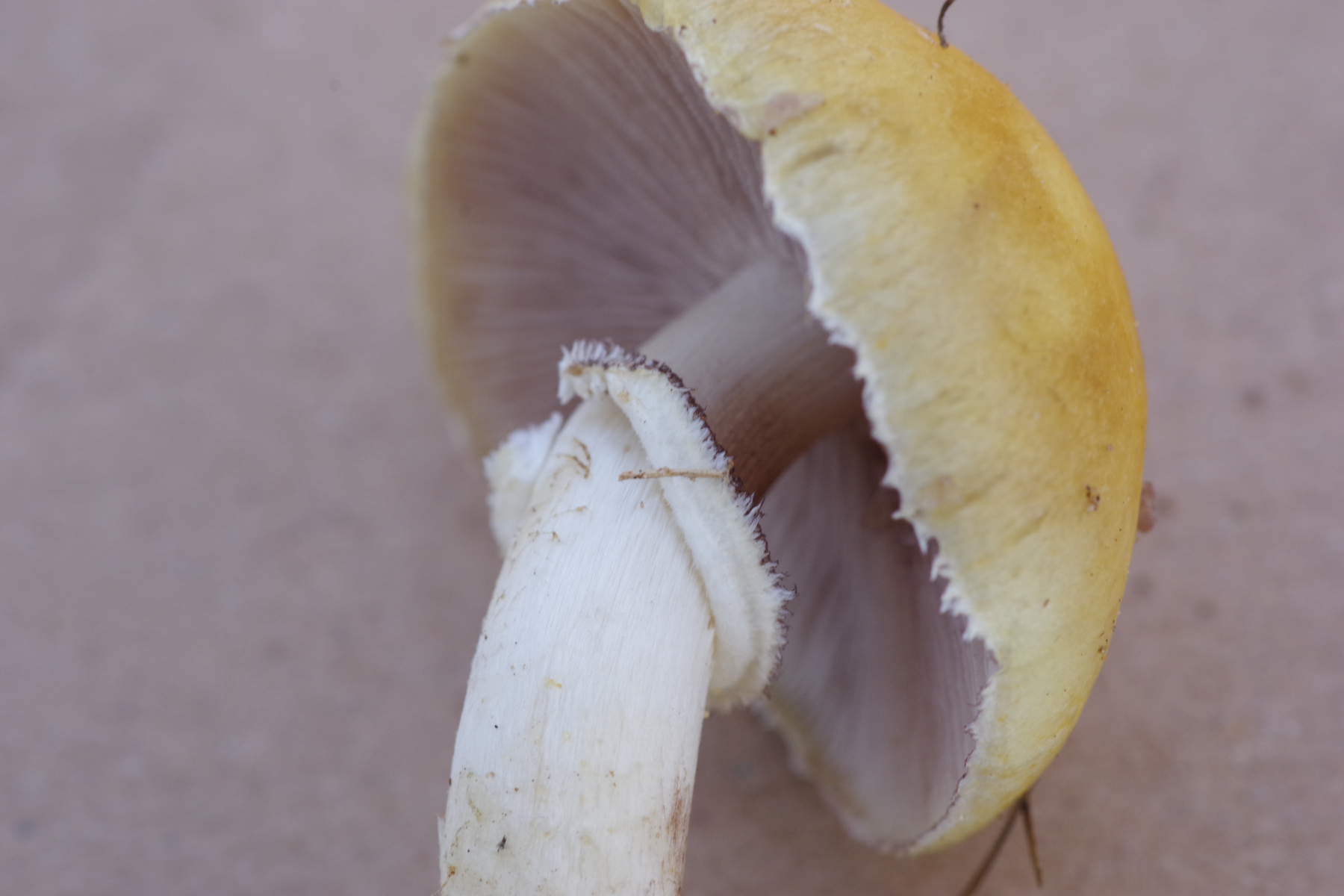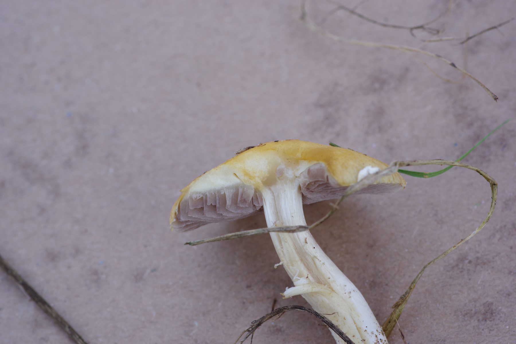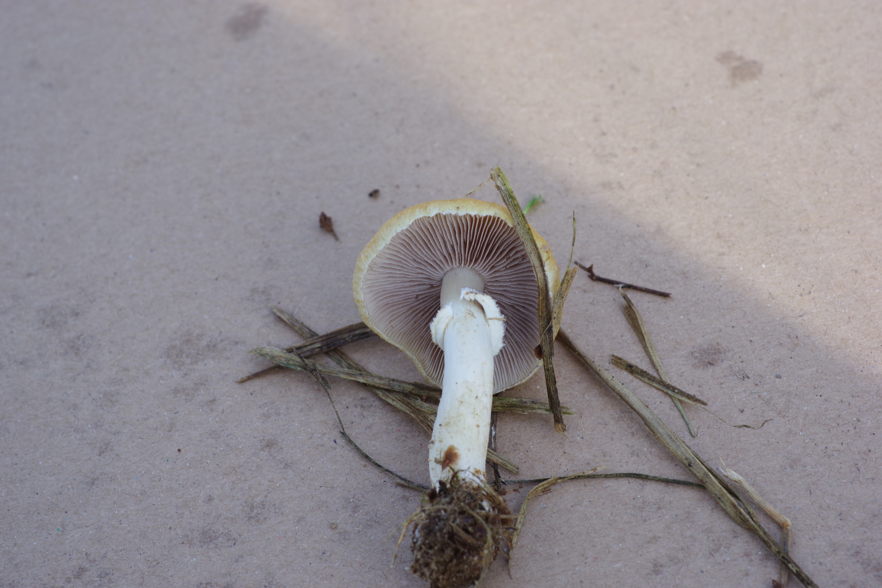 während ich so mit der Ausgrabung der vermutlichen Xylaria beschäftigt war, sah ich zwischen dem Sandreitgras etwas Orangenes. Mangels geeigneter Bäume schloss ich messerscharf aus, dass es ein Apfel ist, und siehe da ein Pilz. Orange mit grauen Lamellen, weißem Stiel und deutlichem Ring - ungewöhnliche Kombination. Nach einigem Suchen kam ich zu A. lutosus / comtulus (laut pilze-deutschland wären das Synonyme), die heimische Literatur kennt nur A. comtulus, und meint "nicht selten".