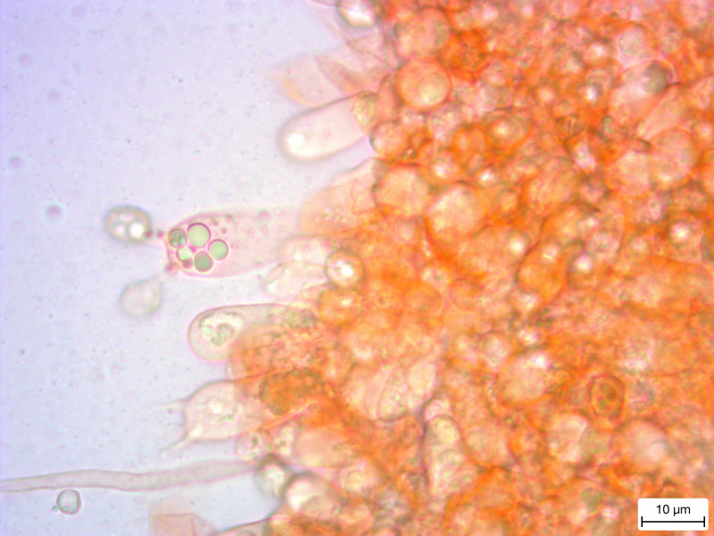 Ist vielleicht ein Schirmling oder eine Cystoderma, wenn es diese mit so hellem Stiel gibt. Vielleicht der Amianth-Körnchenschirmling, allerdings fiel mir der sonst auffällige Geruch nicht auf, was doch wieder dagegen spricht. Die Pilze waren noch sehr jung. Sporen waren noch nicht ausgebildet. Auffällig waren die dicken Cheilozystiden. Vielleicht passt ja ein anderer Name besser. Oder ich muss warten, bis es ein größeres Exemplar gibt.