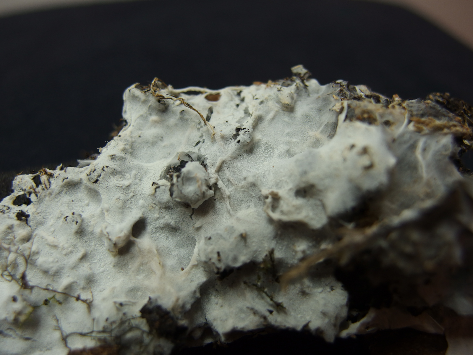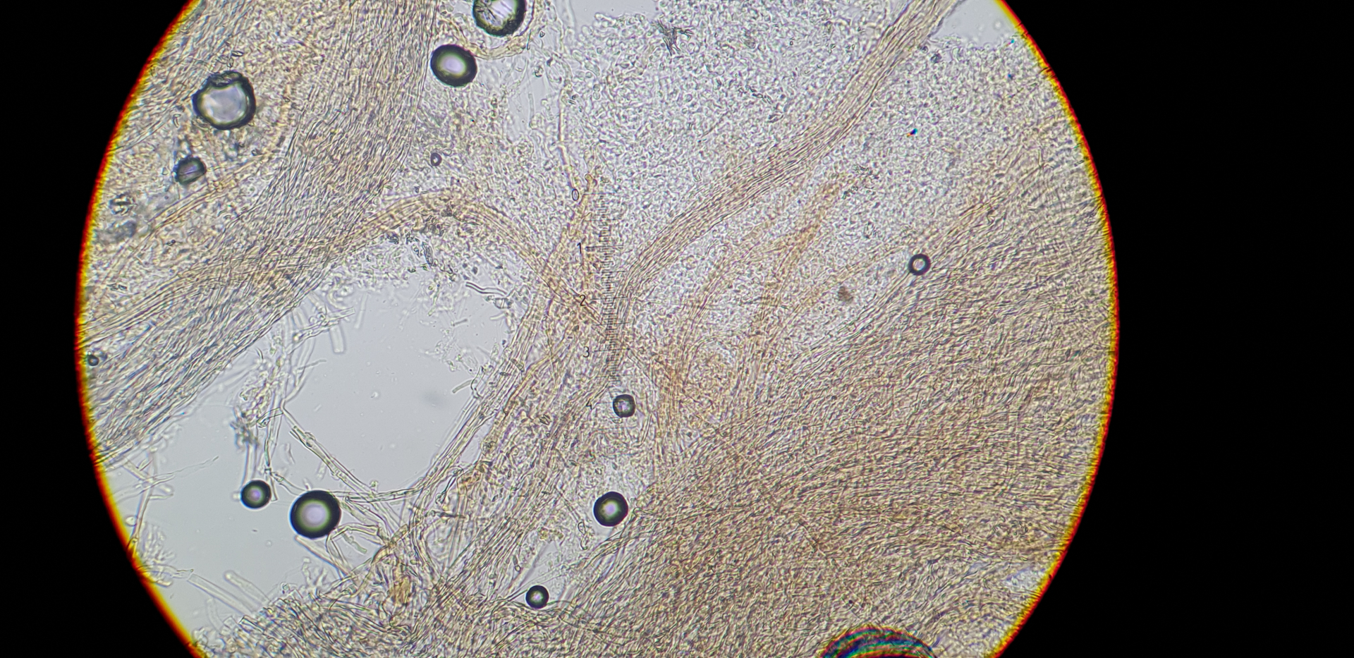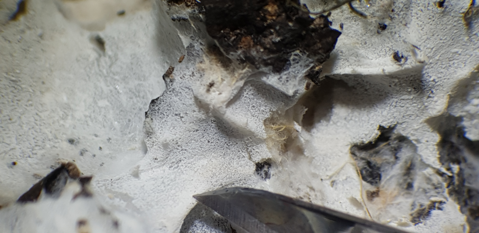Der Pilz ist sehr dünn, leicht ablösbar und unter der weiße Oberfläche verstecken sich gelbe Rhizomorphen (Bild 4-7), sie bestehen aus Dickwandigen Hyphenstrengen, die sind septiert und haben schnallen.