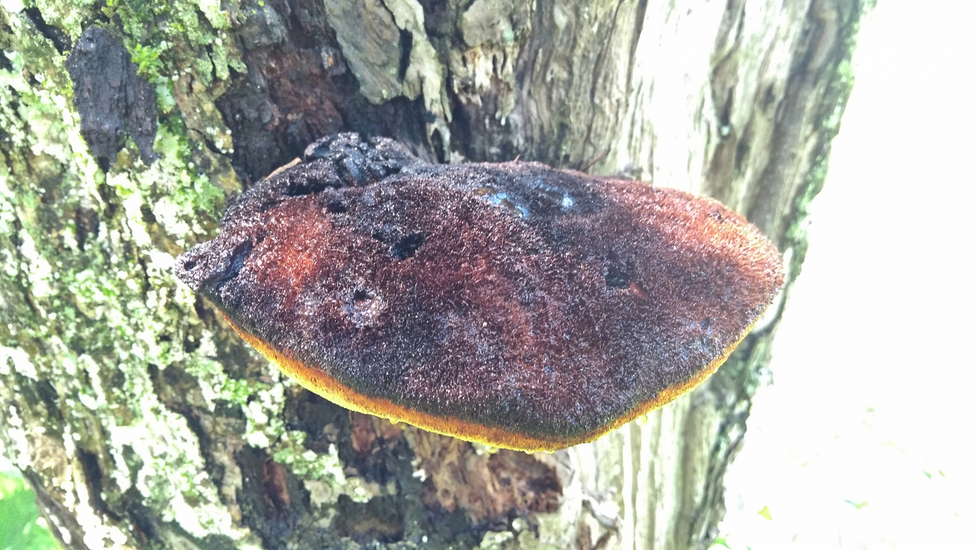 gestern fand ich unmittelbar nach einem kräftigen Regenschauer diesen Fruchtkörper am abgestorbenen Teil einer Mehlbeere, von dem ich vermute, dass es sich um eine Elsbeere handelt. Baumbestimmung lernt man ja bei der Beschäftigung mit Pilzen automatisch mit.In diesem Fall bin ich anders herum vorgegangen: ich meine den Pilz als Zottiger Schillerporling (Inonotus hispidus) identifiziert zu haben und habe nach dessen Substraten gesucht. Dazu ist mir leider nur ein unscharfes Foto gelungen.