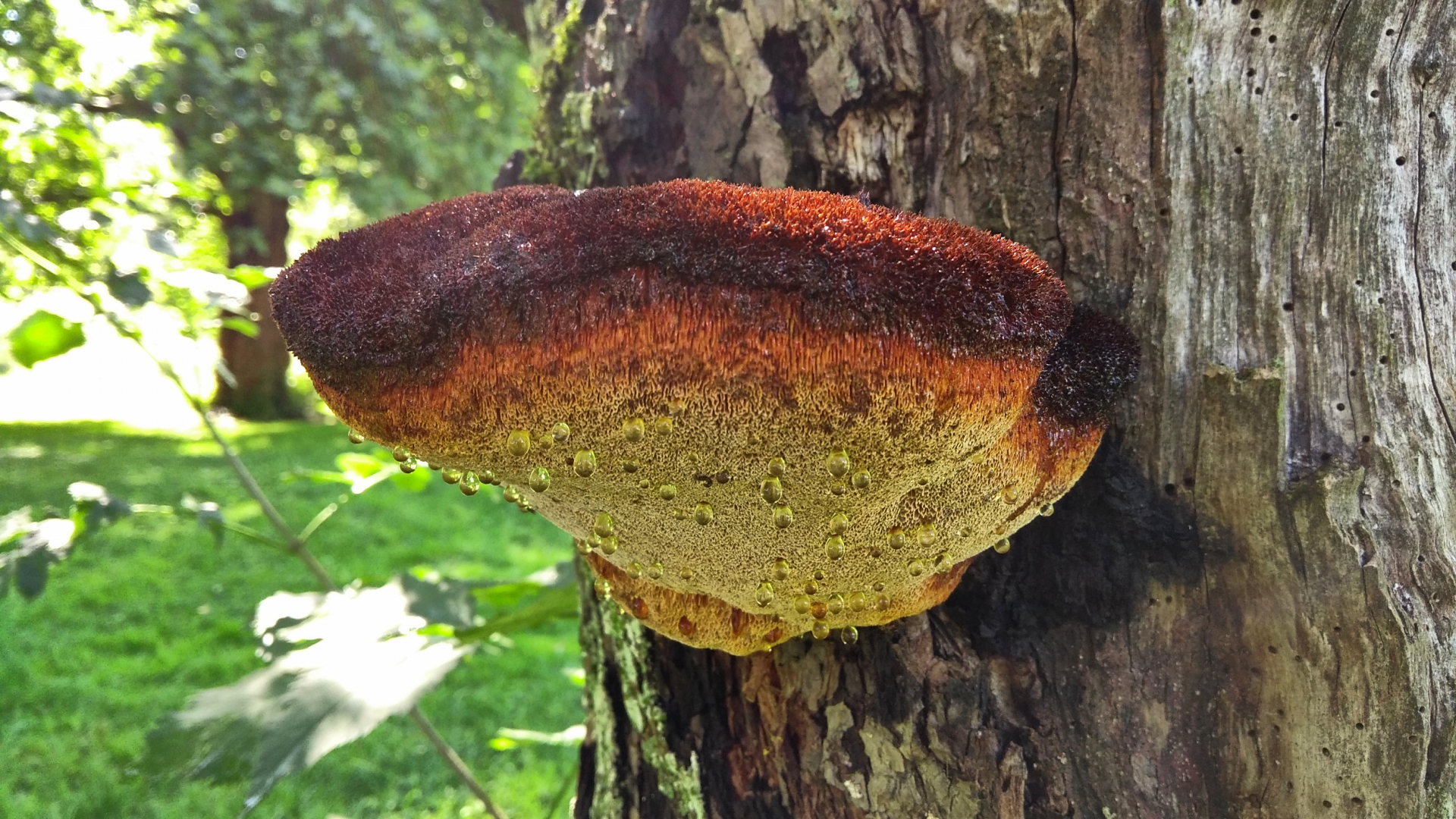 Der Pilz ist auf dem Hut sehr striegelig, fast wie weiches Moos, und klebrig. Die Guttationstropfen wie Ahornsirup. Habe kein Schnittbild, wollte den Fruchtkörper nicht zerstören, weil es der einzige war.