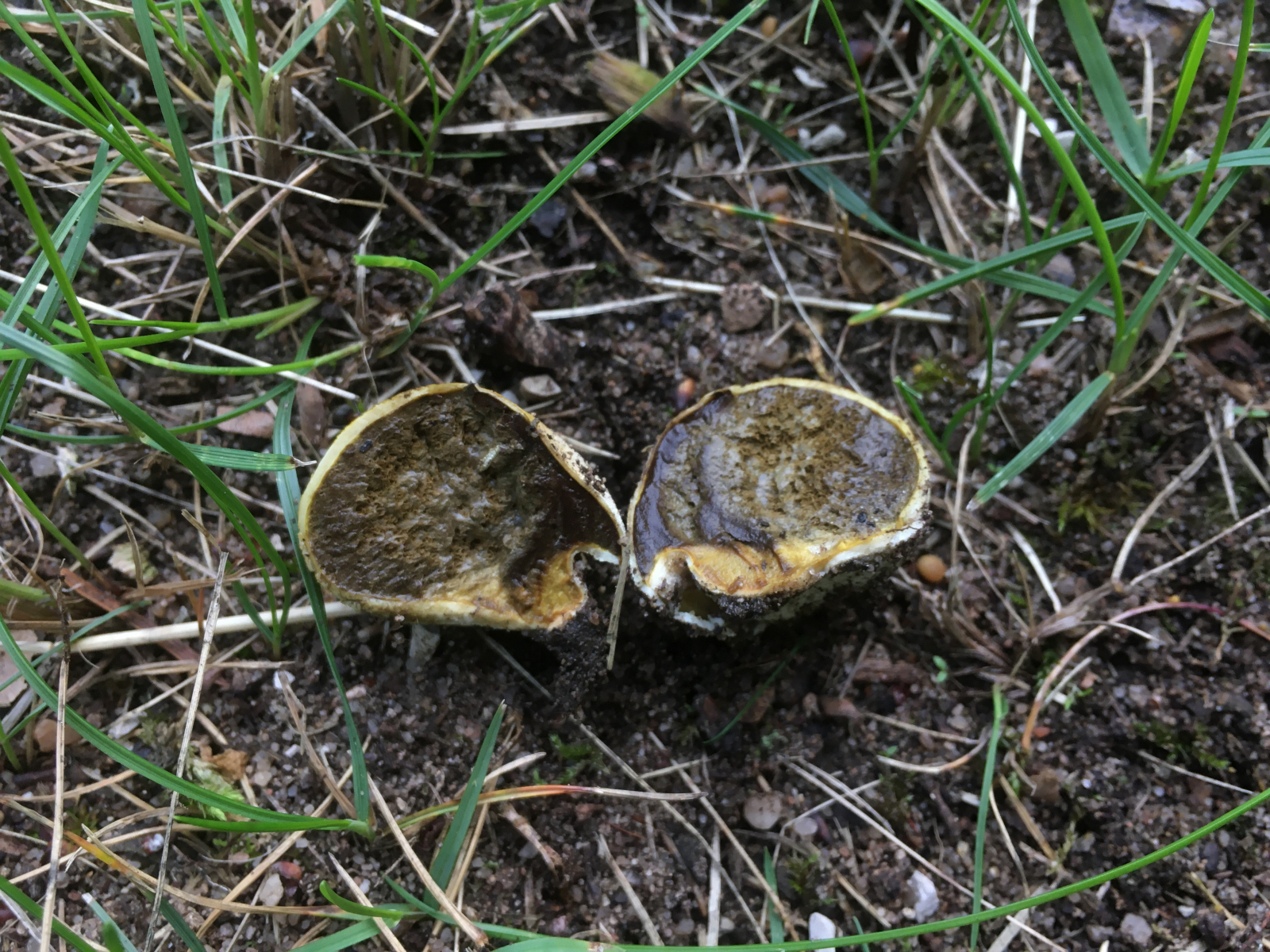 6) ein Stäubling mit schön gelber Peridie- oder ist das evtl ein Befall? im Park auf Sandboden.