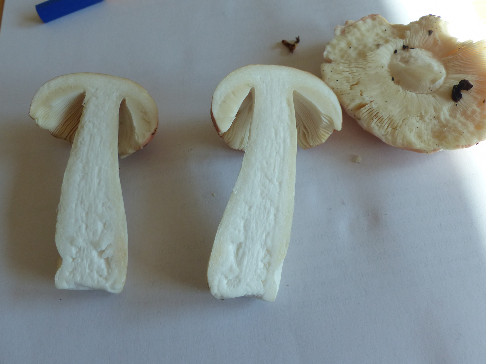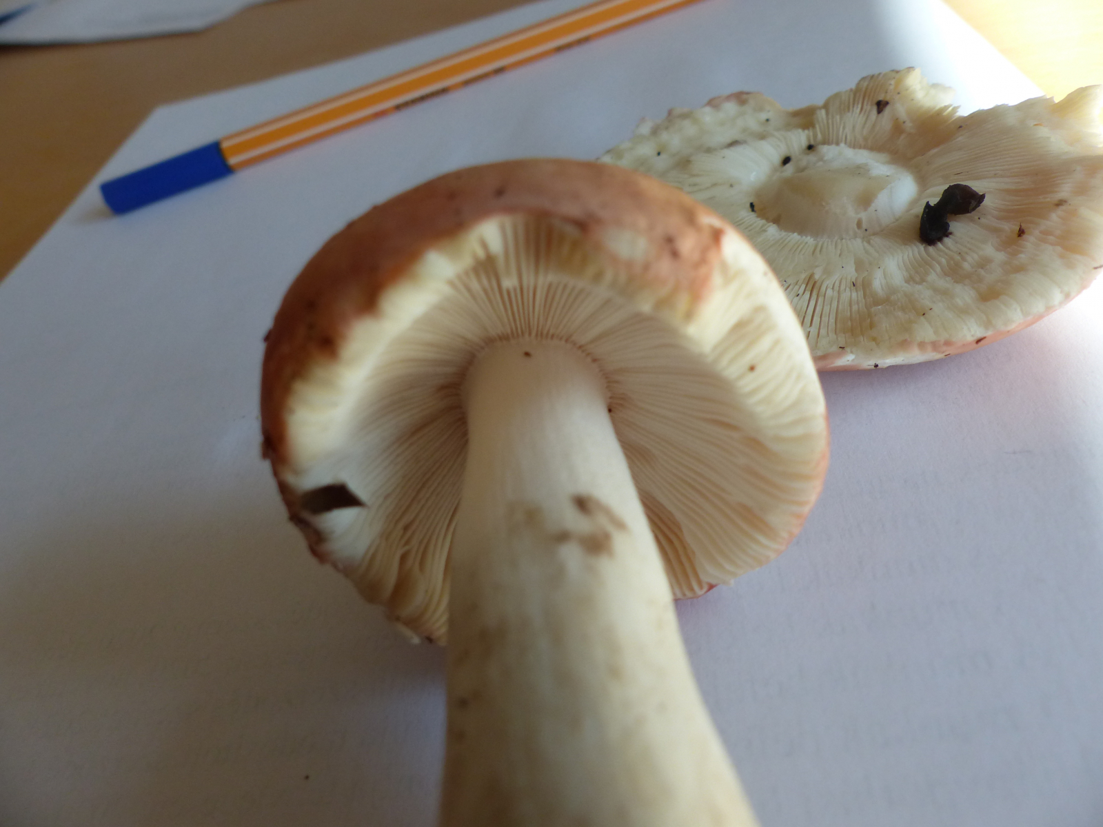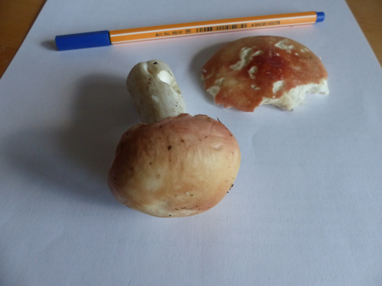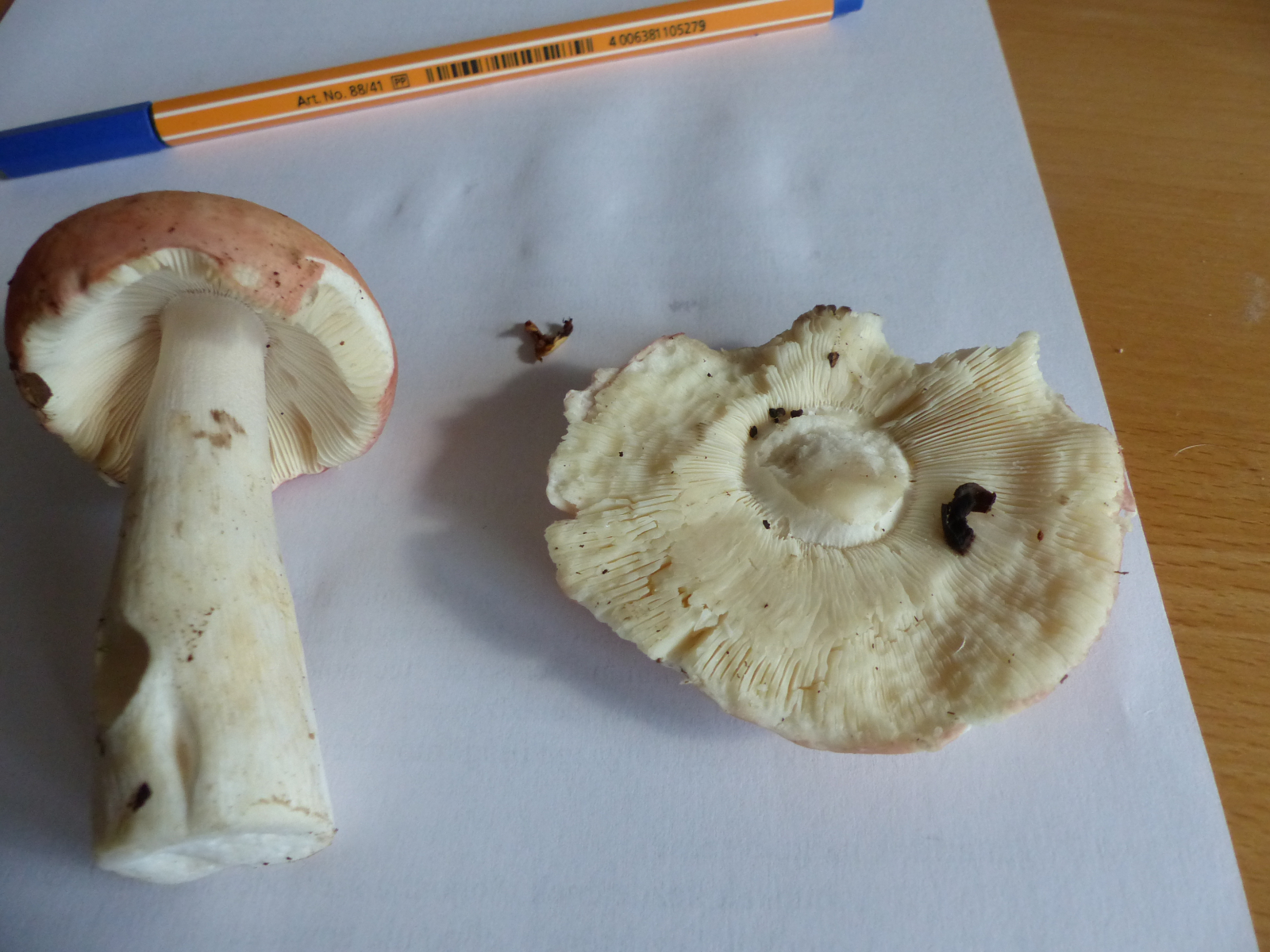 in den letzten Wochen bin ich bei mir im Buchenwald immer mal wieder über einen sehr stattlichen Täubling gestolpert. Trat einzeln oder in kleinen Trupps auf. Geschmack war mild, aber weder nussig noch süßlich, eigentlich schmeckte der nach gar nichts. Ich hab jetzt mal zwei Exemplare zur genaueren Untersuchung mitgenommen.