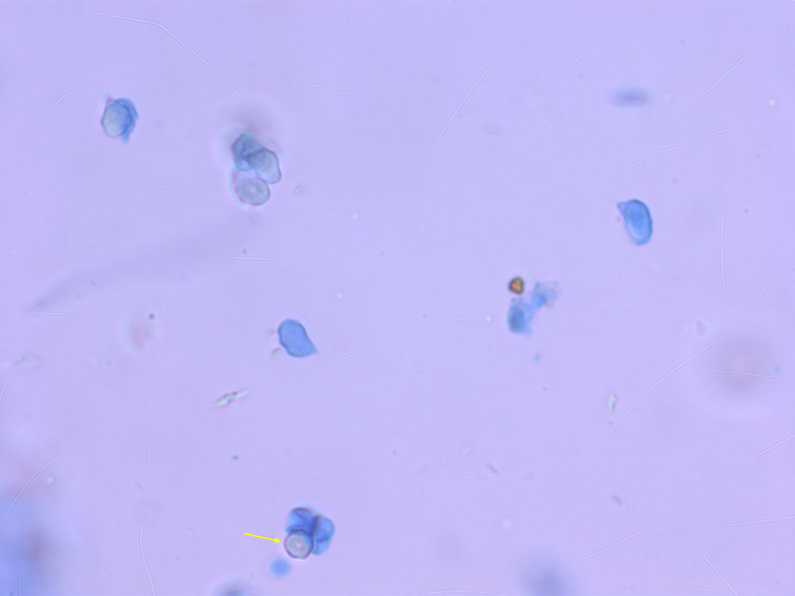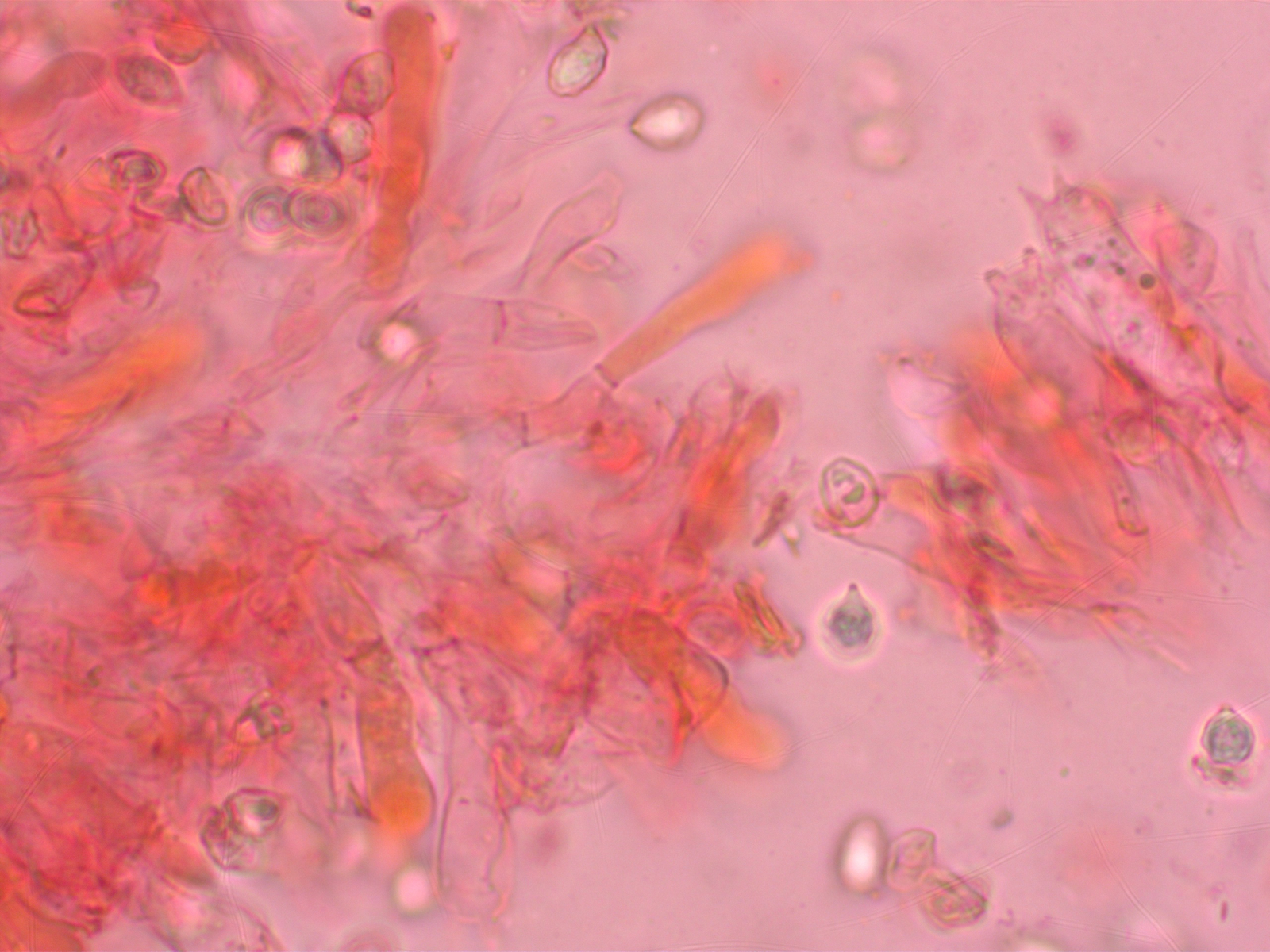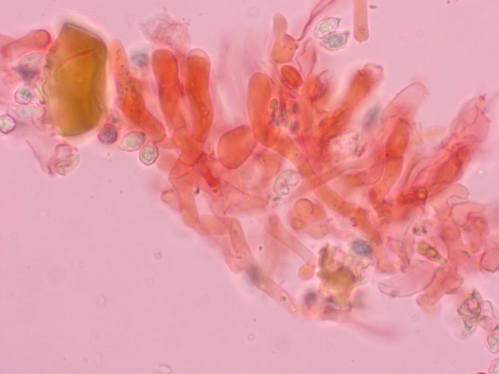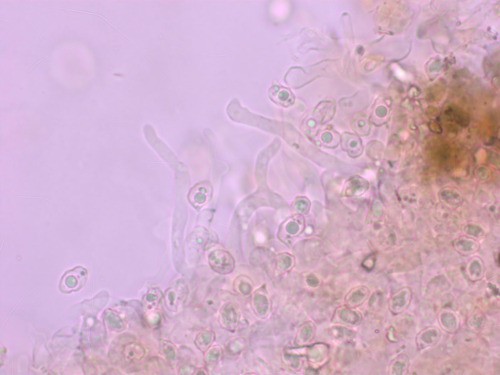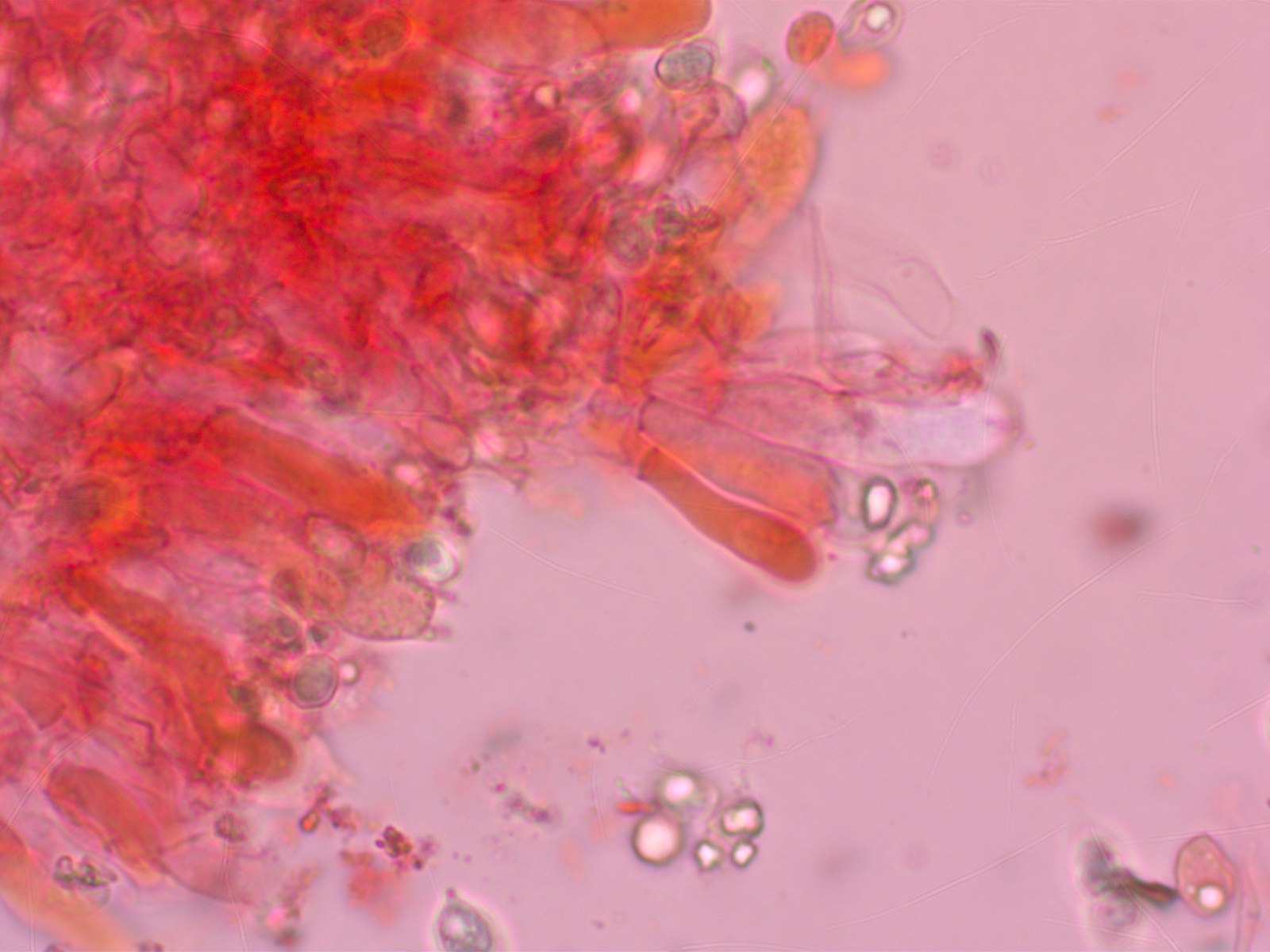 Lamellenschneide heterogen, es gibt vereinzelte Cheilozystiden, verschieden geformt und wenig auffällig.