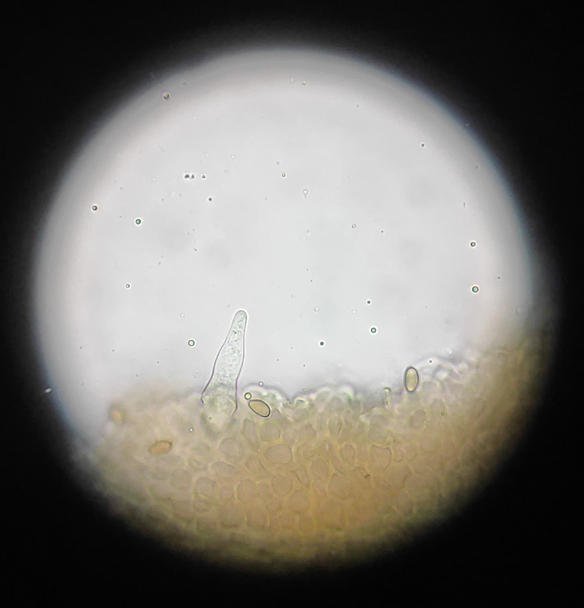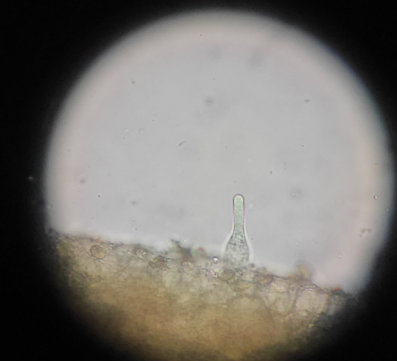 Also nochmal nachgelesen. Die Pileozystiden sollen für Agrocybe ungewöhnlich sein. Na gut, dann gucke ich eben die an. "Kurze bis lange fingerförmige Auswüchse" sollen die haben. Huthautschnitt zählt nun auch nicht gerade zu meinen Parade-Disziplinen. Beim 4. Schnitt habe ich dann endlich was zystidiges gefunden. Ich hoffe mal, das sind auch welche. Nur geht das doch nicht als fingerförmige Auswüchse durch?