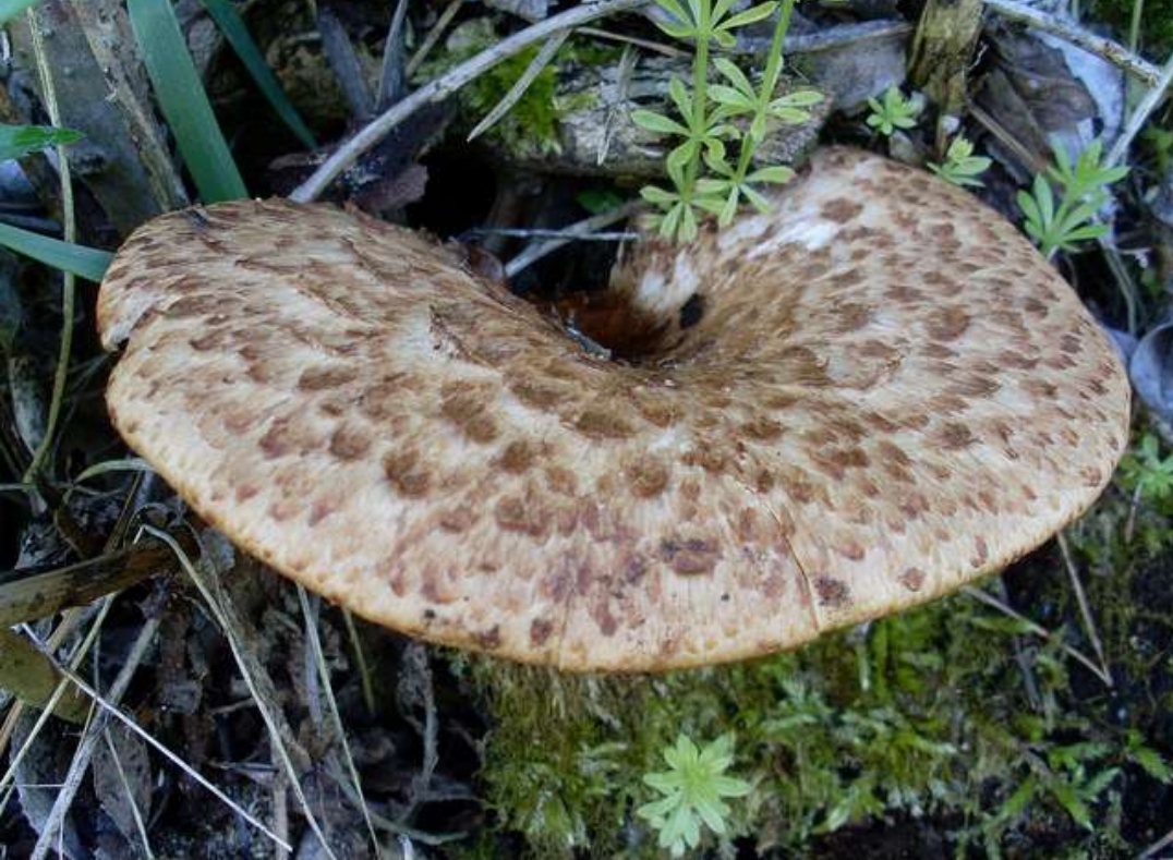 Polyporus squamosus hat anliegende, breite Schuppen.