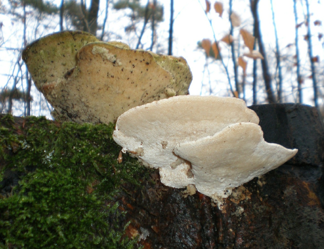 Trametes gibbosa (Buckel-Tramete) und Fomitopsis pinicola (Rotrandiger Baumschwamm).