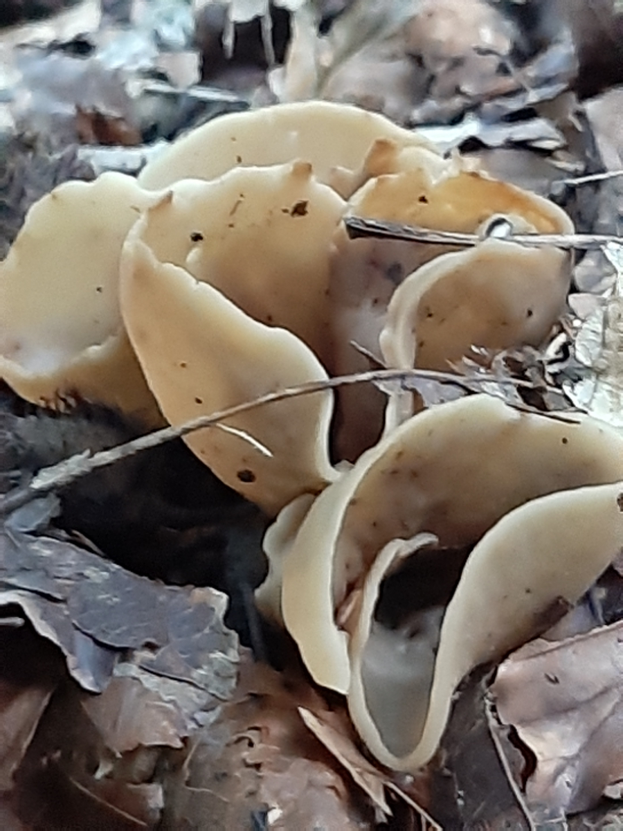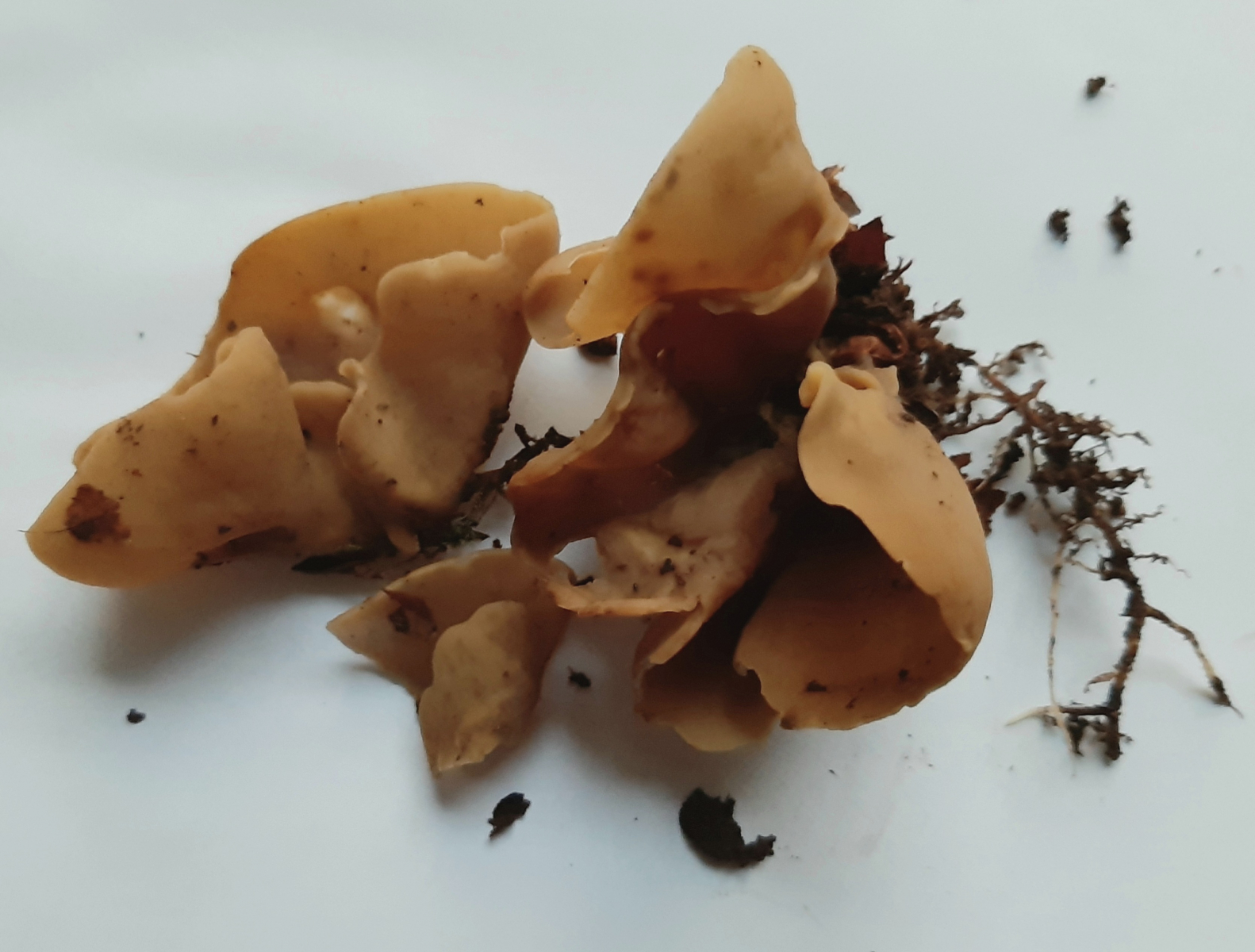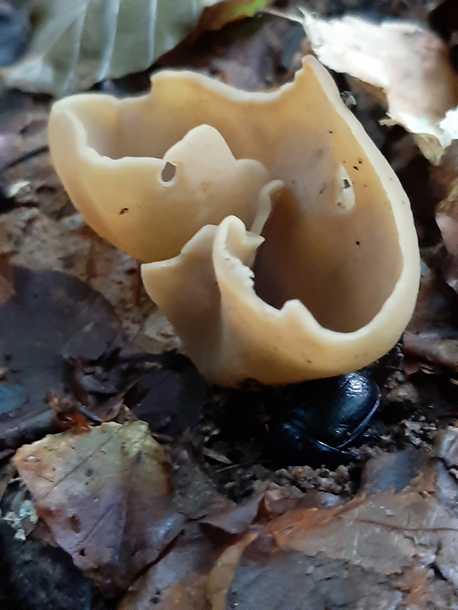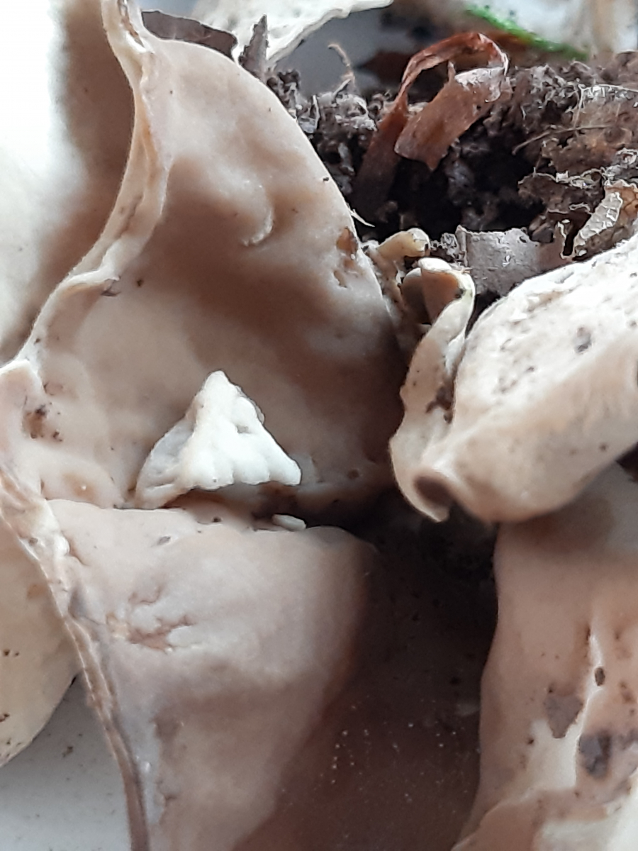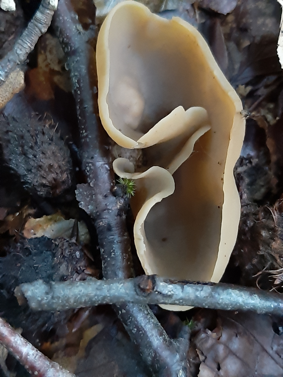 vor ein paar Tagen habe ich direkt auf den Boden in einem Buchenwald mehrere kleine geschlitzte, längliche und stiellose Fruchtkörper gefunden. Die Ascomyceten hatten eine Länge von 7 cm und eine Breite von 4 cm. Die innere haselnuss-braune Fruchtschicht fühlt sich glatt an die hellere ockerliche Außenseite etwas kleiig. Das Fruchtfleisch ist schnell brüchig und hat eine Breite von 3mm.