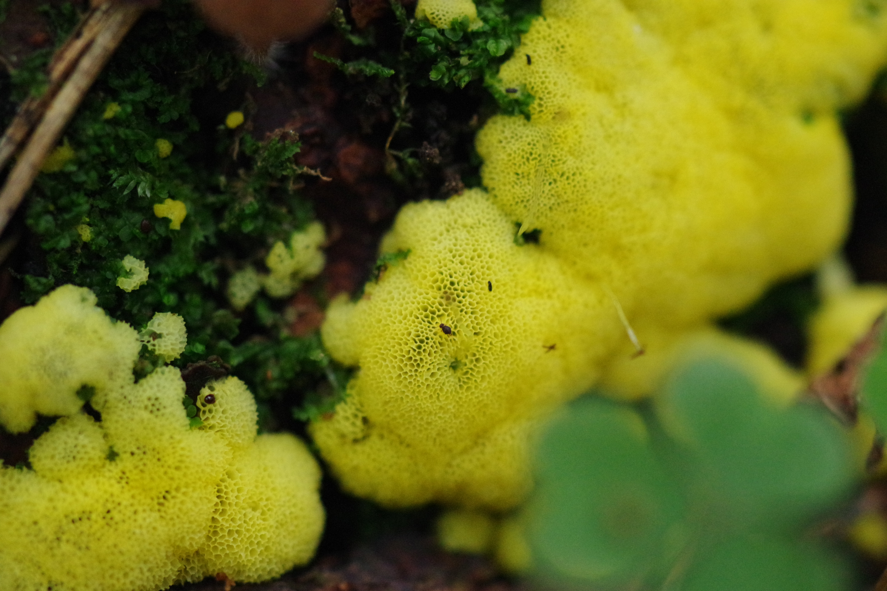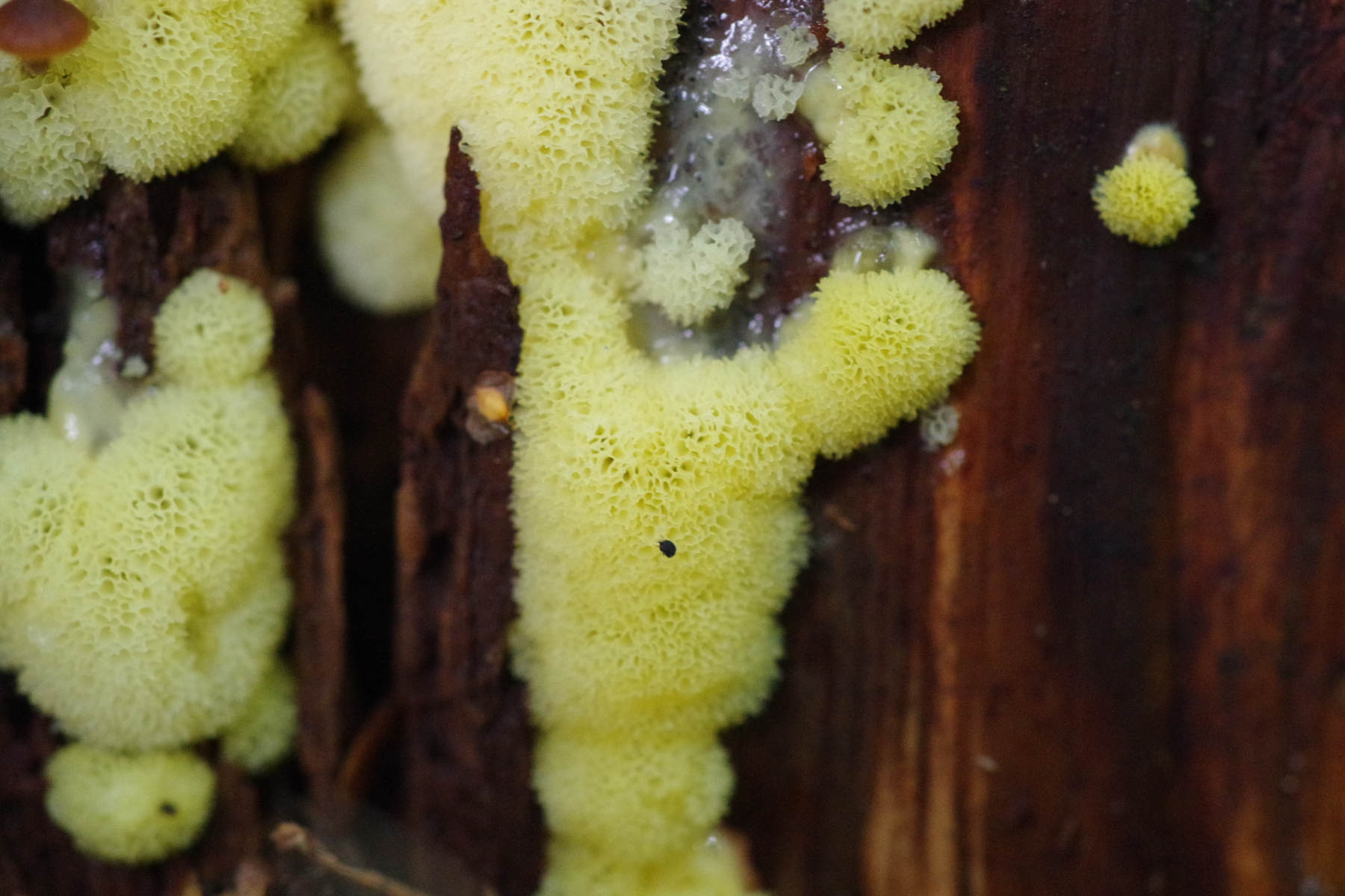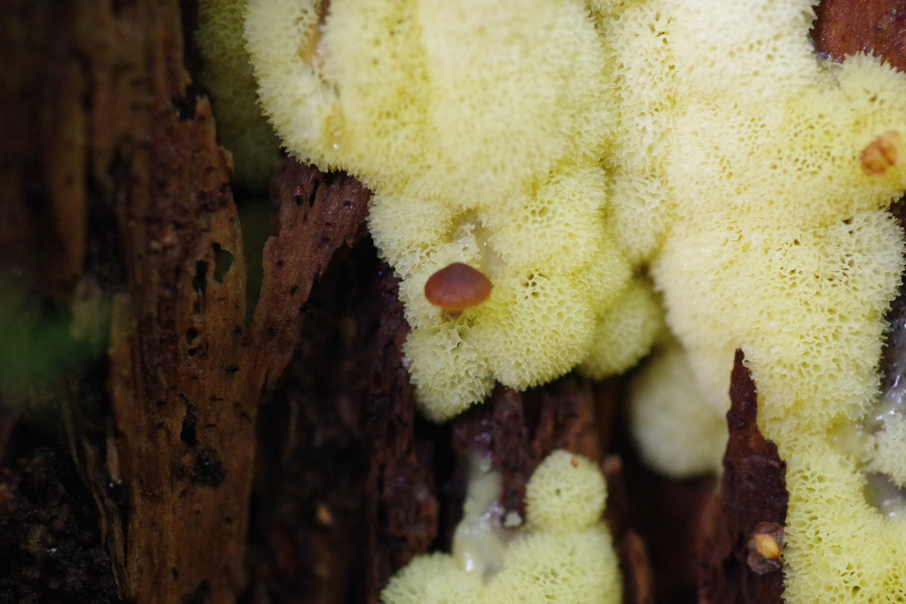 1) an Fichtenstubben habe ich derzeit an mehreren Stellen diesen gelben Schleimpilz, den ich als Ceratiomyxa fruticulosa var. poroides ansprechen würde. Teilweise am gleichen Stubben sogar mit der Normalvariante zusammen, die dann innen am morscheren Holz. Aber kann der denn auch gelb sein?