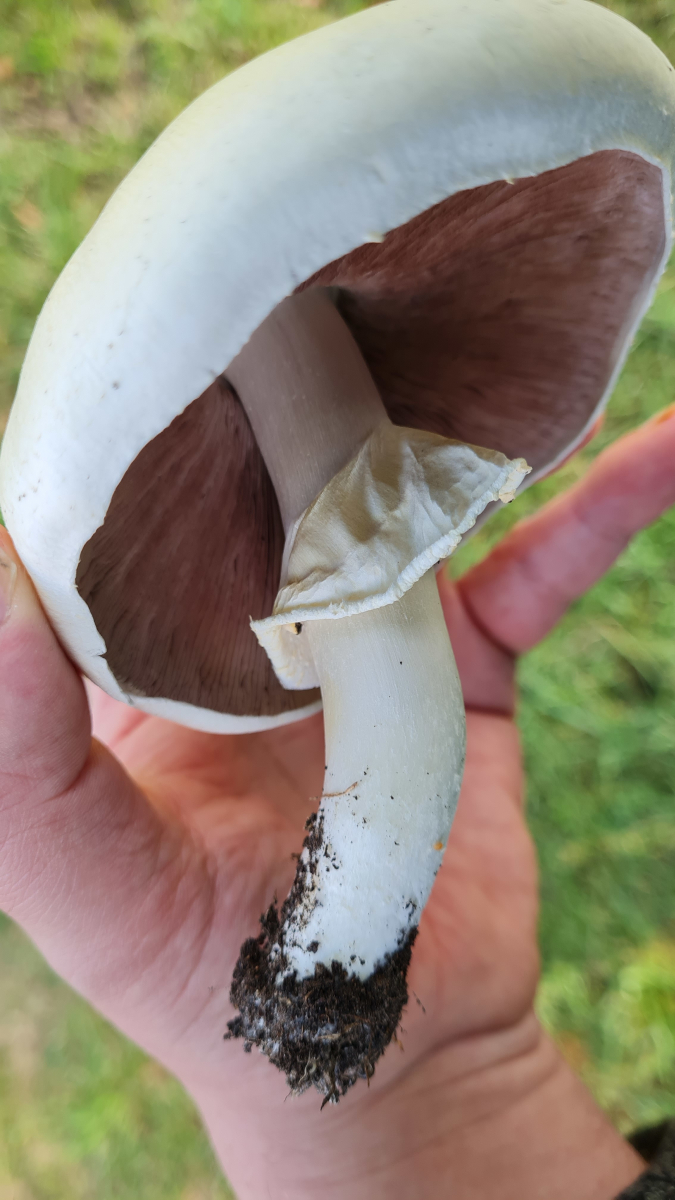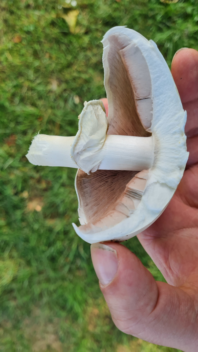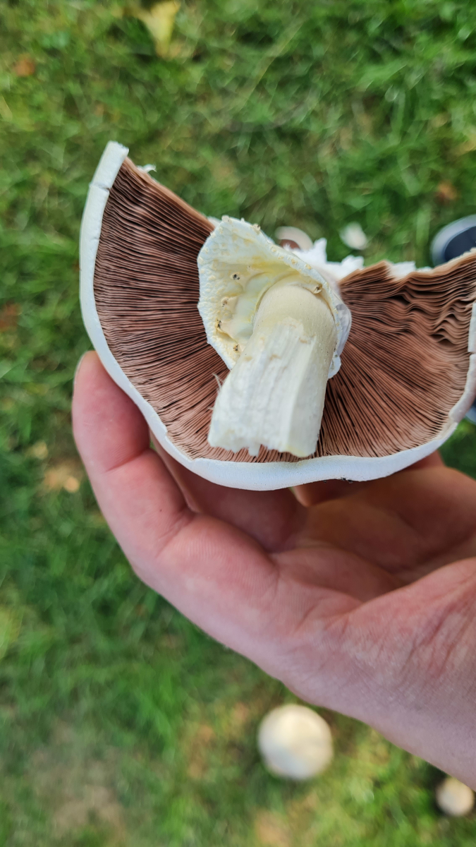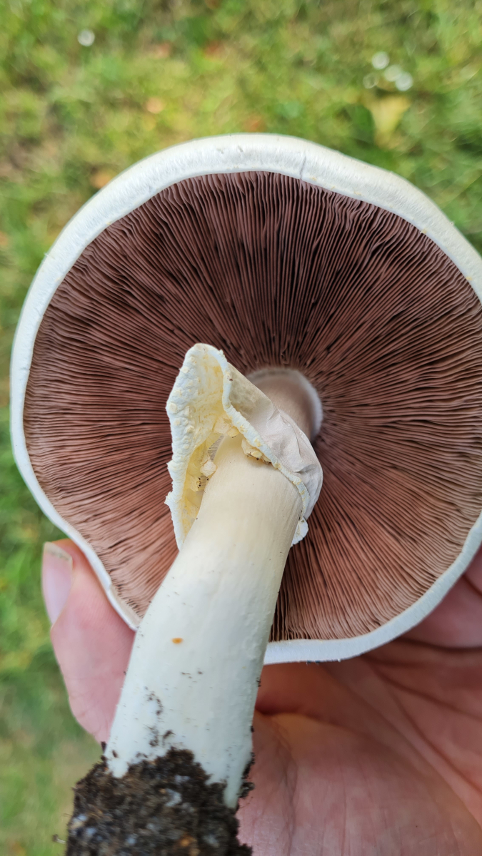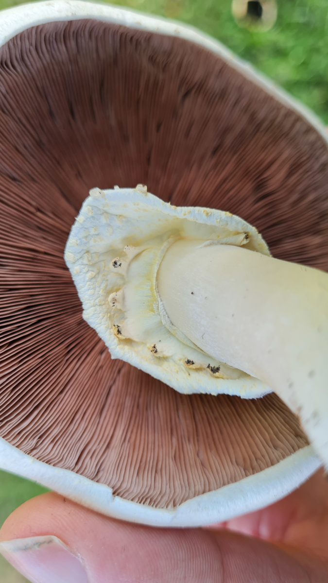 Ring: nach unten hängend, lappig, üppig, kreisförmige Form durch länge des Ringes versteckt und gelbschollig gefärbt. Verstecktes Zahnrad = Hinweis auf Schafchampignon?