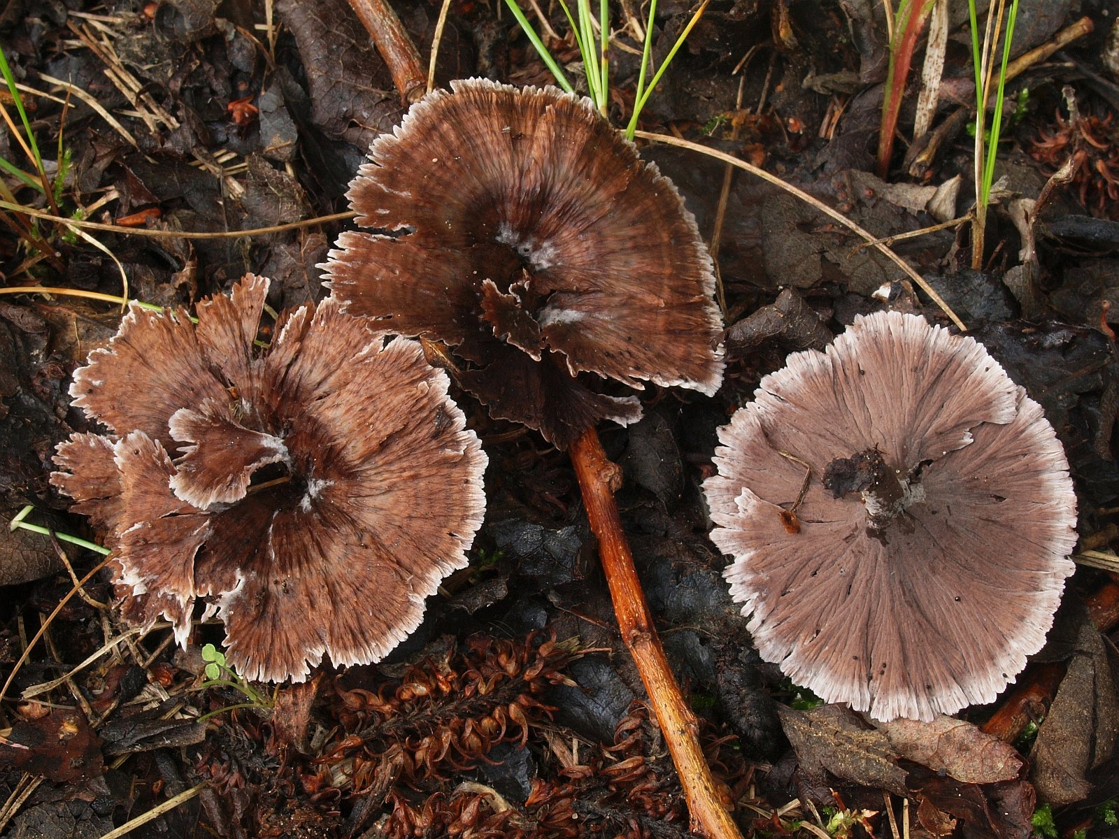 Viel dünnfleischiger als der Gewöhliche Erdwarzenpilz (Thelephora terrestris) und zentral gestielt