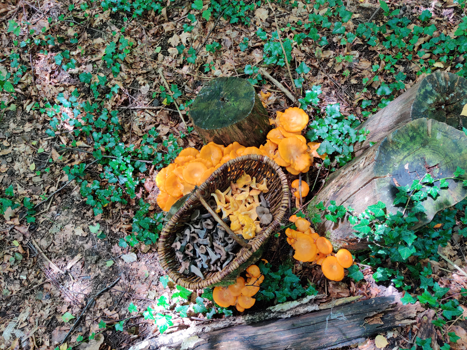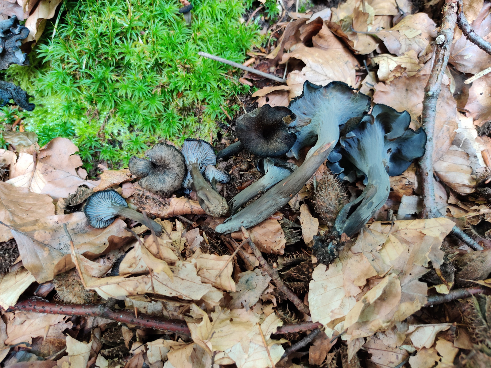 4. Nach einer längeren Durststrecke bin ich auf ein enormes Vorkommen an Totentrompeten (Craterellus cornucopioides) gestoßen, von denen die schönsten den Weg in mein Körbchen fanden.