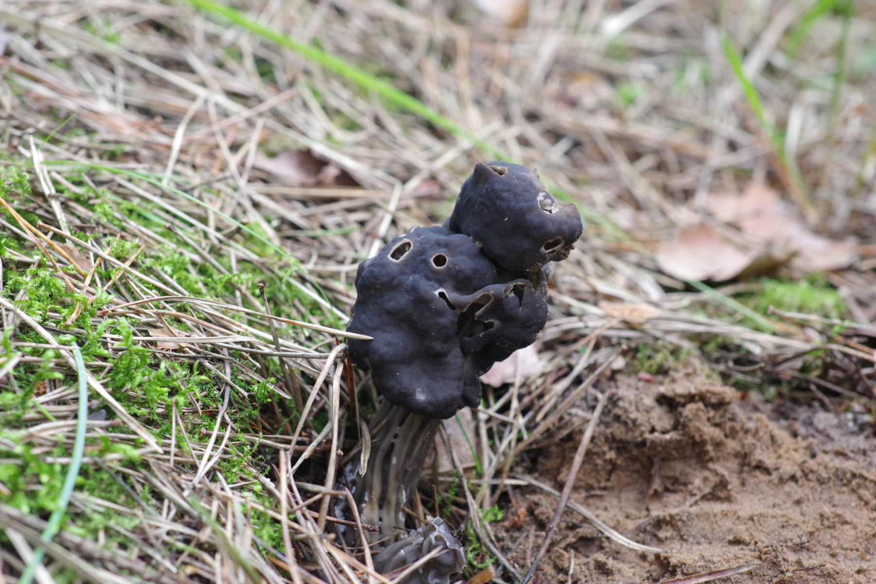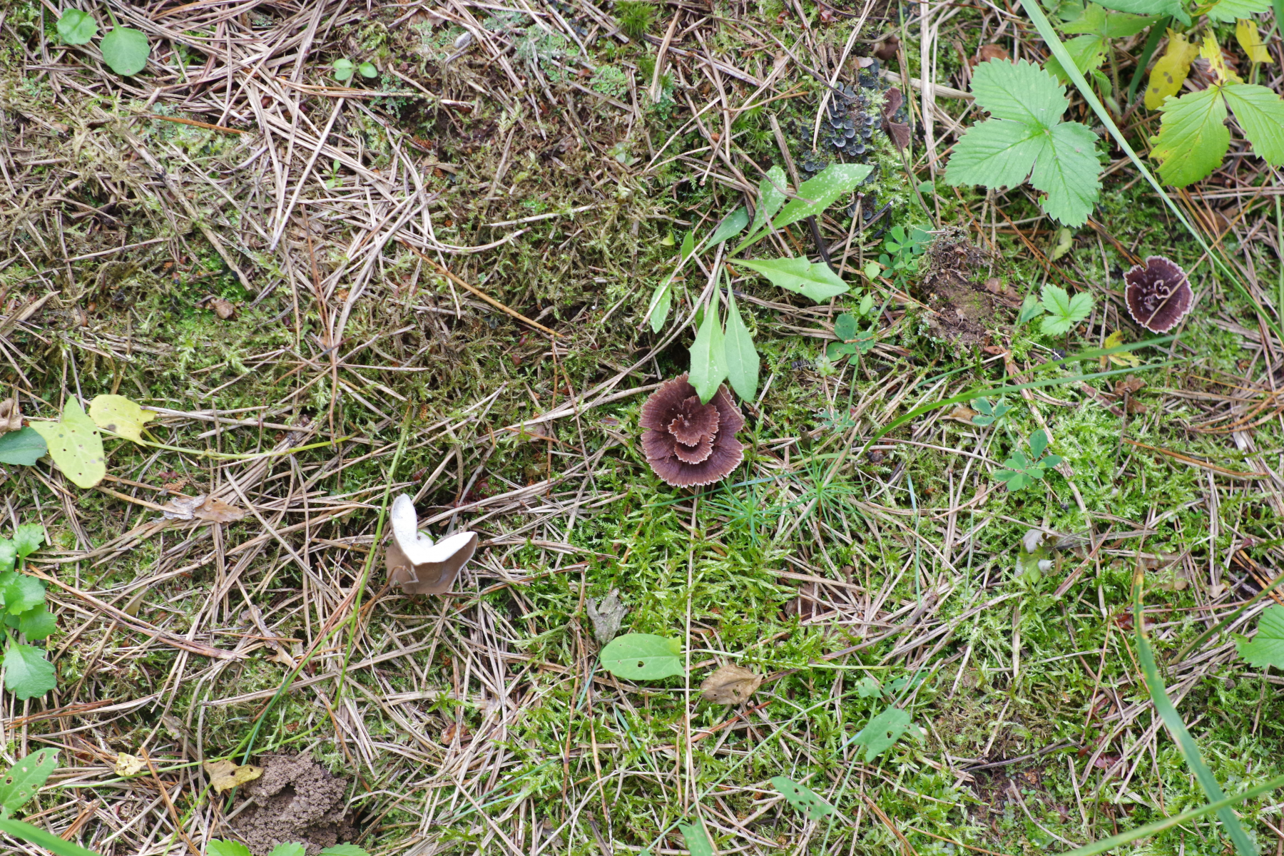 1) eine lichtere Stelle zwischen auf Brache von selbst gekommenen Kiefern (~25 Jahre), Sand/Kies zusammen mit Thelephora caryophyllea. Könnte vielleicht Helvella albella oder doch nur elastica sein.