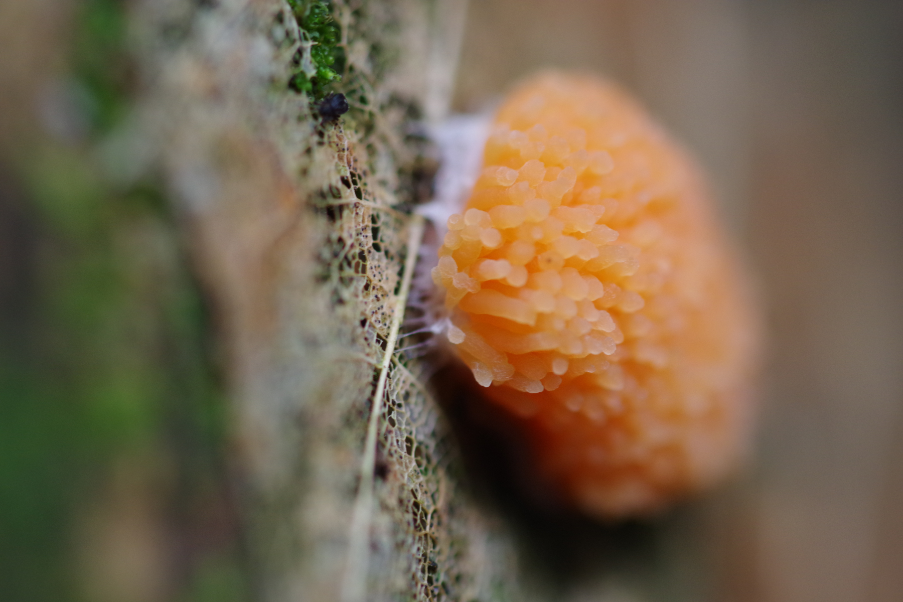 1) grell orange, lachsfarben, alt dunkelgrau, vermutlich Tubifera ferruginosa (vermutlich ein Erstfund, also jedenfalls bewusst)