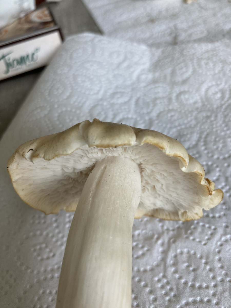 Die Lamellen sind auffallend wellig und ausgebuchtet angewachsen, jedoch an etwa 1/4 des Stieles herablaufend. Ist an der Stelle wohl einfach komisch gewachsen.