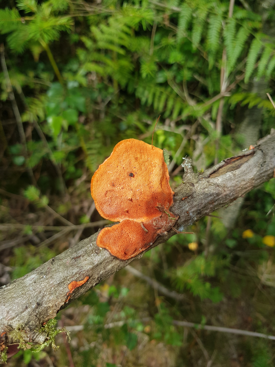 Der nächste Pilz ist wohl eine Zinnoberrote Tramete (Pycnoporus cinnabarinus)