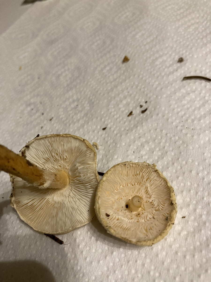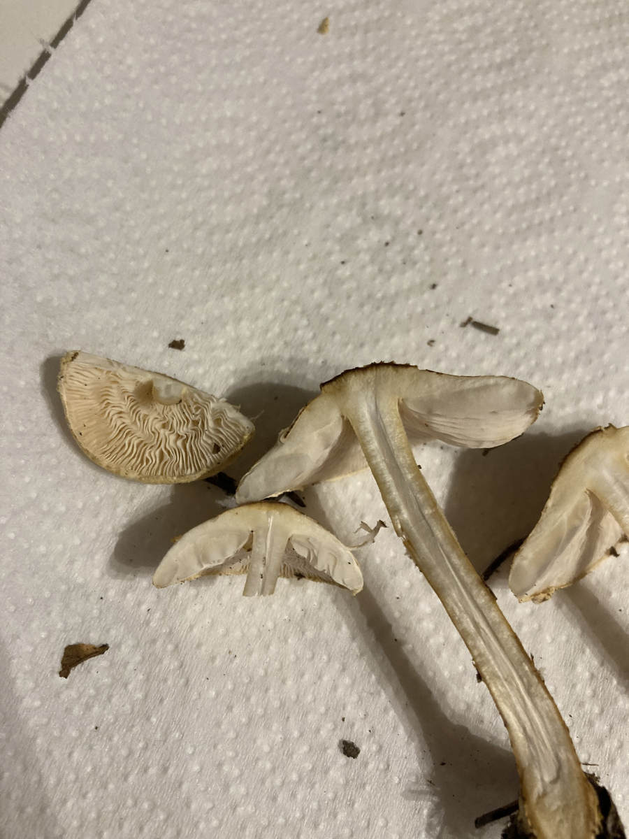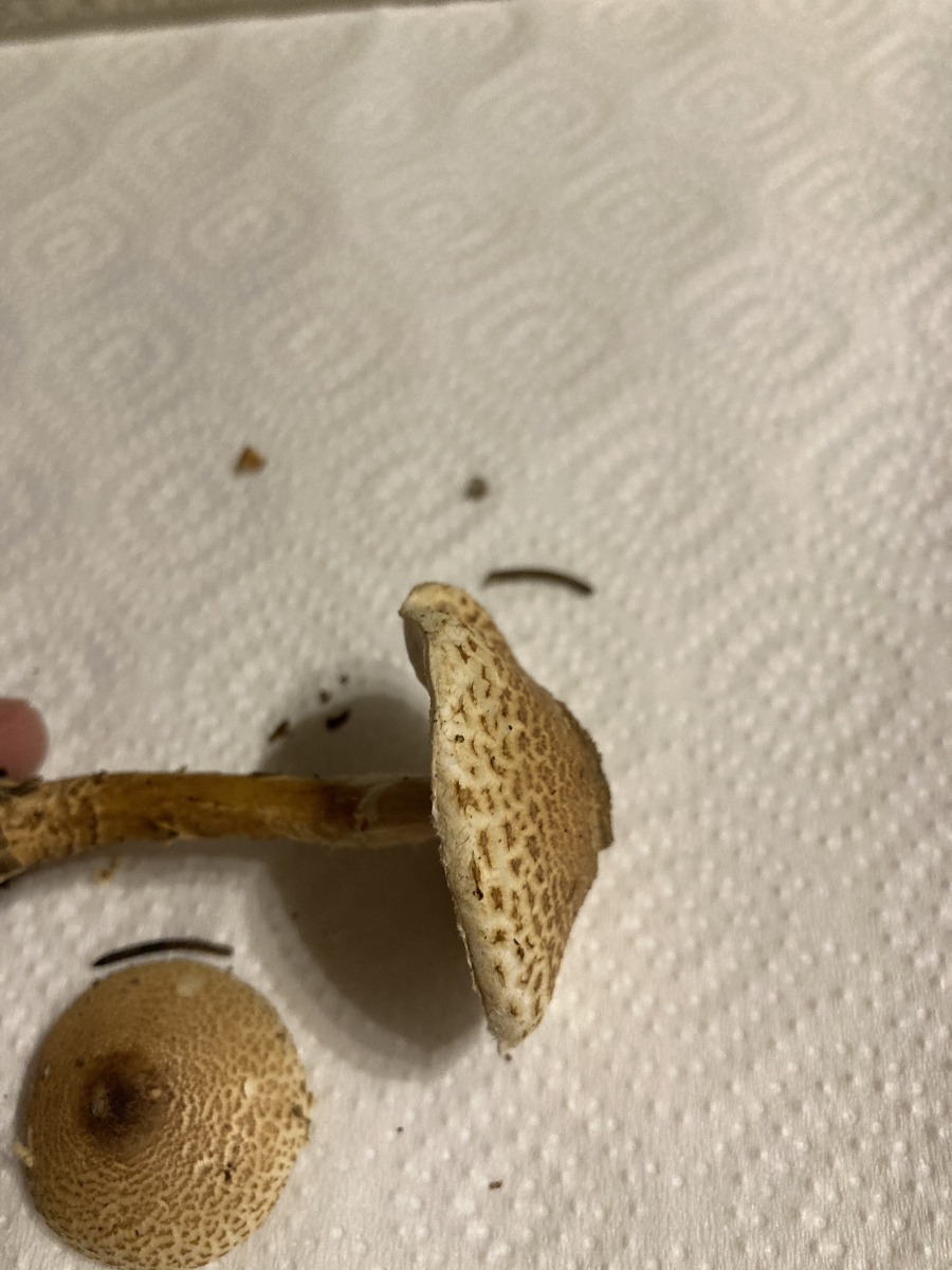 Aber noch ein ganz anderes Problem: diese bei Kunstlicht gemachten Aufnahmen verfälschen die vorhandenen Farben des Pilzes. Z. B. kann man hier nicht einschätzen, ob der Pilz im Wesentlichen gelb, orange, braun oder vielleicht rosa ist. Wenn man nicht einmal das weiß, kommt man nicht weiter, als dass es wohl ein Schirmling ist. Mache bei Bestimmungsanfragen also künftig Aufnahmen bei Tageslicht, das wird das Auskunftsergebnis enorm verbessern.