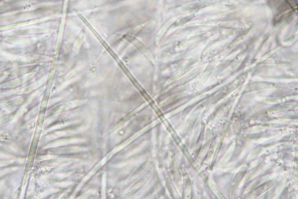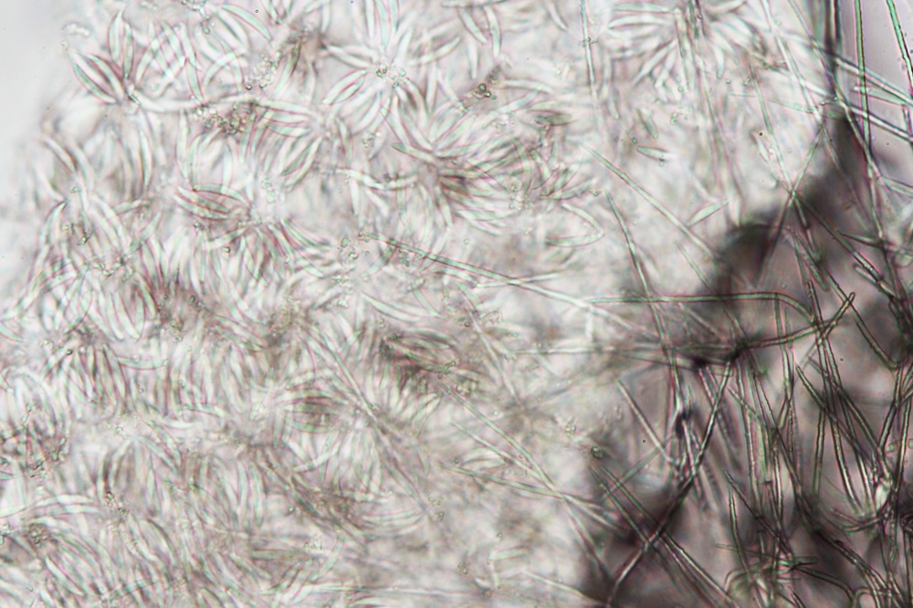 Die Haare sind weiß und unseptiert. Dagegen sind die Konidien ganz normal gebogen und mit jeweils einem Anhängsel am Polende versehen.