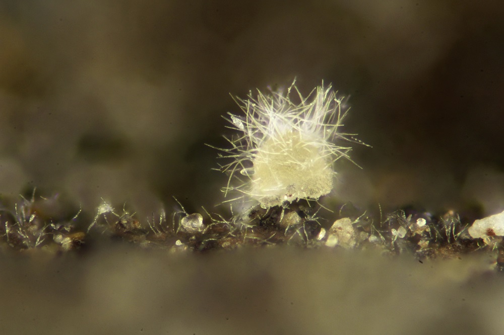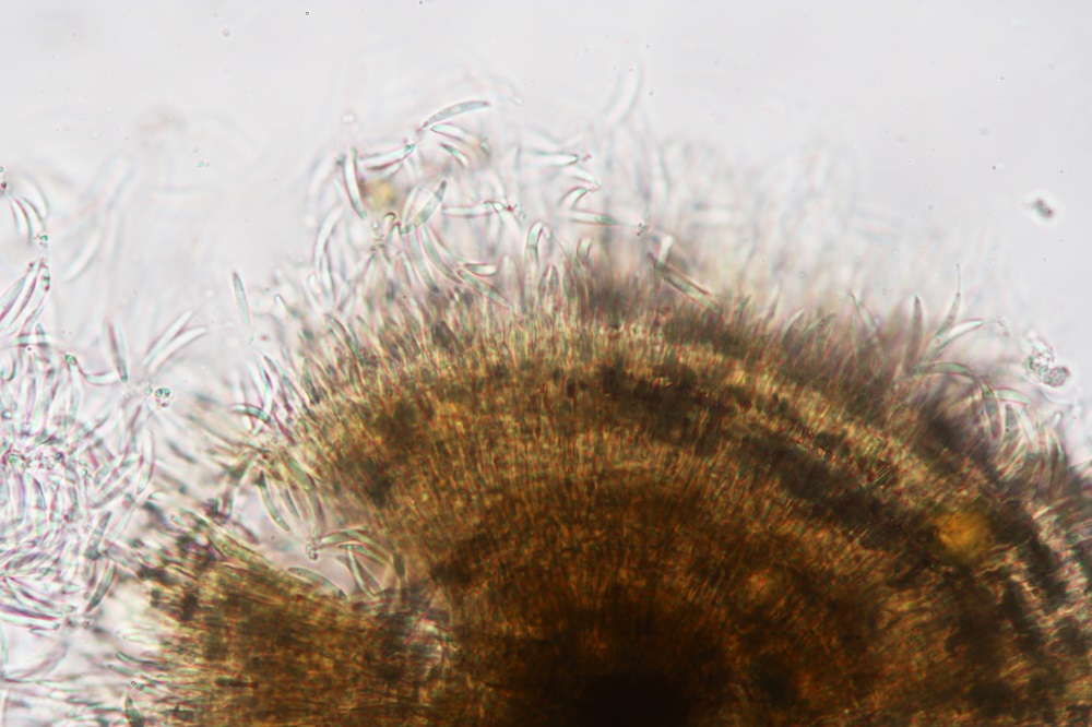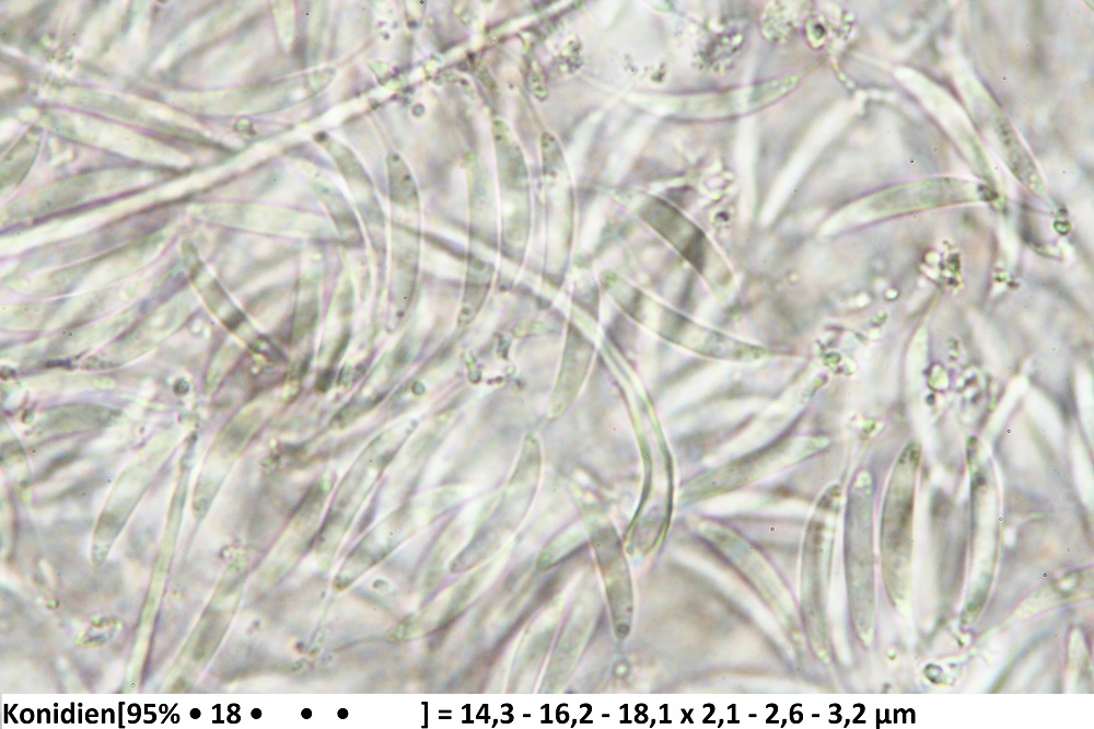Die Haare sind weiß und unseptiert. Dagegen sind die Konidien ganz normal gebogen und mit jeweils einem Anhängsel am Polende versehen.
