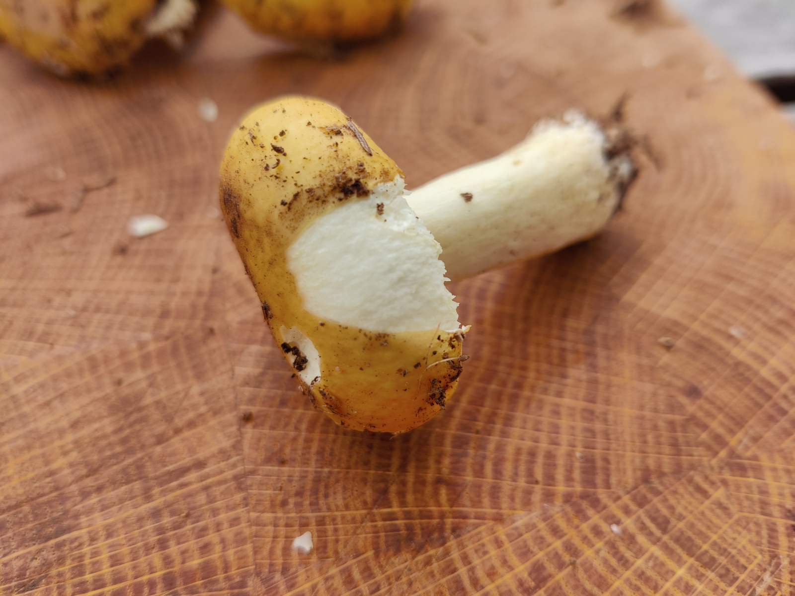 Huthaut ist gelb und bis zur Hälfte abziehbar. Der Stiel ist weiß mit gelblichen Flecken. Die Lamellen sind weiß, erscheinen aber irgendwie gelblich. Das Fleisch ist reinweiß.