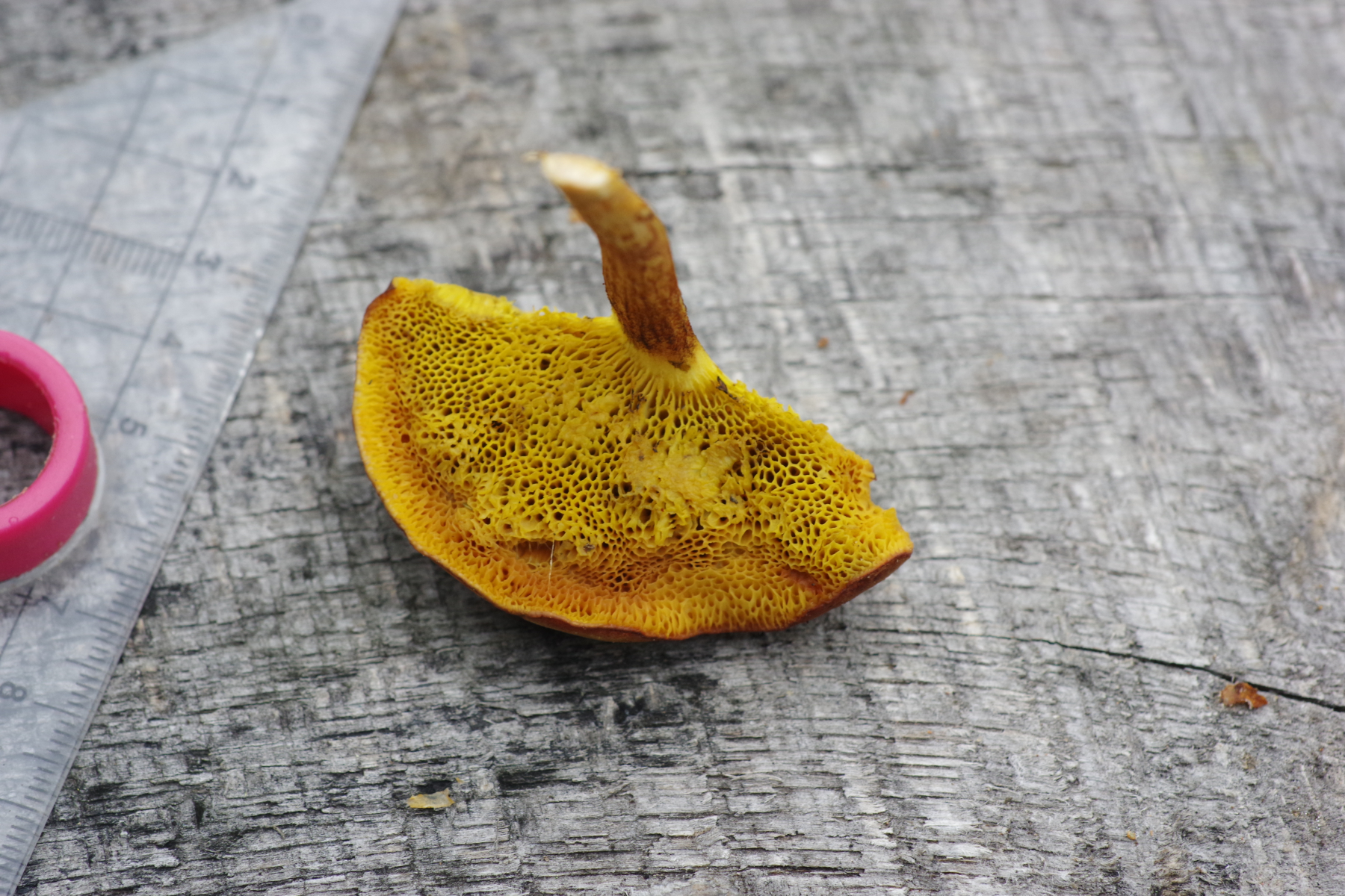 Standort zusammen mit Fichtensteinpilzen etc. Durchmesser 6 cm. Hut samtig, ledrig, matt trotz nächtlichem Regen, mittig leicht ins Rötliche gehend. Röhren gelb. Fleisch weiß, ohne Verfärbung. Geruch und Geschmack unauffällig, angenehm.