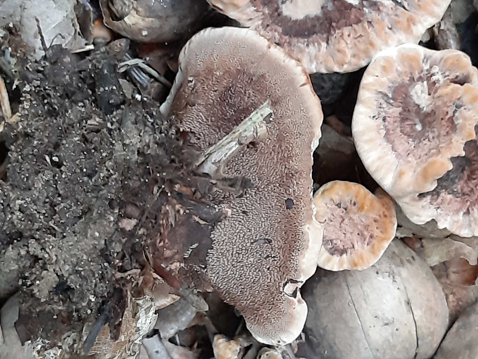 Ende Juli hatte ich am Wegesrand (eine Seite Eiche, Buche gegenüber 5 Meter Entfernung Kiefer) das erste mal diese kleinen Korkstachelinge gefunden. Der rotbraune, zonierte, unebene Hut hat einen Durchmesser von bis zu 3 cm und hat einen helleren abgesetzten Rand. Von oben sahen sie aus wie kleine, gleichmäßige Rosetten mit einer flachen, trichterförmigen Vertiefung in der Mitte. Die stachelige Fruchtschicht hatte einen bräunlichen Ton und lief an dem mittigen, kurzen Stiel herab.