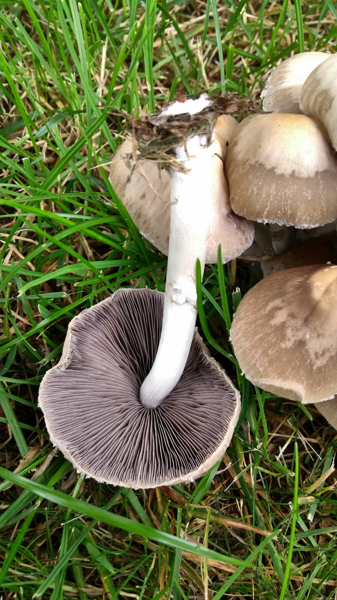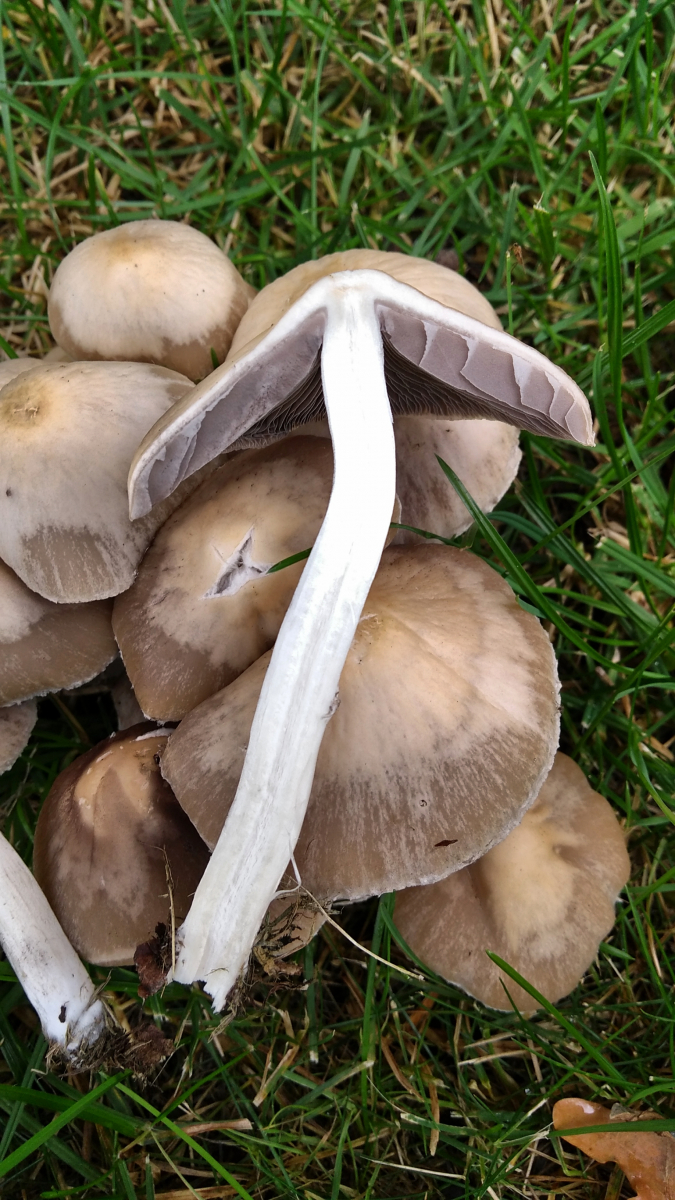 ich habe gestern eine Gruppe büschelig wachsender Fruchtkörper gefunden, unter einer Eiche auf einer Wiese. Unter dem gleichen Baum fand ich im Juni bereits eine Gruppe Behangener Faserling (Psathyrella Candolleana). Die scheinen mir aber bei dem jetzt gefundenen Pilz überhaupt nicht in Frage zu kommen. Dagegen spricht für mich der Ring, dessen Reste sich deutlich am Ring zeigen. Leider habe ich aber keine sinnvolle andere Idee. Die Hüte haben etwa 8-10 cm Durchmesser, und sind deutlich hygrophan. Der Stiel ist bis zum Ring deutlich gerieft, bricht faserig und im Anschnitt von der Basis aus zu 2/3 hohl. Die Lamellen sind ausgebuchtet angewachsen, recht eng stehend und gegabelt. Ich meine am Stiel eines Fruchtkörpers dunkelbraunes bis schwarz/graues Sporenpulvers gefunden zu haben. Geruchlich konnte ich nichts spezifisches erkennen. Heute waren die Pilze an der Stelle leider komplett mutwillig zertreten (ein Thema für Der "ich krieg' ne Krawatte wenn..."thread ), so dass ich keinen Fruchtkörper für ein Sporenabdruck mitnehmen kann. Der Weißabgleich meiner Smartphone-Kamera ist leider grottig, so dass die weißen Stellen des Stiels auf den Fotos z.T. überbelichtet sind.