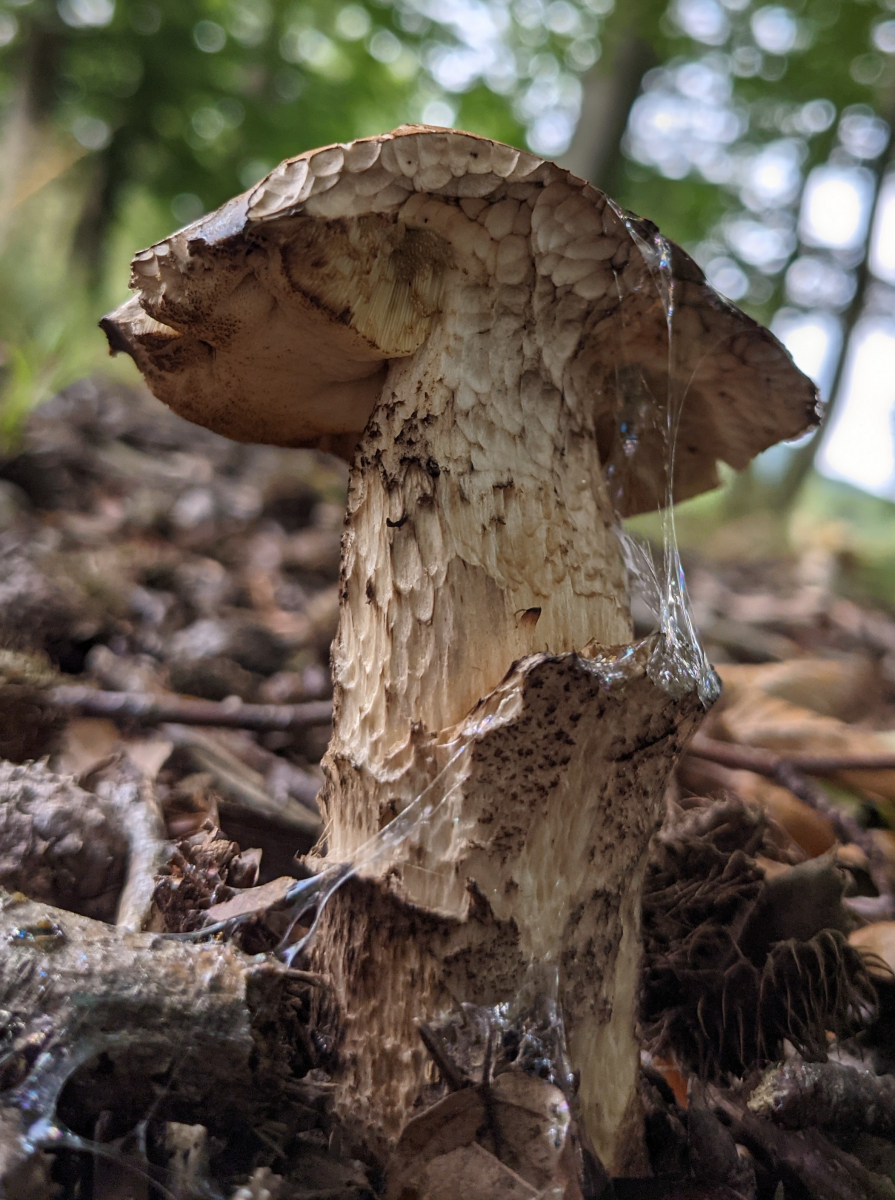Es handelt sich um einen junges Exemplar und zwei deutlich zerfressene. Ich vermute aber, dass es sich um die gleichen Pilze handelt, sie wuchsen in unmittelbarer Nähe. Fundort ist ein lichter Wald mit überwiegend (Hain-?)Buchen.