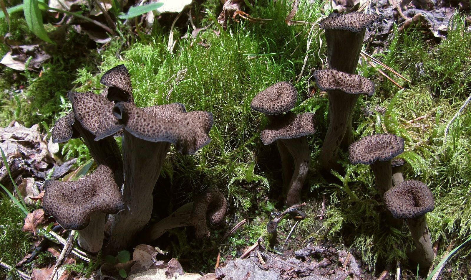 Aber auch Craterellus cornucopioides (Herbsttrompete) wächst hier auf +/- saurem Untergrund: