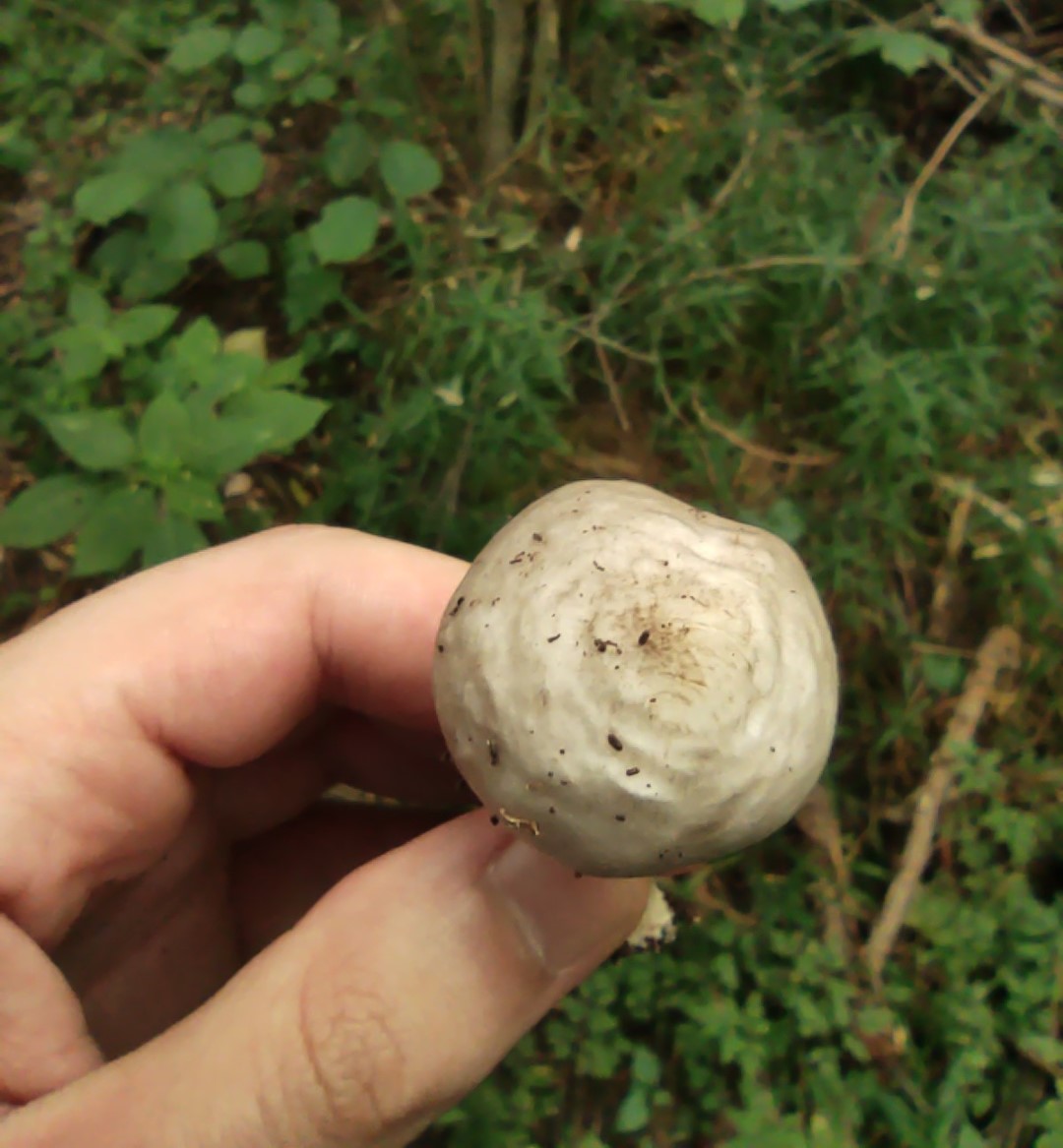 Den hier fand ich heute also auf Holzresten am Boden wachsend, müsste Laubholz gewesen sein. Mittelgroßer silbrig-grauer Dachpilz auf Laubholz, Hutmitte leicht braunschuppig, Geruch schwach nach Rettich.