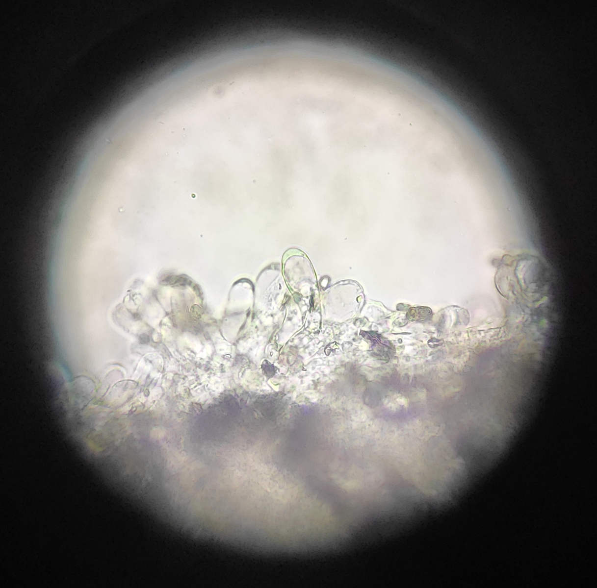 Öhm. Naja. Ma gucken. Ich zupfe mir drei Stückchen mit der Pinzette aus der Huthaut und suche. Ich finde mehr oder weniger nix. Müsste aber zumindest "pileipellis a cutis" sein denke ich.