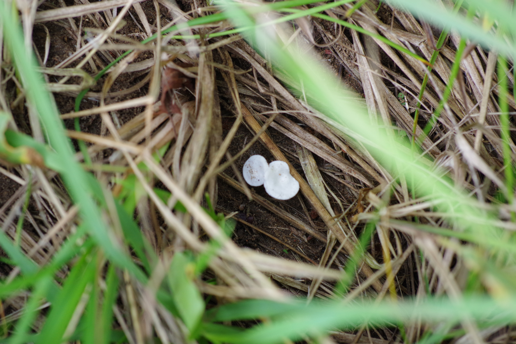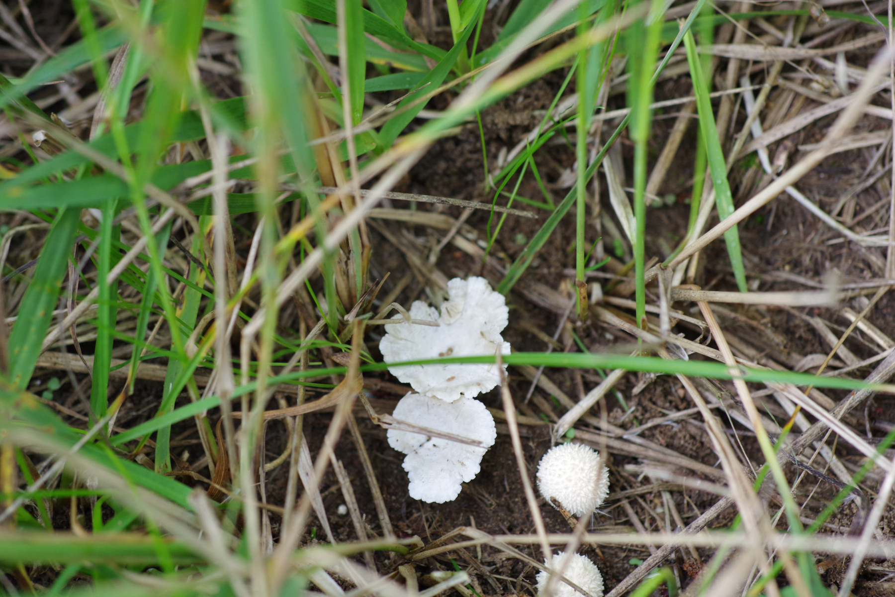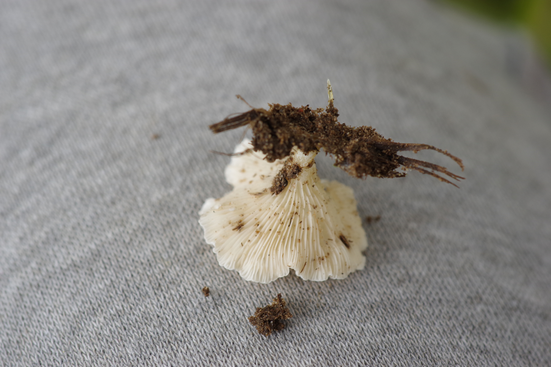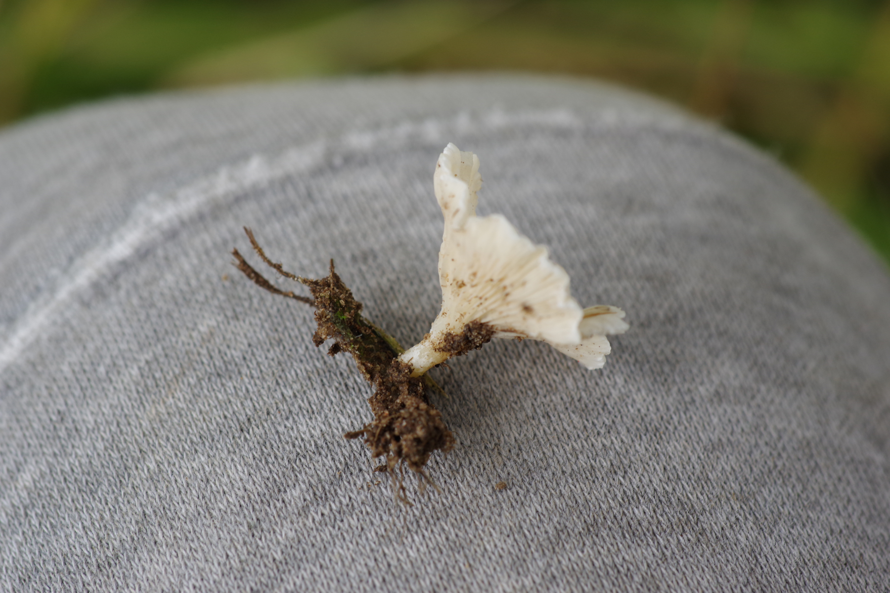 auf der Wiese/Weide gibt es derzeit, zumeist zwischen hohem Gras, zerstreut diesen kleinen weißen Pilz, der, soweit geprüft, auf vorjährigen Grasresten wächst. Bis zu 25 mm im Durchmesser. Geruch unauffällig, Geschmack widerlich mit einer leicht scharfen Note.