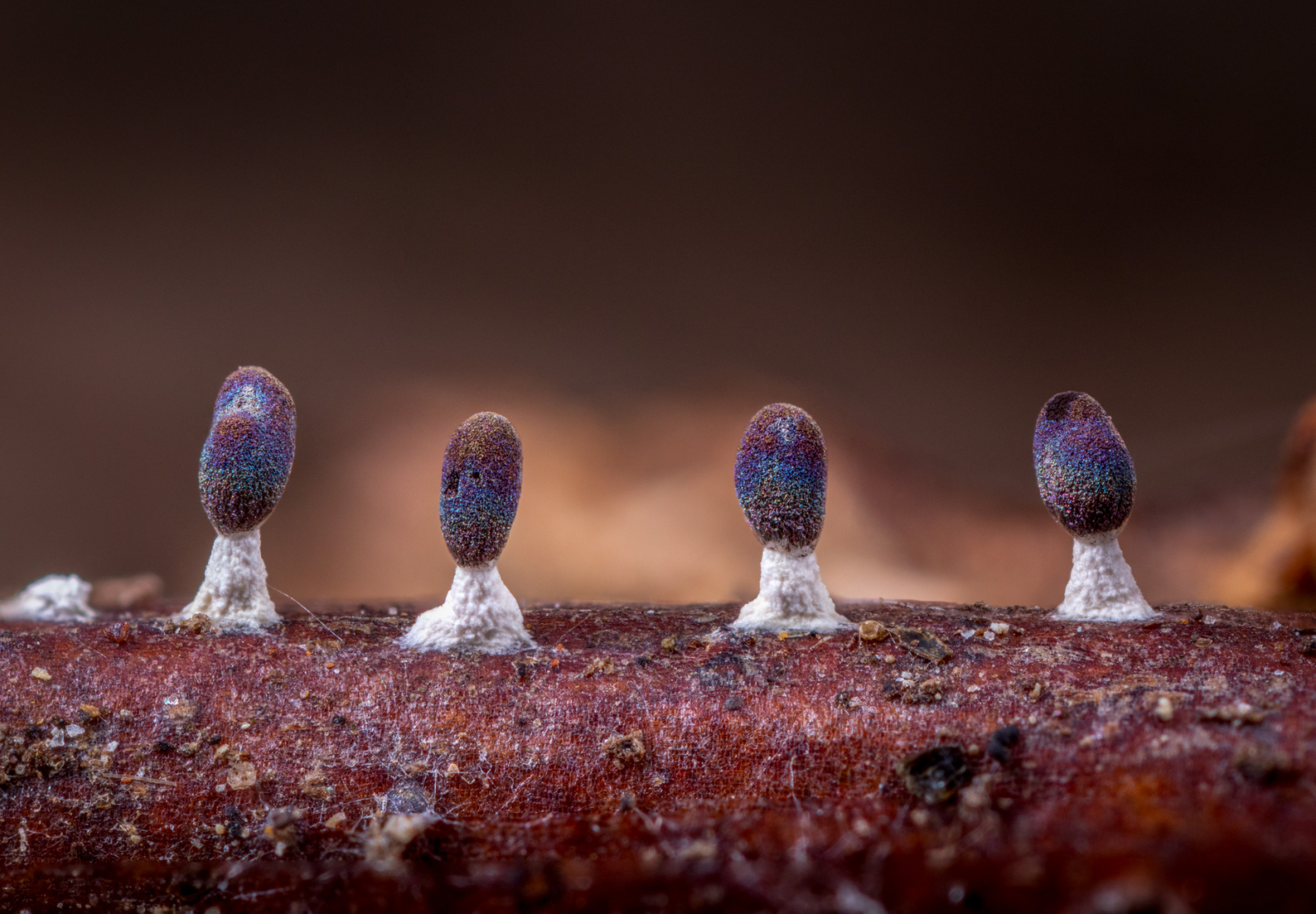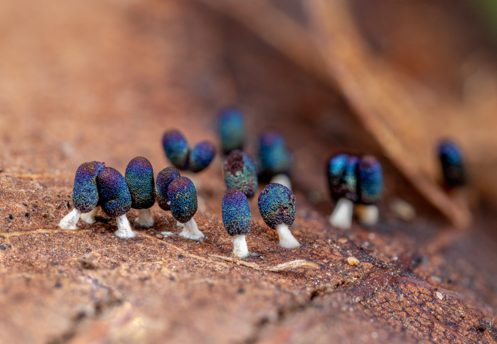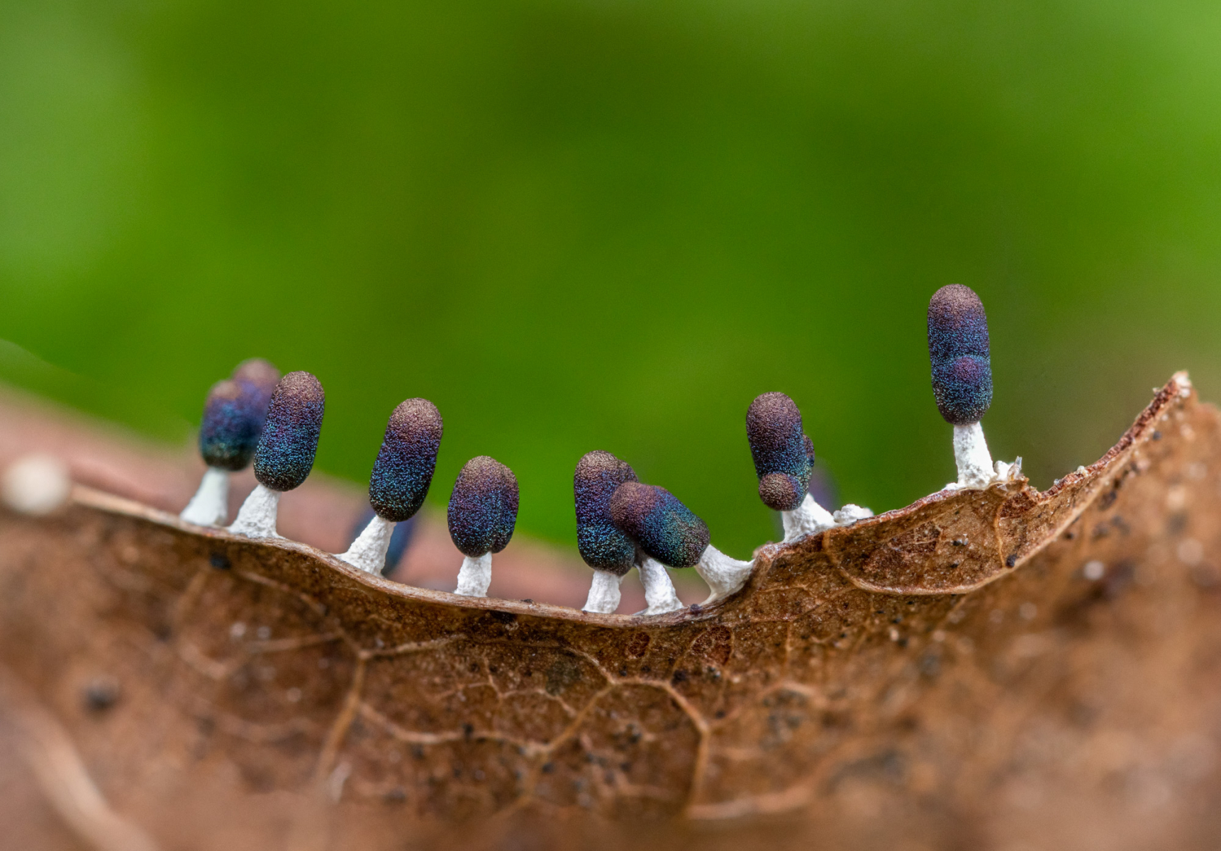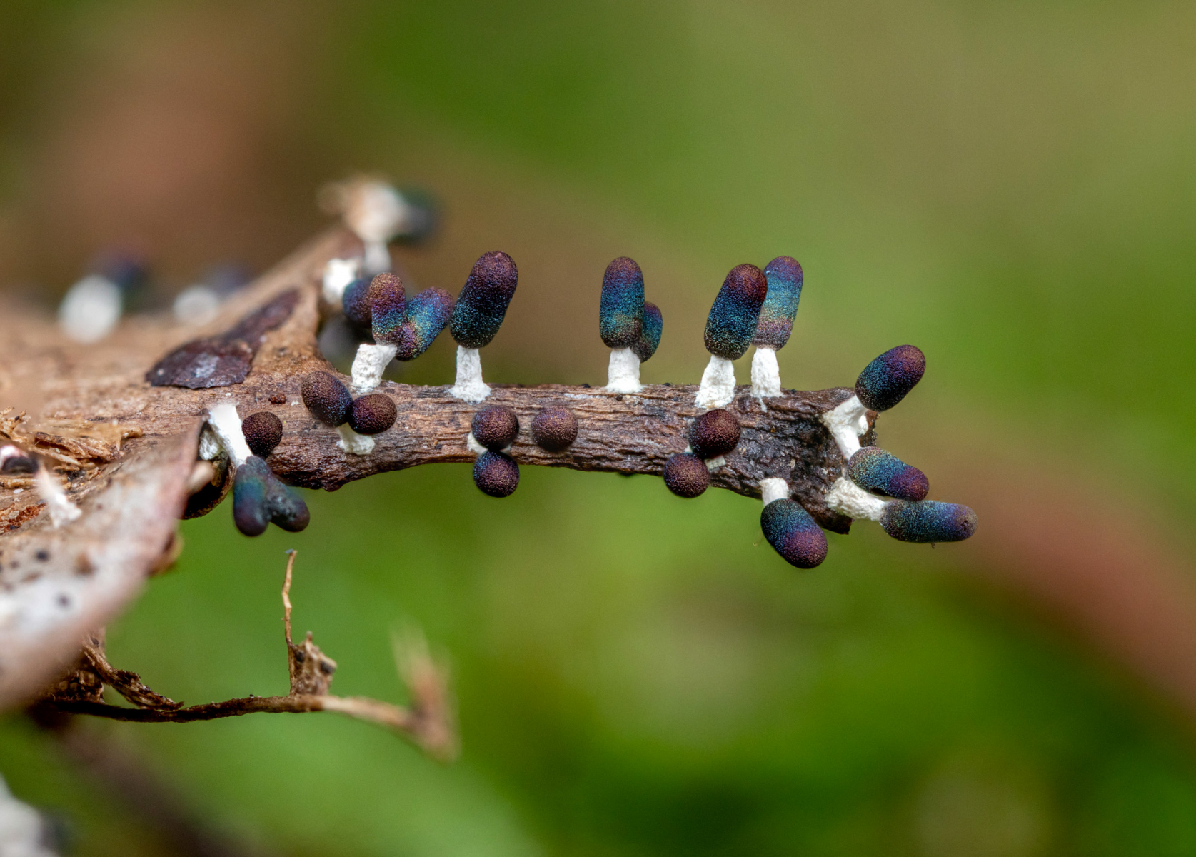 Die Sporocarpien waren über mehr als 1 m² verteilt und wuchsen auf Stängeln, Blättern und auch auf einer Drosselfeder!