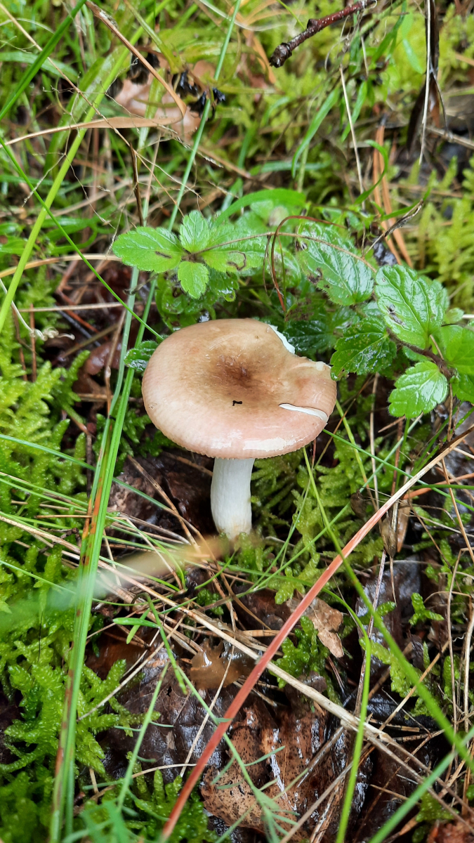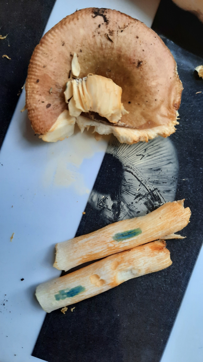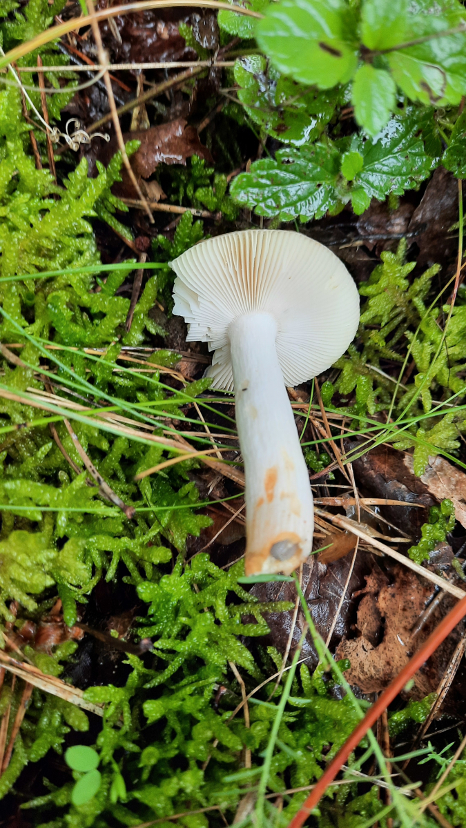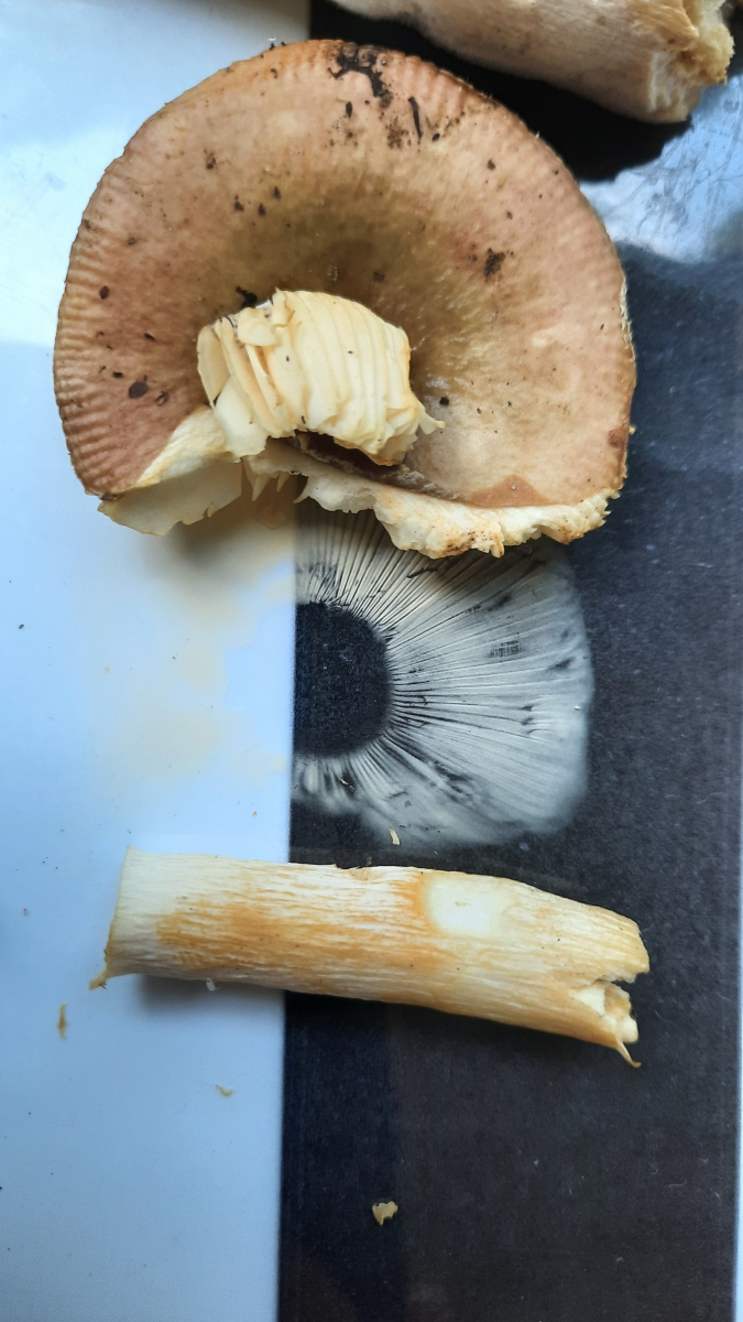 gestern habe ich nordwestlich von Berlin einen einzelnen Täubling gefunden, den ich eigentlich hoffte bestimmen zu können, der sich aber nicht in allen makroskopischen Merkmalen einer Art zuordnen lässt. Ich tendierte zunächst aufgrund leuchtend gelber Flecken an Verletzungen am Stiel zum Gelbfleckenden T. (R. luteotacta). Heute, nach Feststellung der Sporenpulverfarbe (creme/hellocker, auf jeden Fall nicht weiß), kam ich auf den Schwachfleckenden T. (R. persicina). Der sollte aber keinen gerieften Rand haben, keine abziehbare Huthaut und eher auf kalkhaltigen oder neutralen Standorten wachsen (Fundort sicherlich sauer).