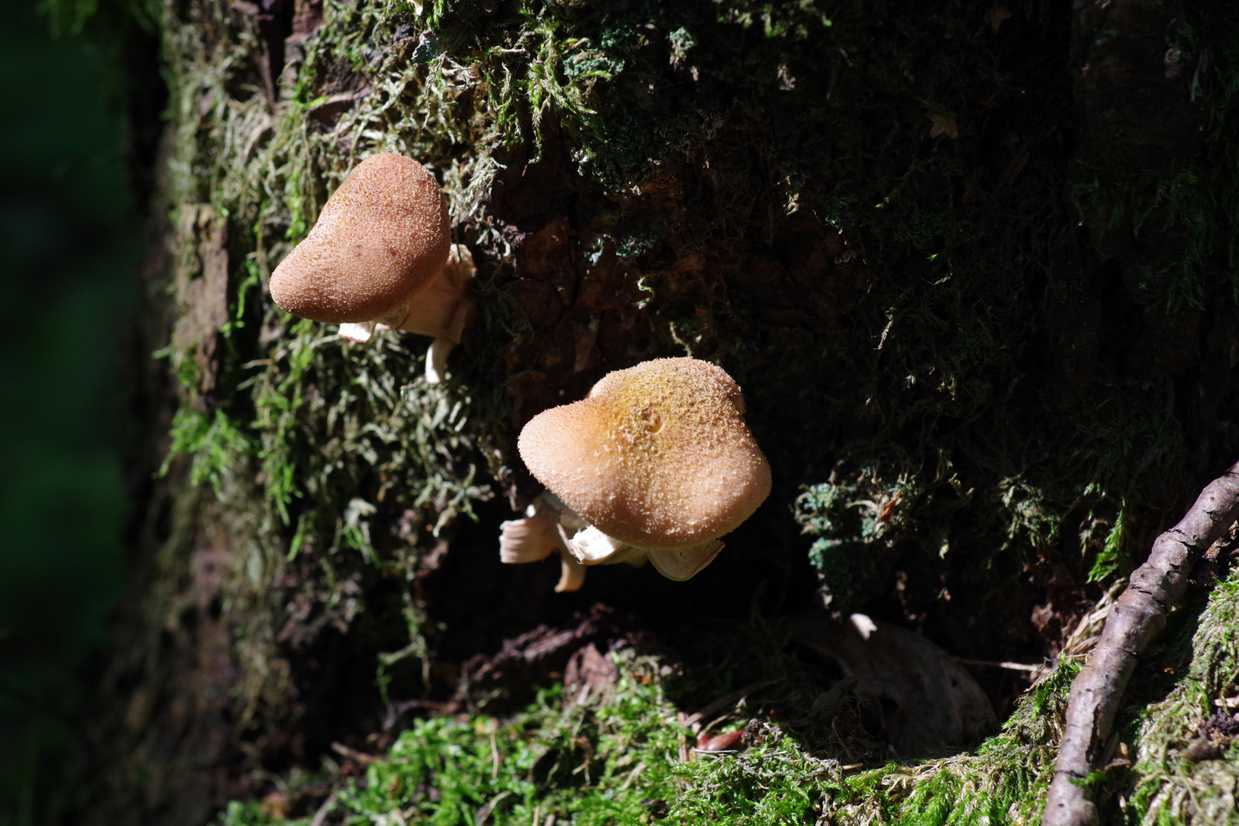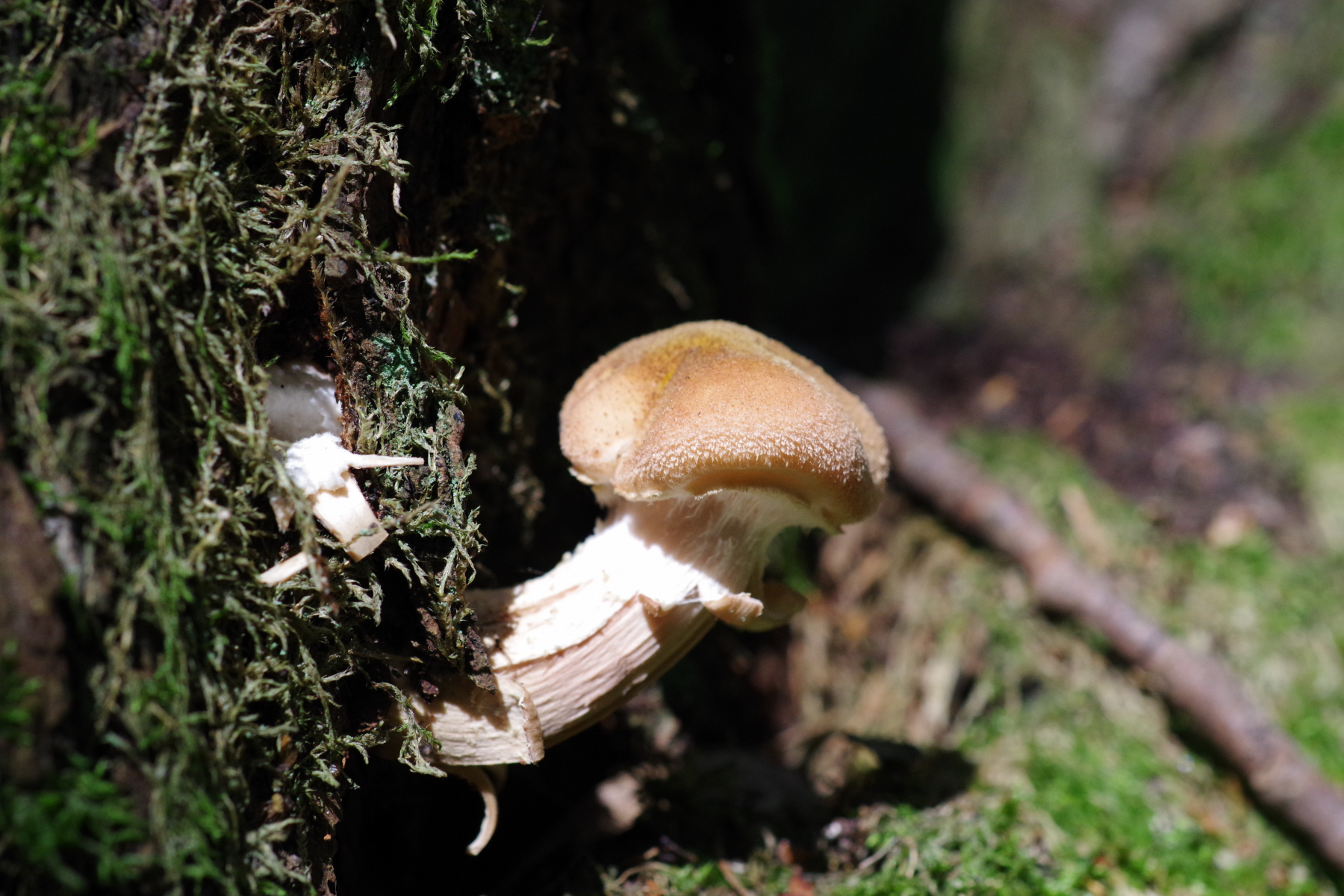 4) An toter Schwarzerle ein junger Lamellenpilz, wohl eine Pholiota