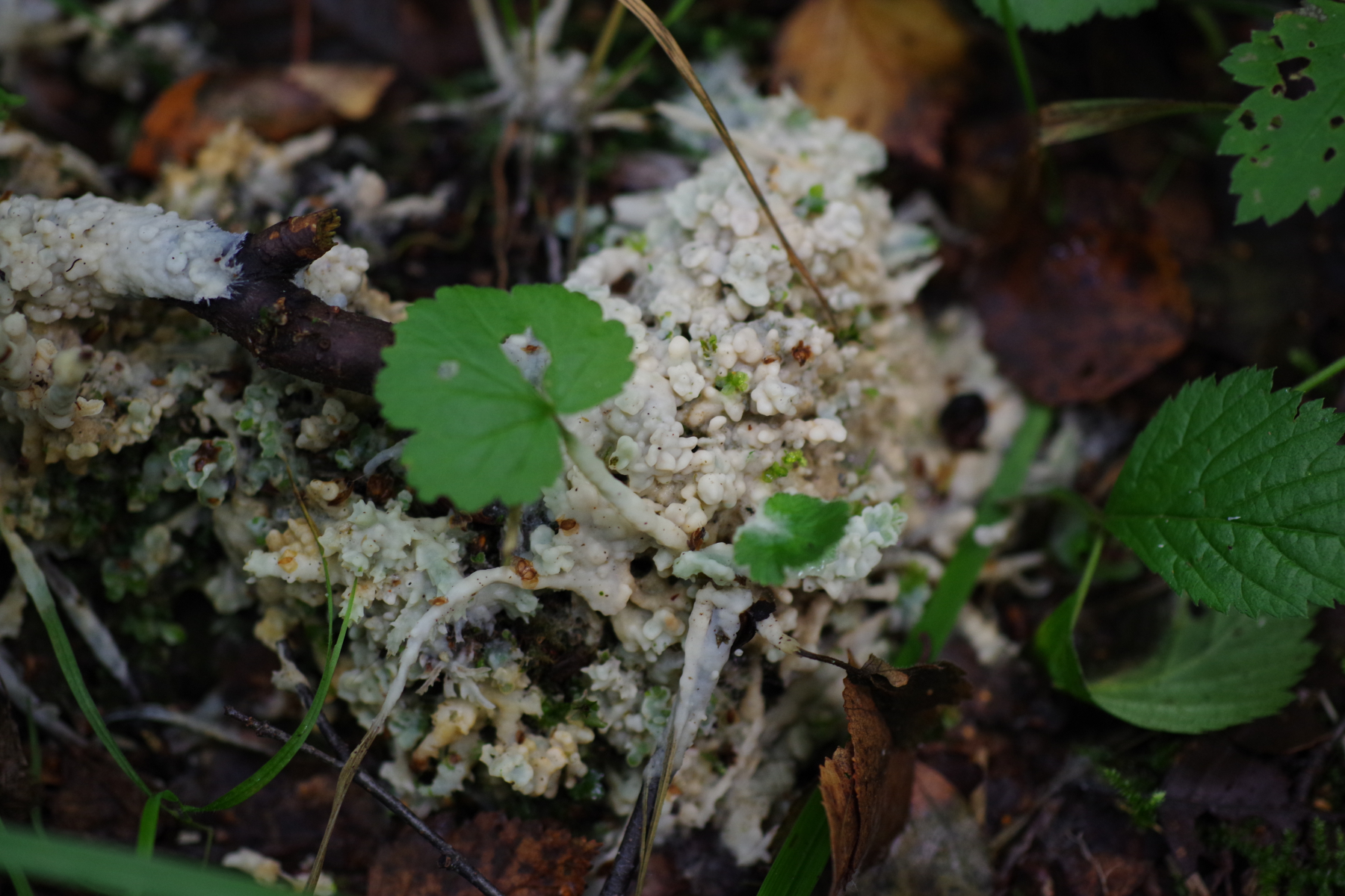 7) Ein weißlich beiger Schleimi, der Moos und Zweige überwuchert