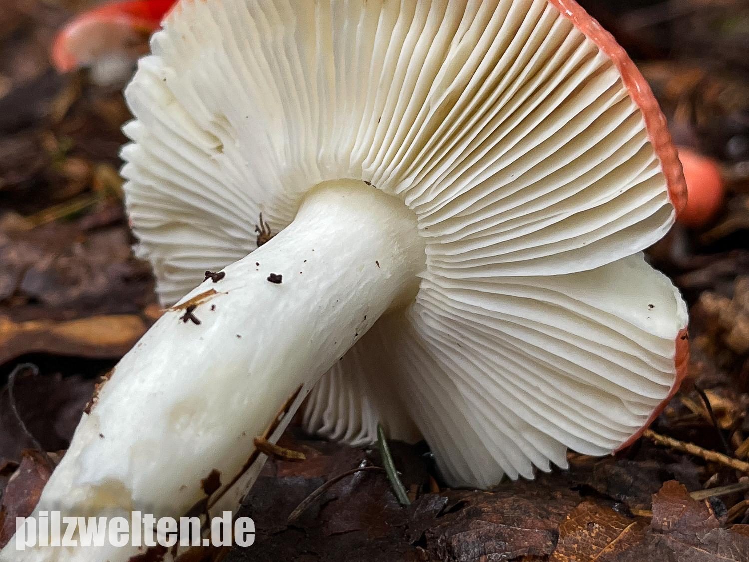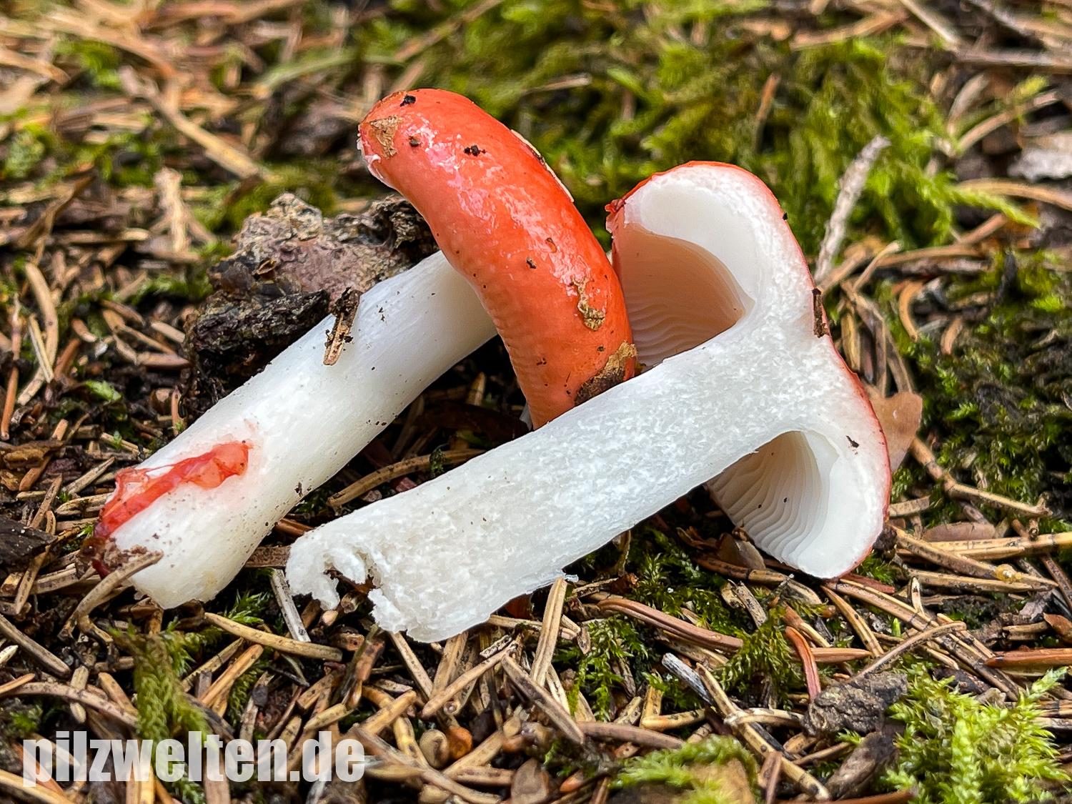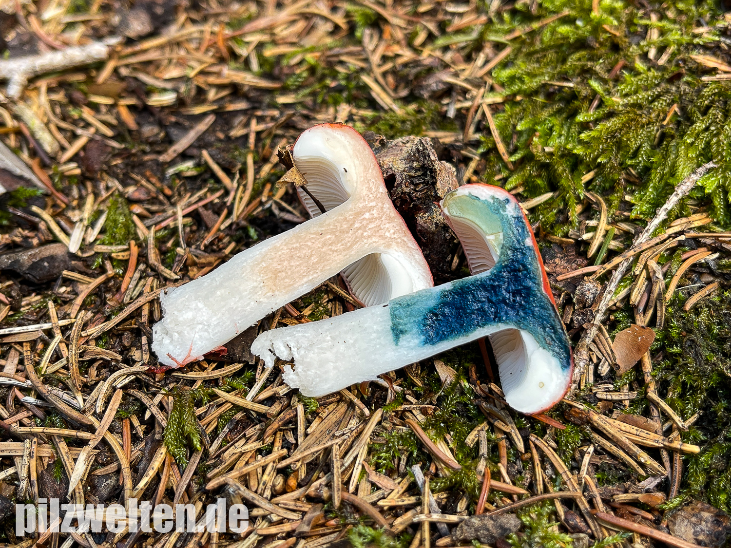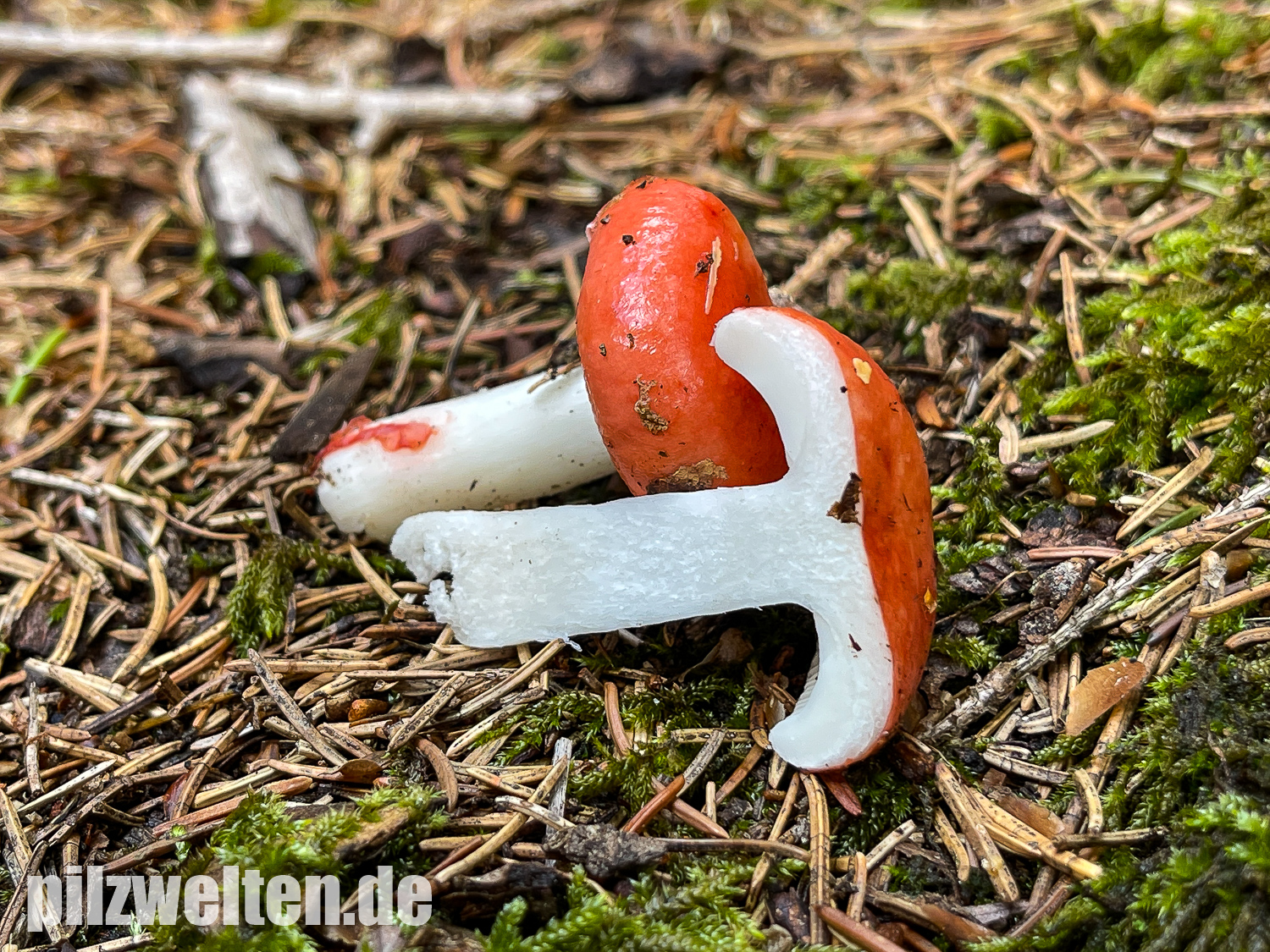 Bei unseren Nachforschungen sind wir auf Russula luteotacta gestoßen. Der (laut unseren Nachforschungen) einzige rote Täubling mit komplett weißlich gefärbten Stiel in Kombination mit scharfer und gleichzeitig bitterer Geschmacksprobe. Auch die Farbreaktionen mit Eisensulfat (graurosa) & Guajak (blaugrün) würden zu Russula luteotacta passen. Ansonsten haben wir nichts gefunden, was besser zu unserem Fund passt. Vielleicht hat hier ja anhand der Bilder noch eine andere Idee?