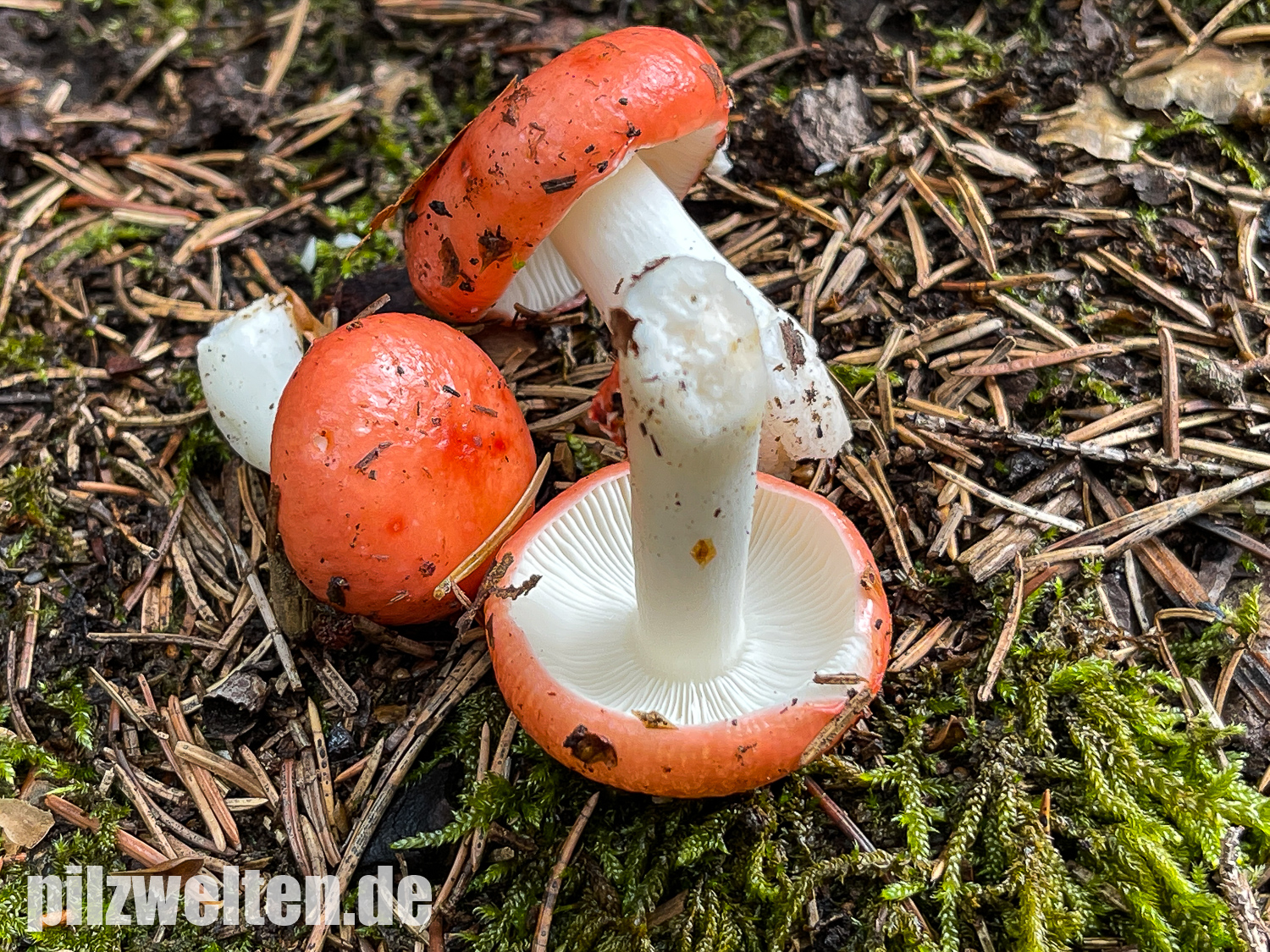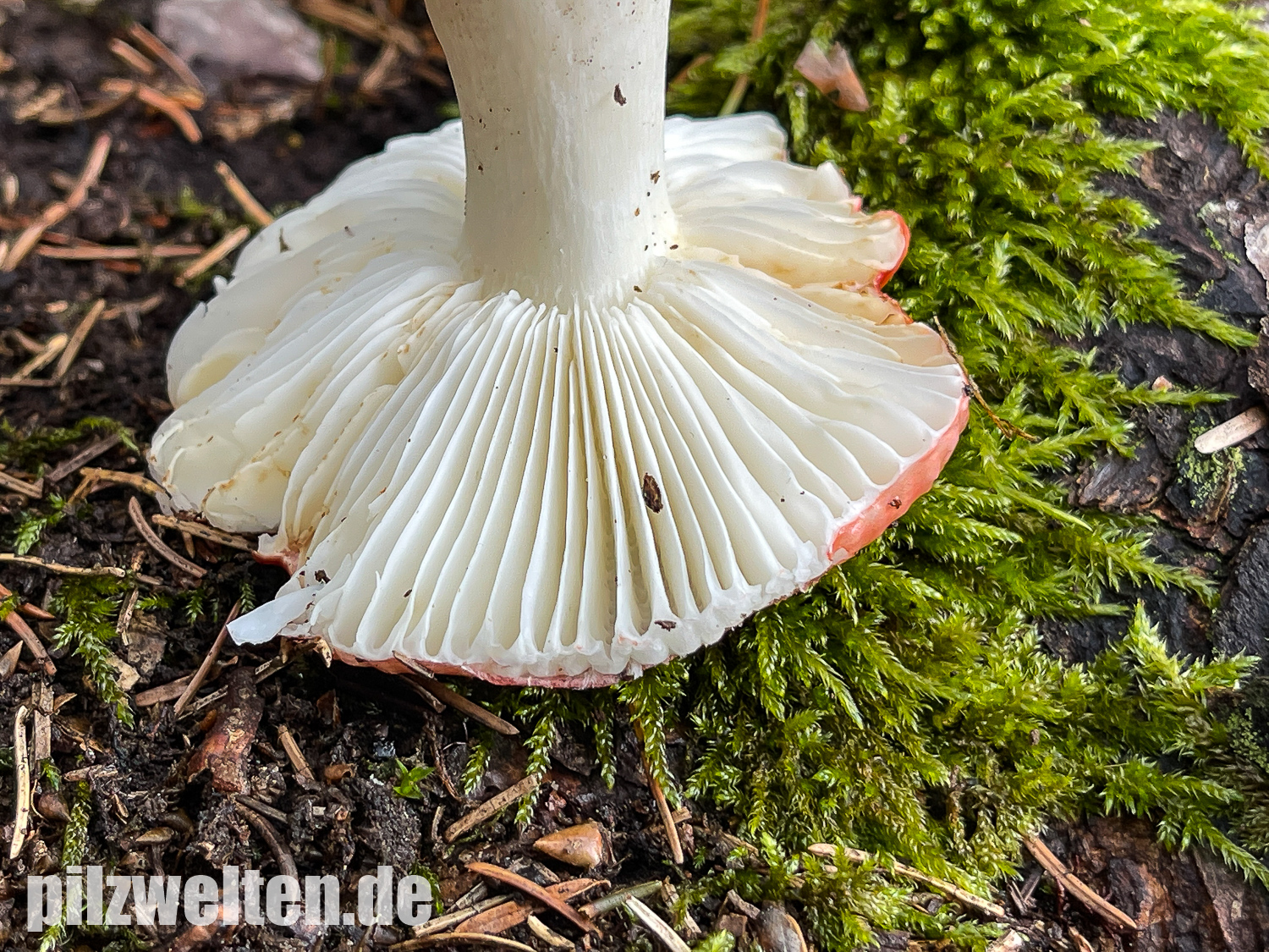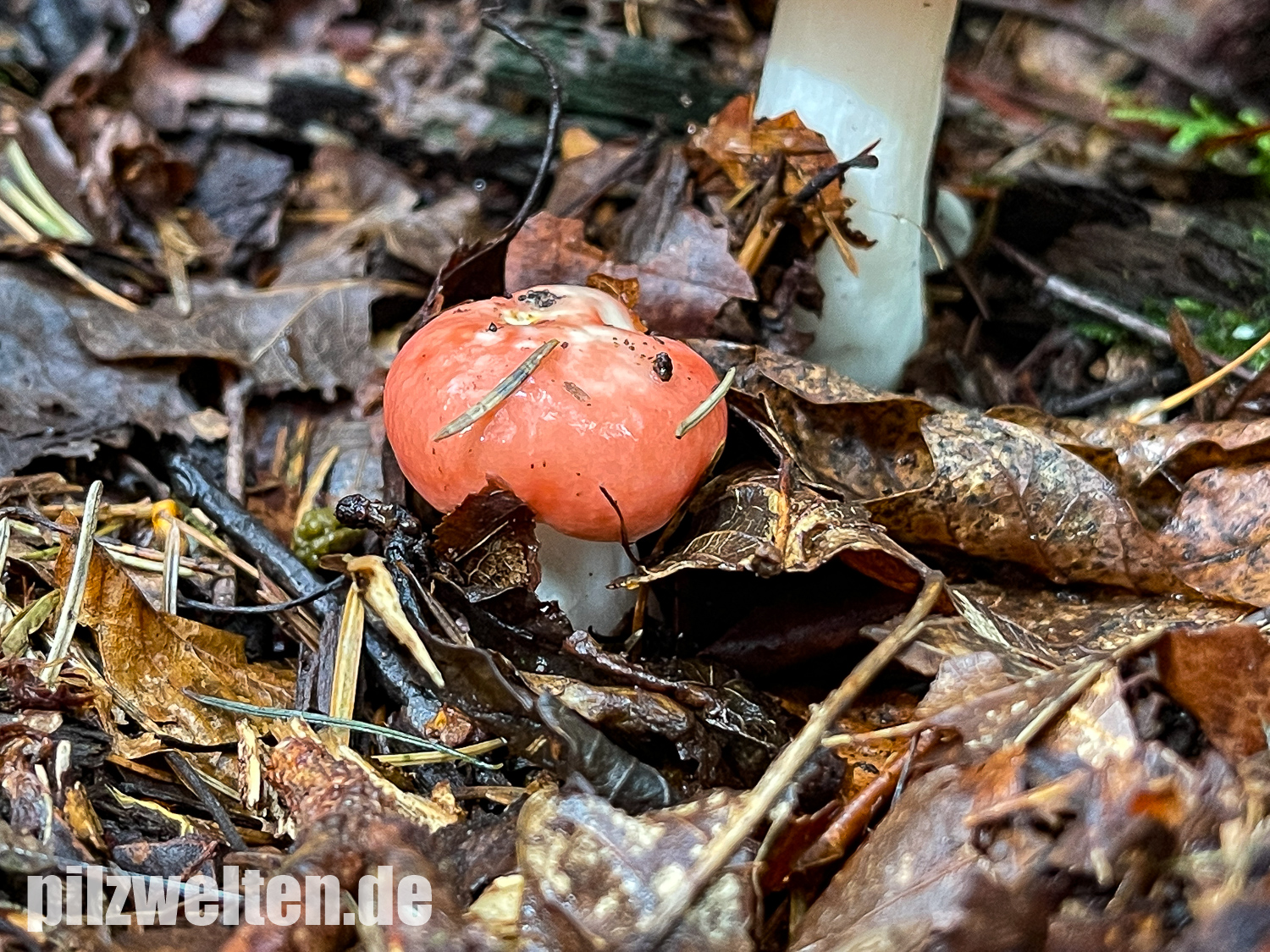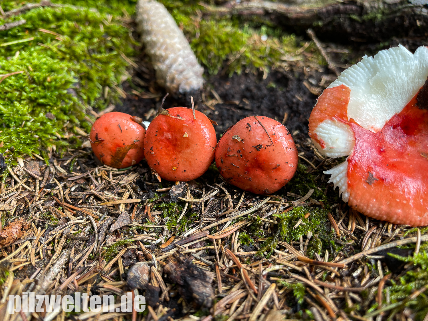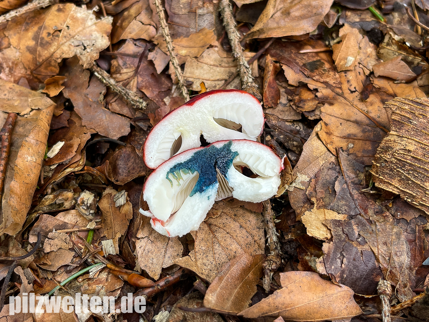 Bei unseren Nachforschungen sind wir auf Russula luteotacta gestoßen. Der (laut unseren Nachforschungen) einzige rote Täubling mit komplett weißlich gefärbten Stiel in Kombination mit scharfer und gleichzeitig bitterer Geschmacksprobe. Auch die Farbreaktionen mit Eisensulfat (graurosa) & Guajak (blaugrün) würden zu Russula luteotacta passen. Ansonsten haben wir nichts gefunden, was besser zu unserem Fund passt. Vielleicht hat hier ja anhand der Bilder noch eine andere Idee?