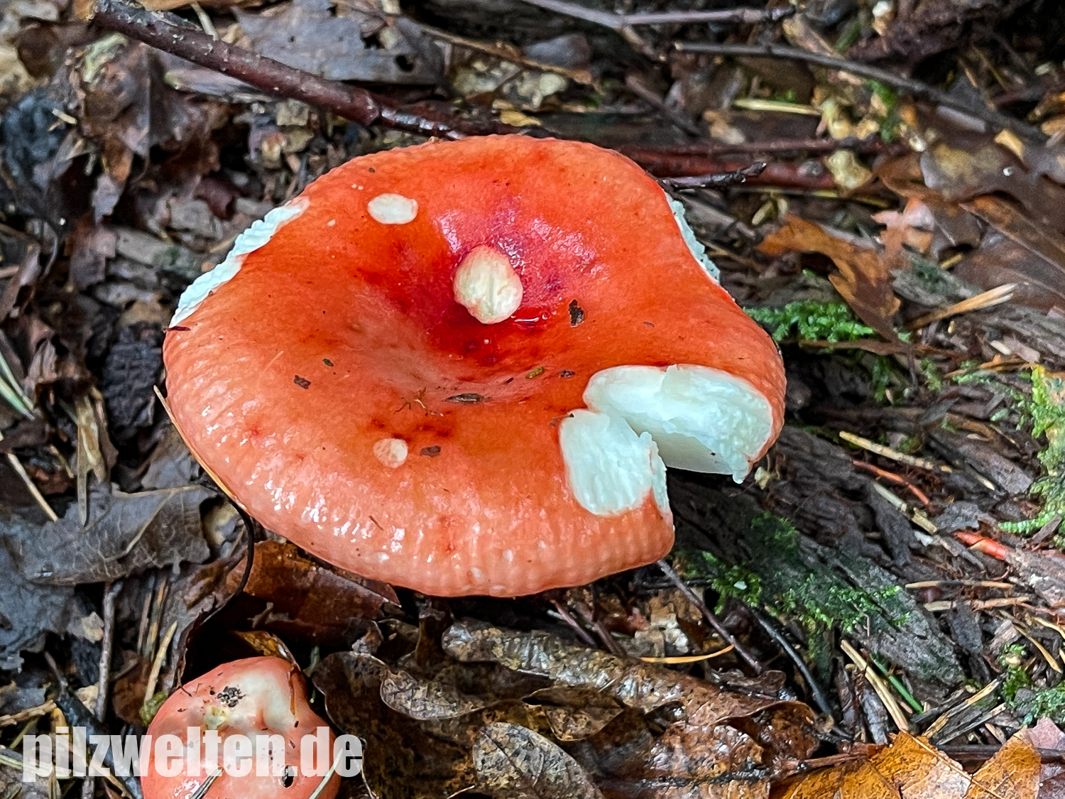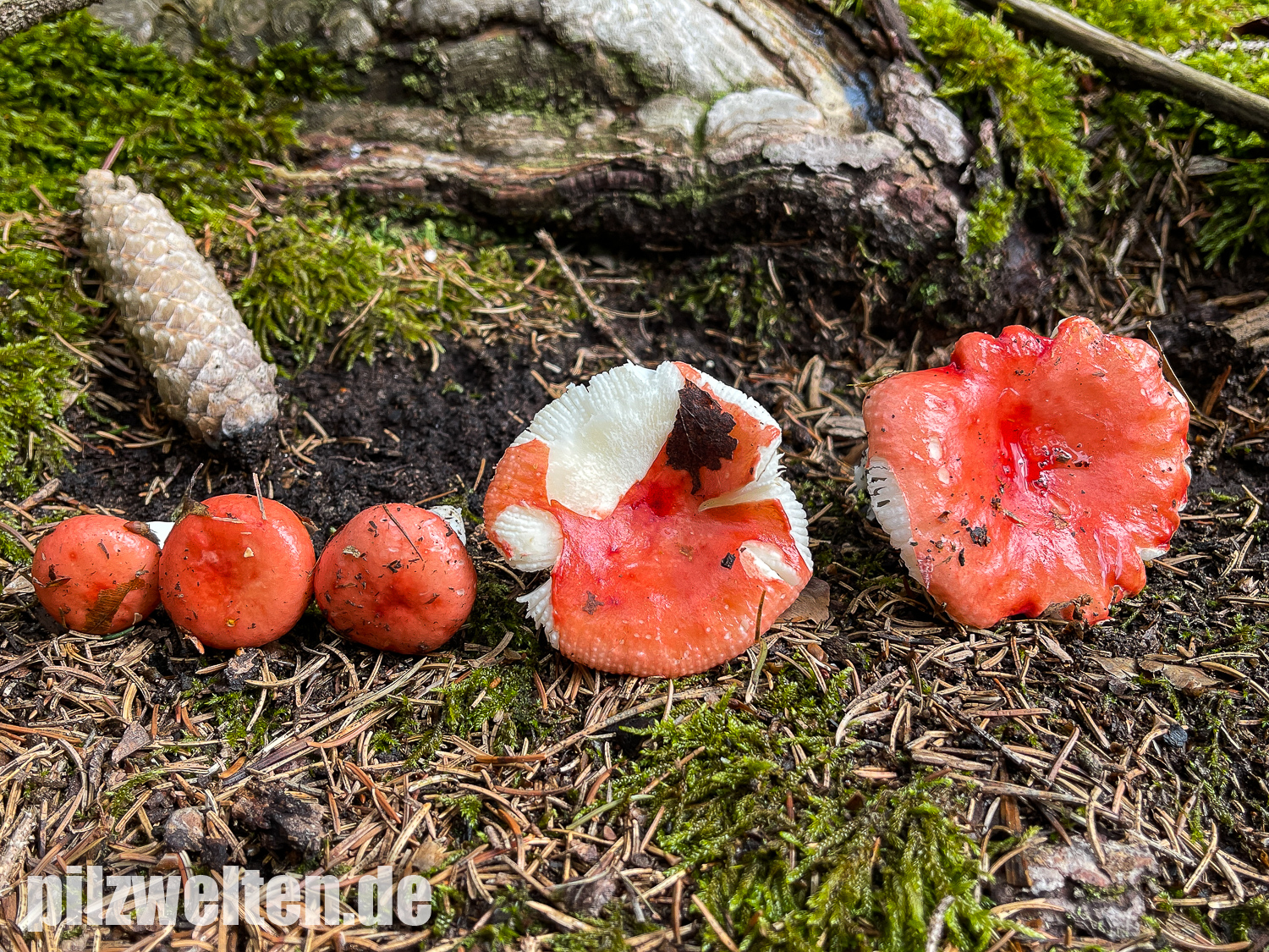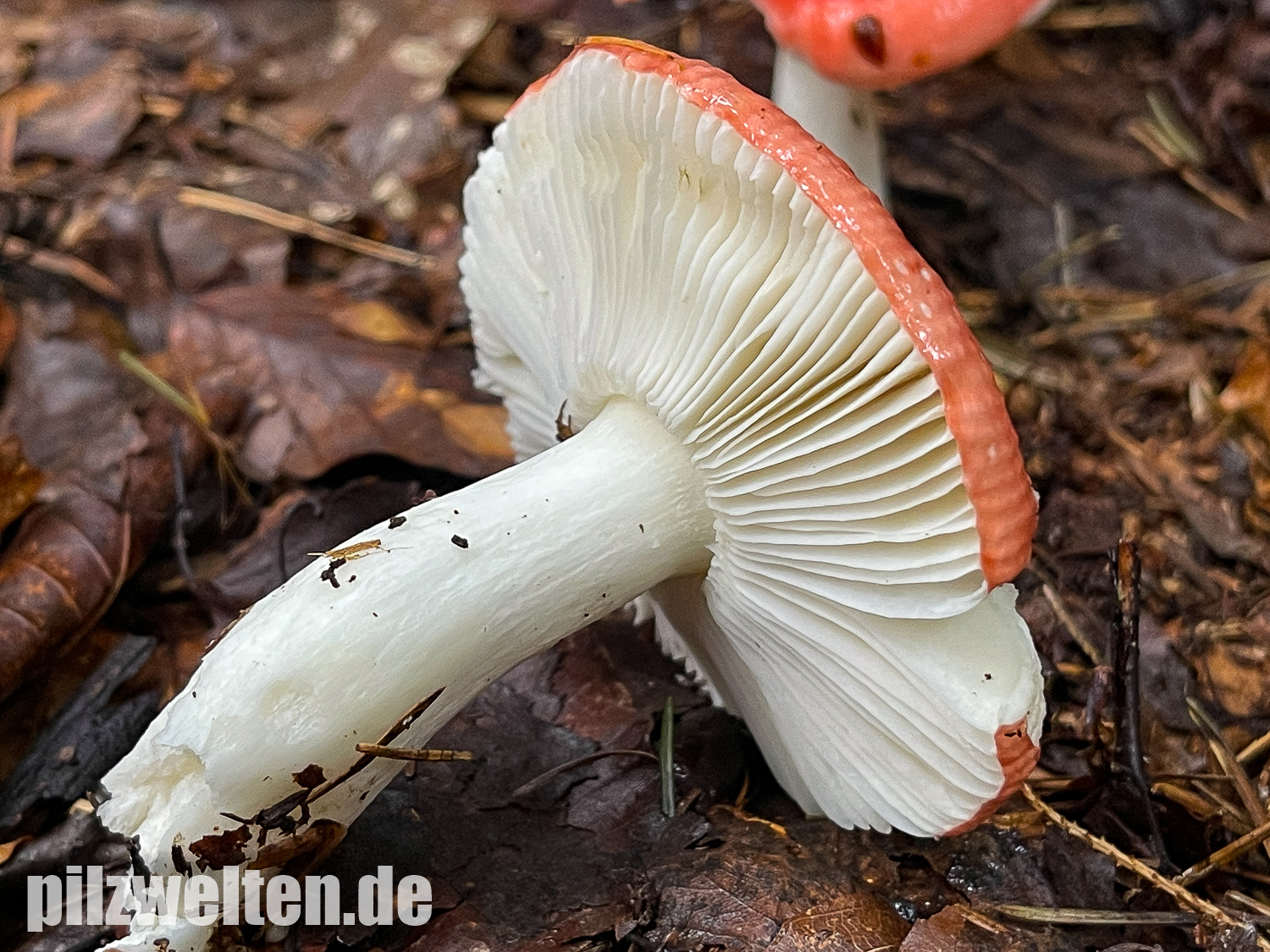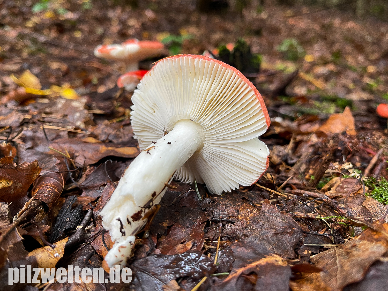 Bei unseren Nachforschungen sind wir auf Russula luteotacta gestoßen. Der (laut unseren Nachforschungen) einzige rote Täubling mit komplett weißlich gefärbten Stiel in Kombination mit scharfer und gleichzeitig bitterer Geschmacksprobe. Auch die Farbreaktionen mit Eisensulfat (graurosa) & Guajak (blaugrün) würden zu Russula luteotacta passen. Ansonsten haben wir nichts gefunden, was besser zu unserem Fund passt. Vielleicht hat hier ja anhand der Bilder noch eine andere Idee?