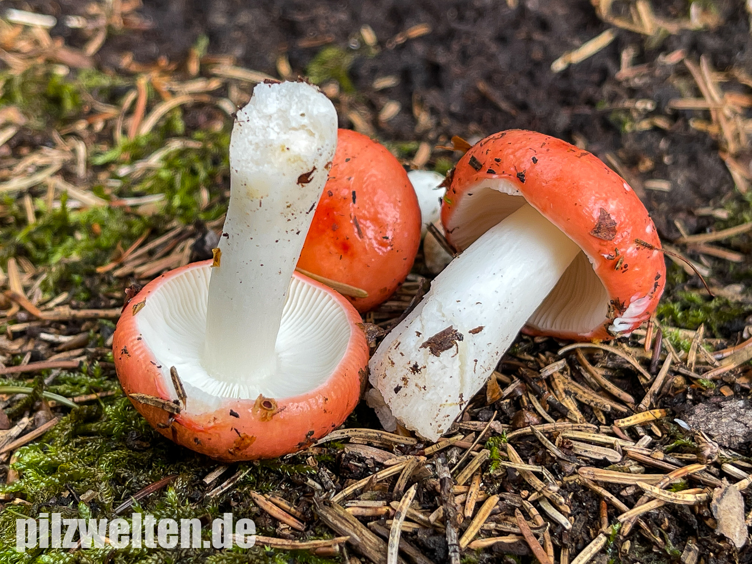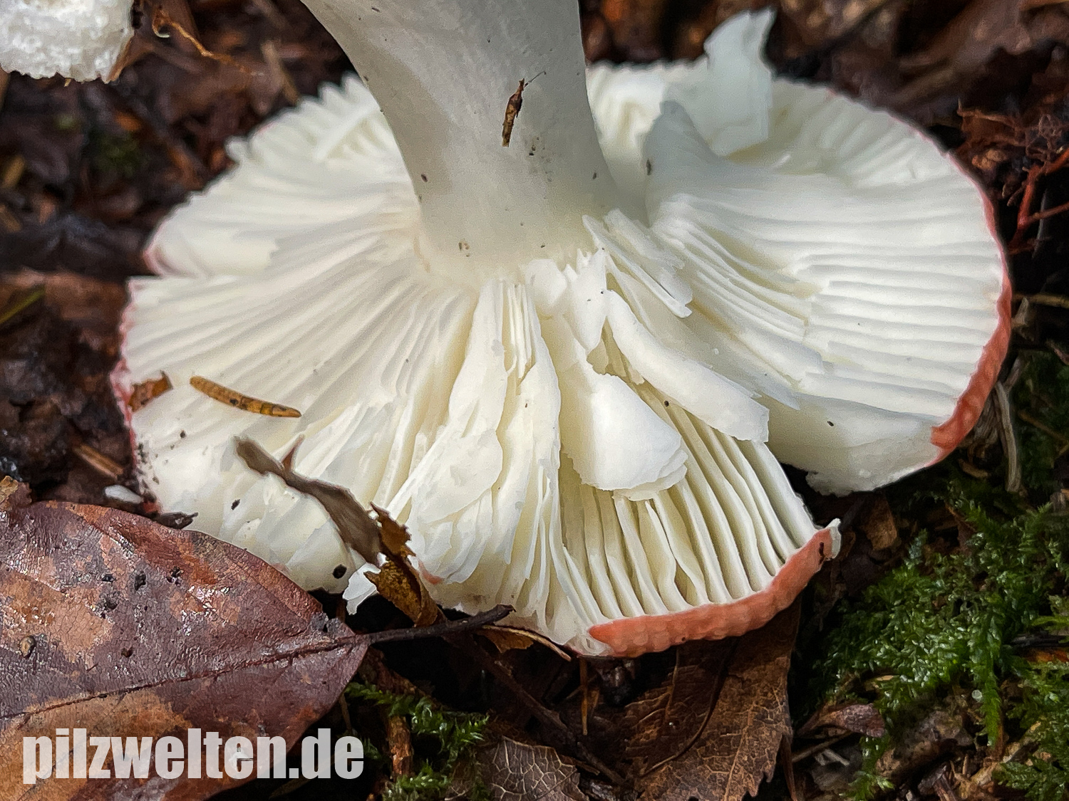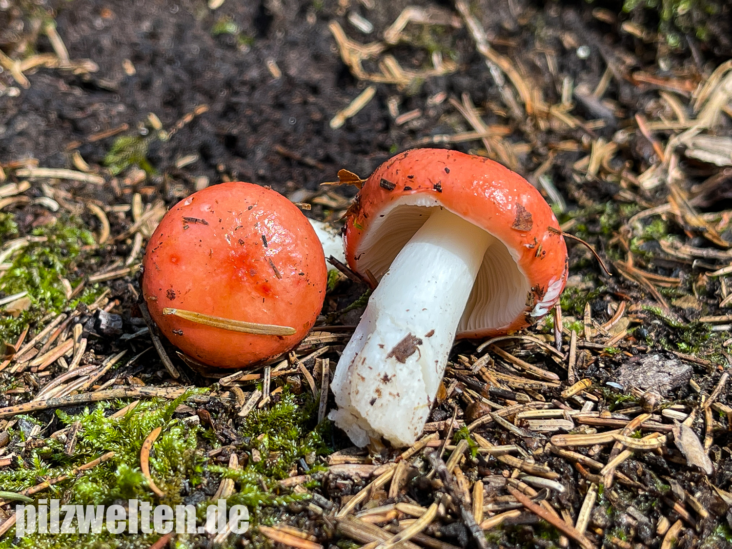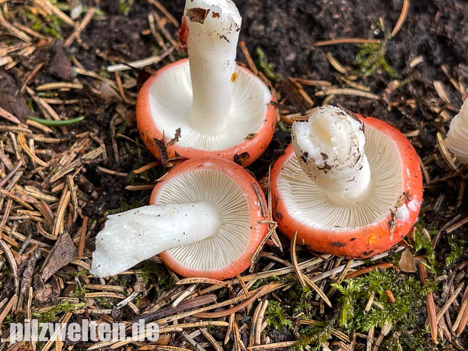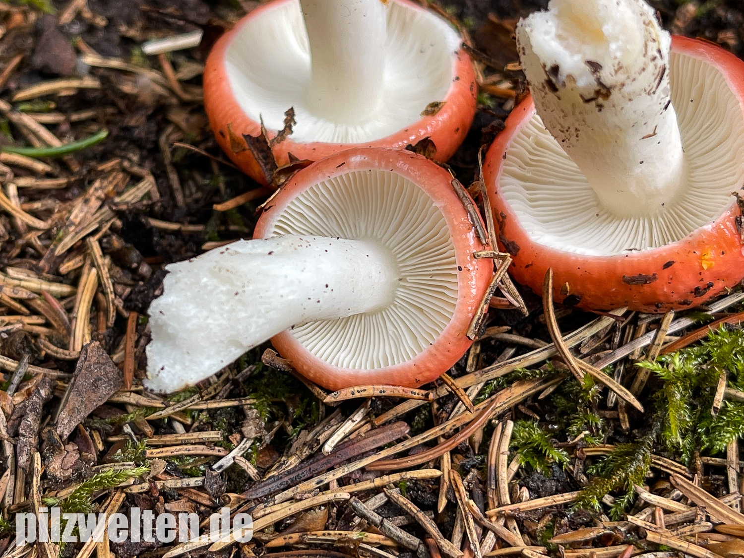 Bei unseren Nachforschungen sind wir auf Russula luteotacta gestoßen. Der (laut unseren Nachforschungen) einzige rote Täubling mit komplett weißlich gefärbten Stiel in Kombination mit scharfer und gleichzeitig bitterer Geschmacksprobe. Auch die Farbreaktionen mit Eisensulfat (graurosa) & Guajak (blaugrün) würden zu Russula luteotacta passen. Ansonsten haben wir nichts gefunden, was besser zu unserem Fund passt. Vielleicht hat hier ja anhand der Bilder noch eine andere Idee?