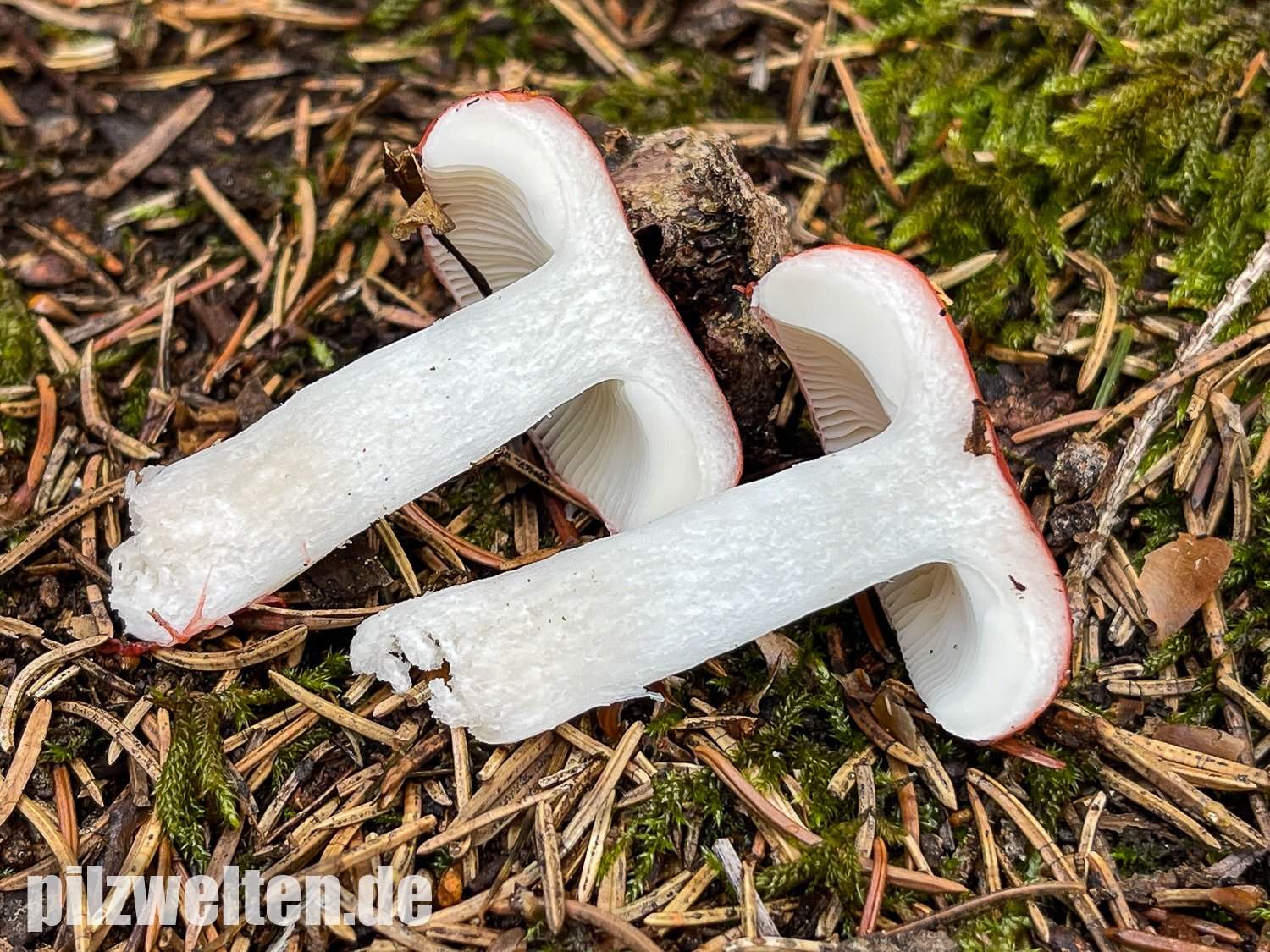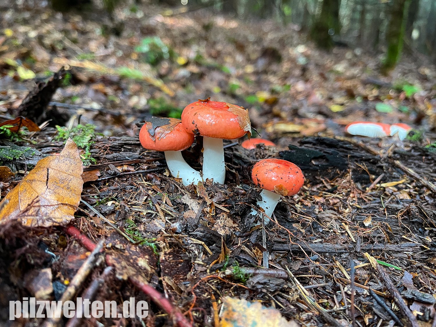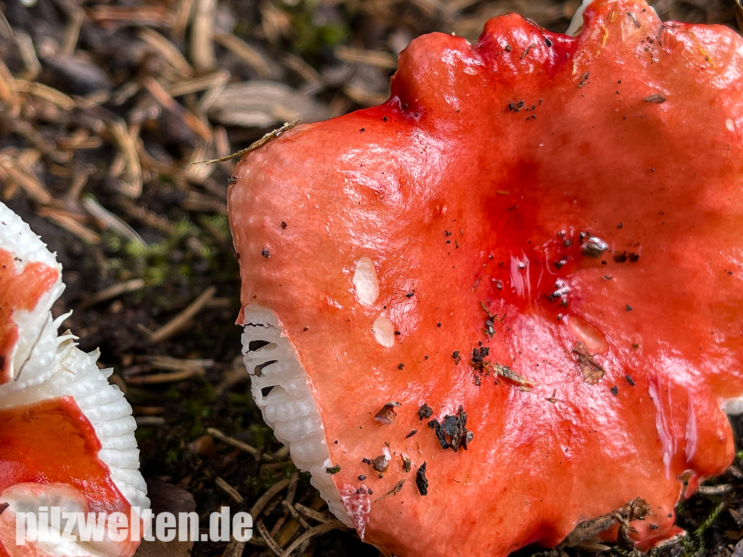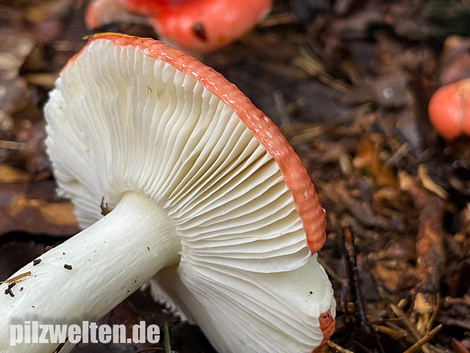 Bei unseren Nachforschungen sind wir auf Russula luteotacta gestoßen. Der (laut unseren Nachforschungen) einzige rote Täubling mit komplett weißlich gefärbten Stiel in Kombination mit scharfer und gleichzeitig bitterer Geschmacksprobe. Auch die Farbreaktionen mit Eisensulfat (graurosa) & Guajak (blaugrün) würden zu Russula luteotacta passen. Ansonsten haben wir nichts gefunden, was besser zu unserem Fund passt. Vielleicht hat hier ja anhand der Bilder noch eine andere Idee?