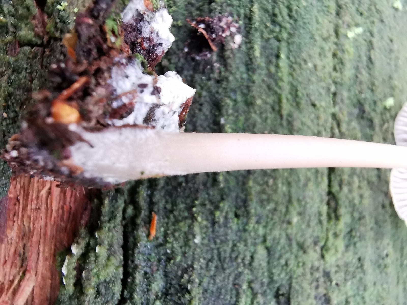 Ich würde ihn wie folgt beschreiben: Hutdurchmesser etwa 3 cm mit dünner Huthaut, Stiel elastisch, hohl, etwa 6cm lang, mit weißem Mycelfilz an der Basis. Lamellen weiß, mit Zwischenlamellen, ausgebuchtet angewachsen. Weißes Fleisch. Der ganze FK ohne sichtbare Hüllreste.