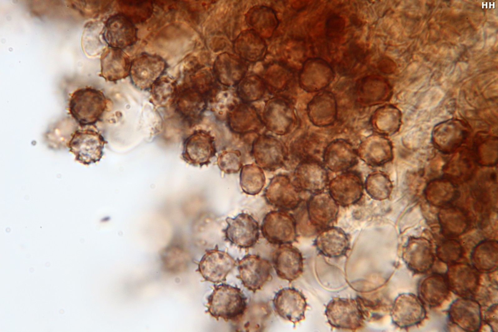 Sporen überwiegend elliptisch mit Stacheln bis 1,1 µm, braun, keine Verfärbung mit KOH 3% oder mit Melzer