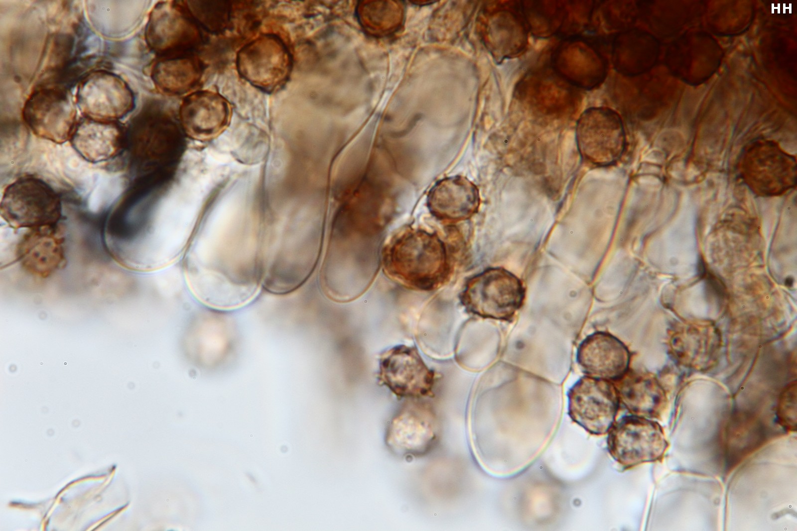 Sporen überwiegend elliptisch mit Stacheln bis 1,1 µm, braun, keine Verfärbung mit KOH 3% oder mit Melzer