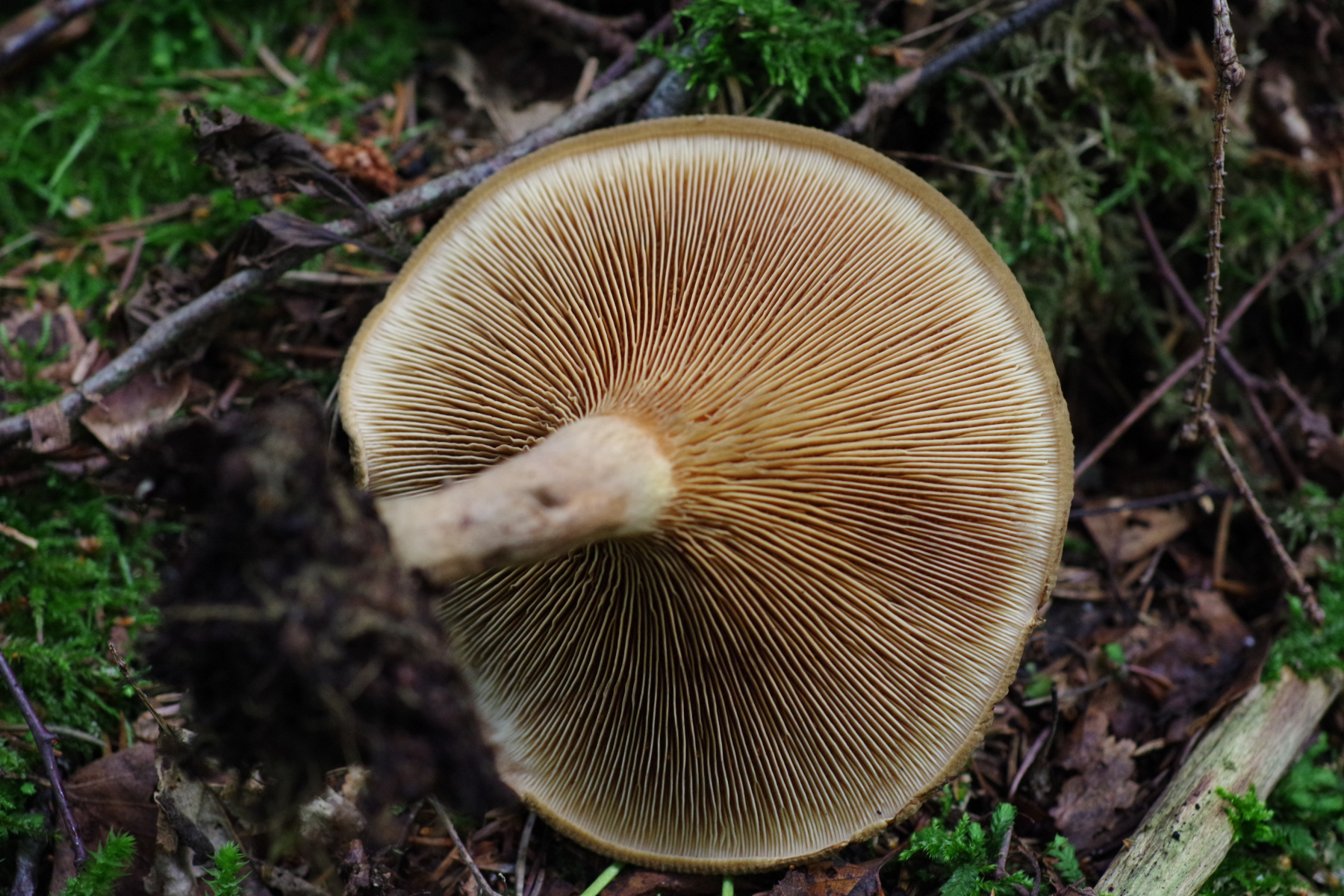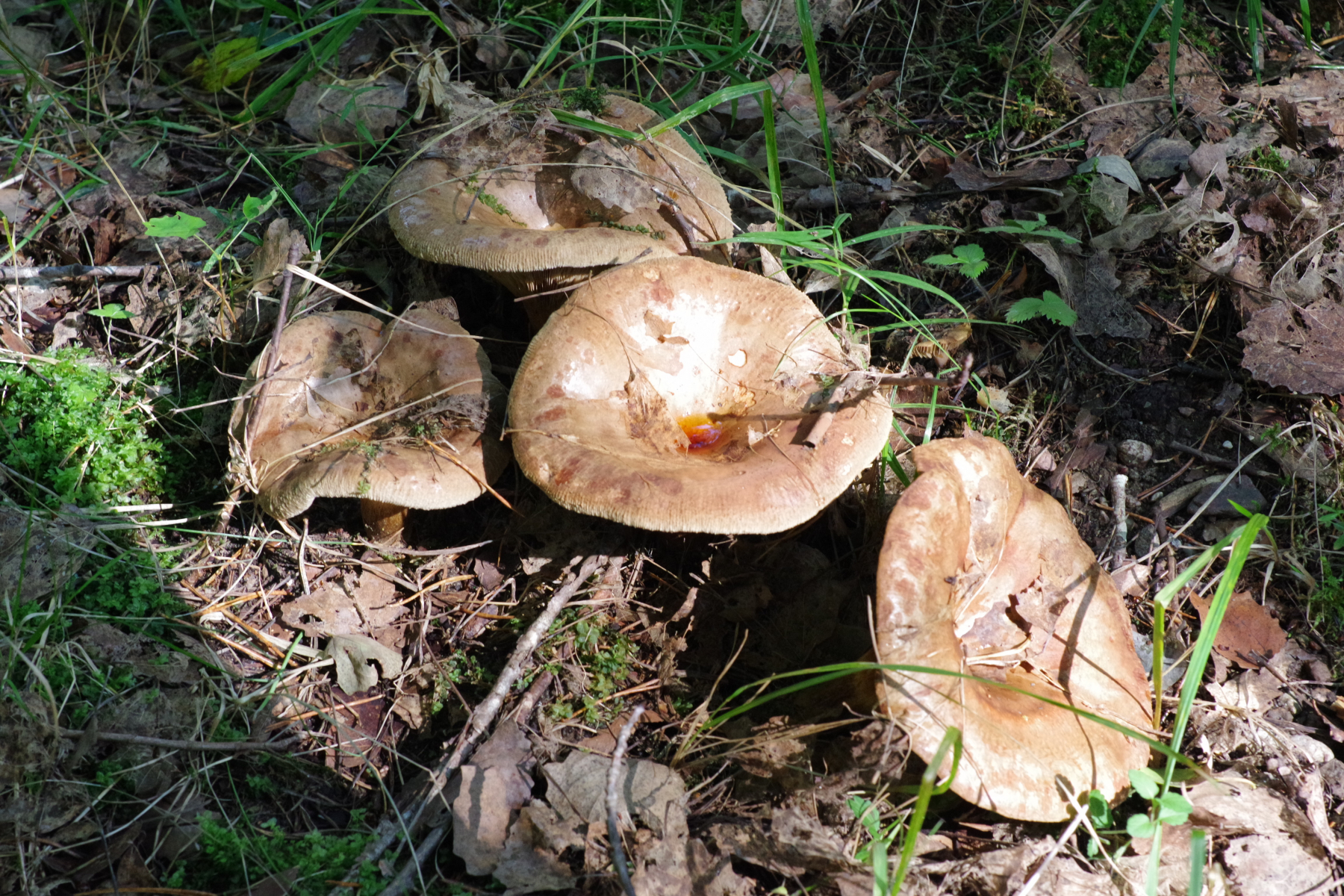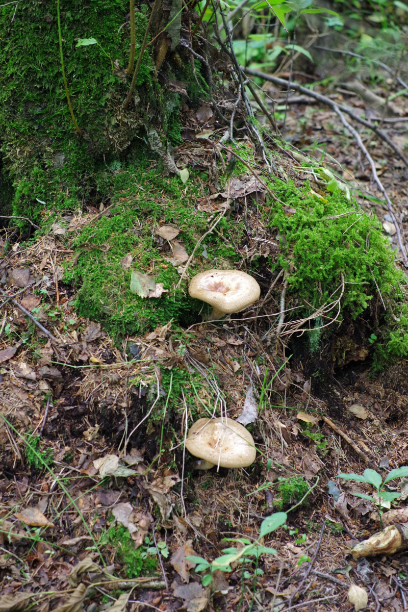 2) Bei der Gelegenheit bin ich auch über Paxillus validus gestolpert, wozu mir dann auch gleich der passende Pilz einfiel, der wächst nämlich gleich am Hof, bei Espen (außerdem vorhanden Fichte, Hasel, Ahorn), jedenfalls ist die Beschränkung auf das Espenterritorium auffällig. Teils sehr groß, um die 20 cm. Vielleicht schaut Christoph ja mal rein, wenn er wieder Muße hat, der hat die Art ja beschrieben Tricholomopsis