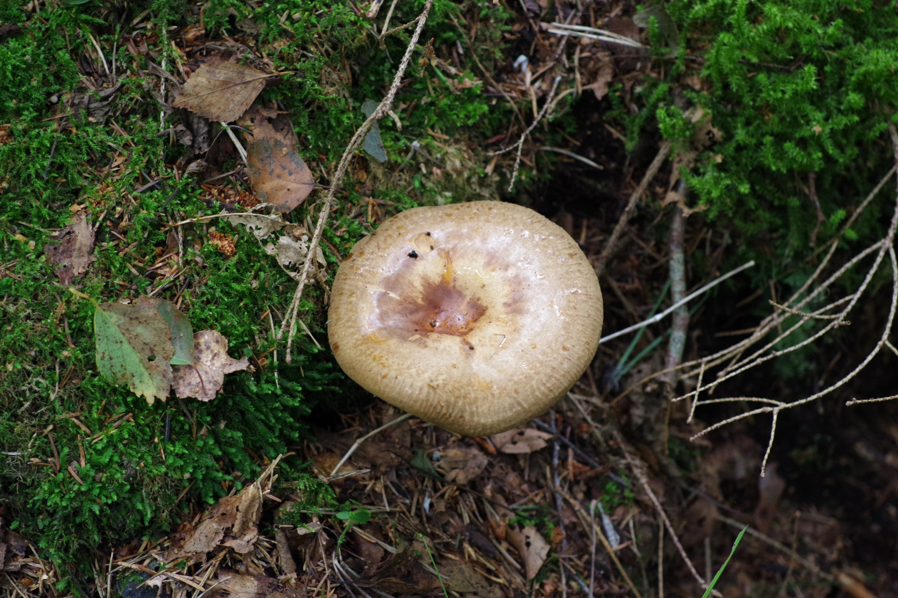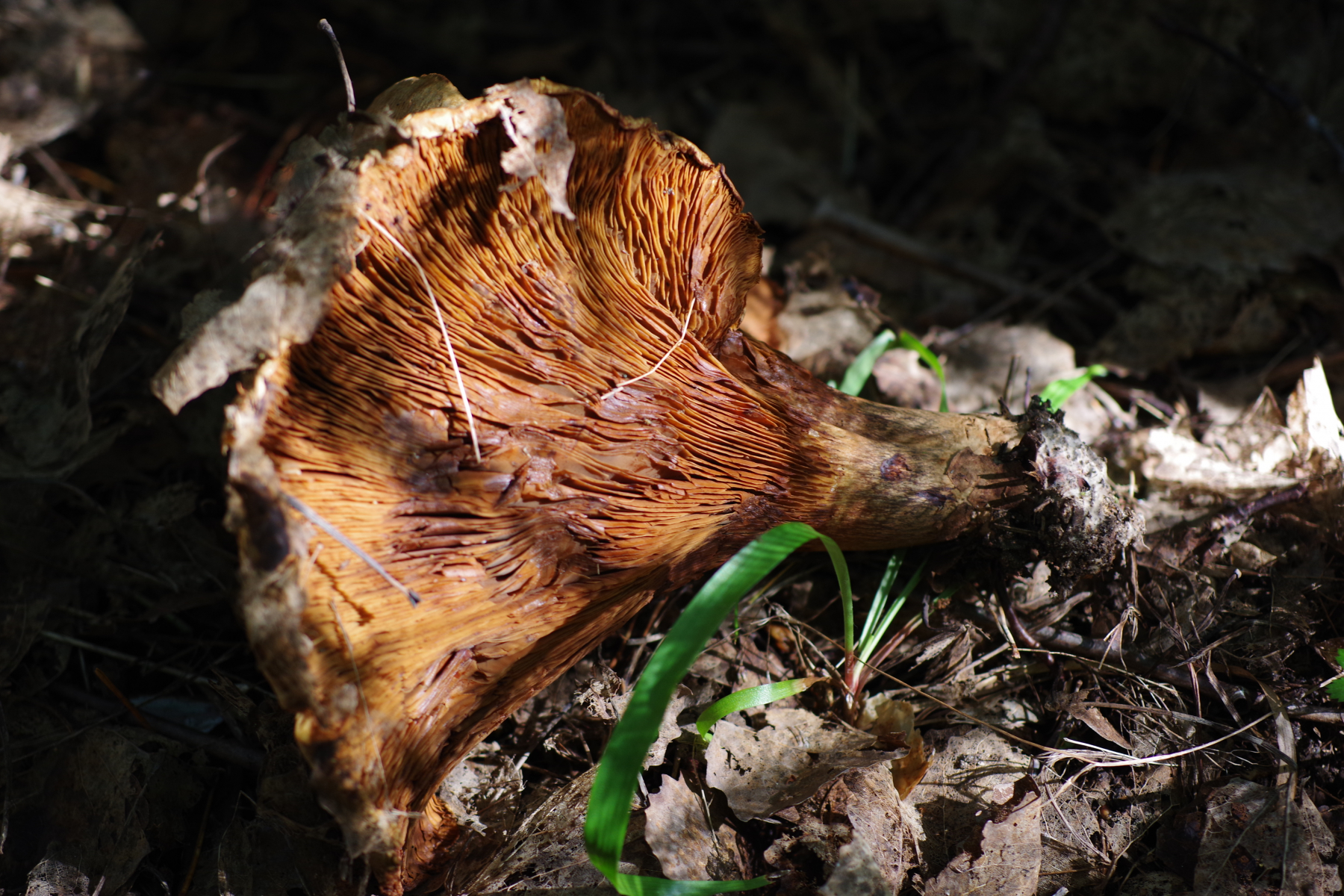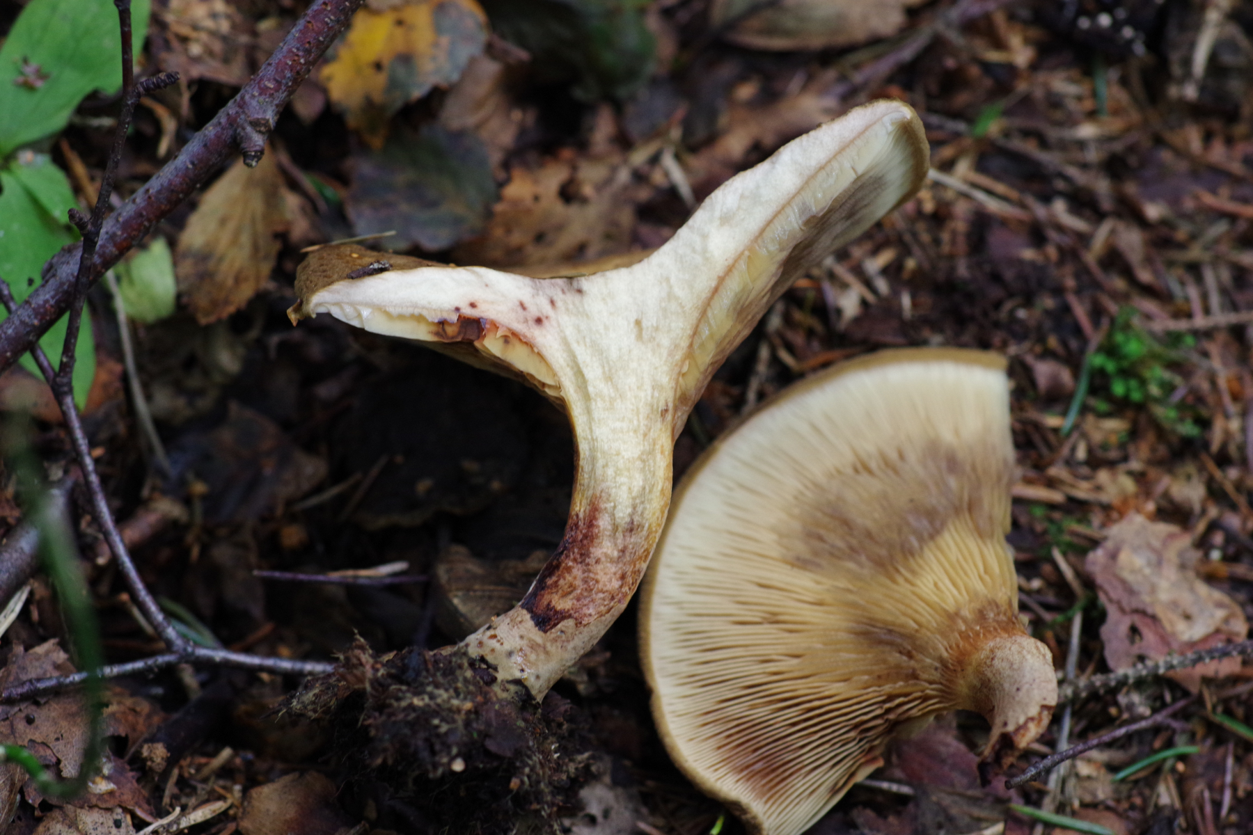 2) Bei der Gelegenheit bin ich auch über Paxillus validus gestolpert, wozu mir dann auch gleich der passende Pilz einfiel, der wächst nämlich gleich am Hof, bei Espen (außerdem vorhanden Fichte, Hasel, Ahorn), jedenfalls ist die Beschränkung auf das Espenterritorium auffällig. Teils sehr groß, um die 20 cm. Vielleicht schaut Christoph ja mal rein, wenn er wieder Muße hat, der hat die Art ja beschrieben Tricholomopsis
