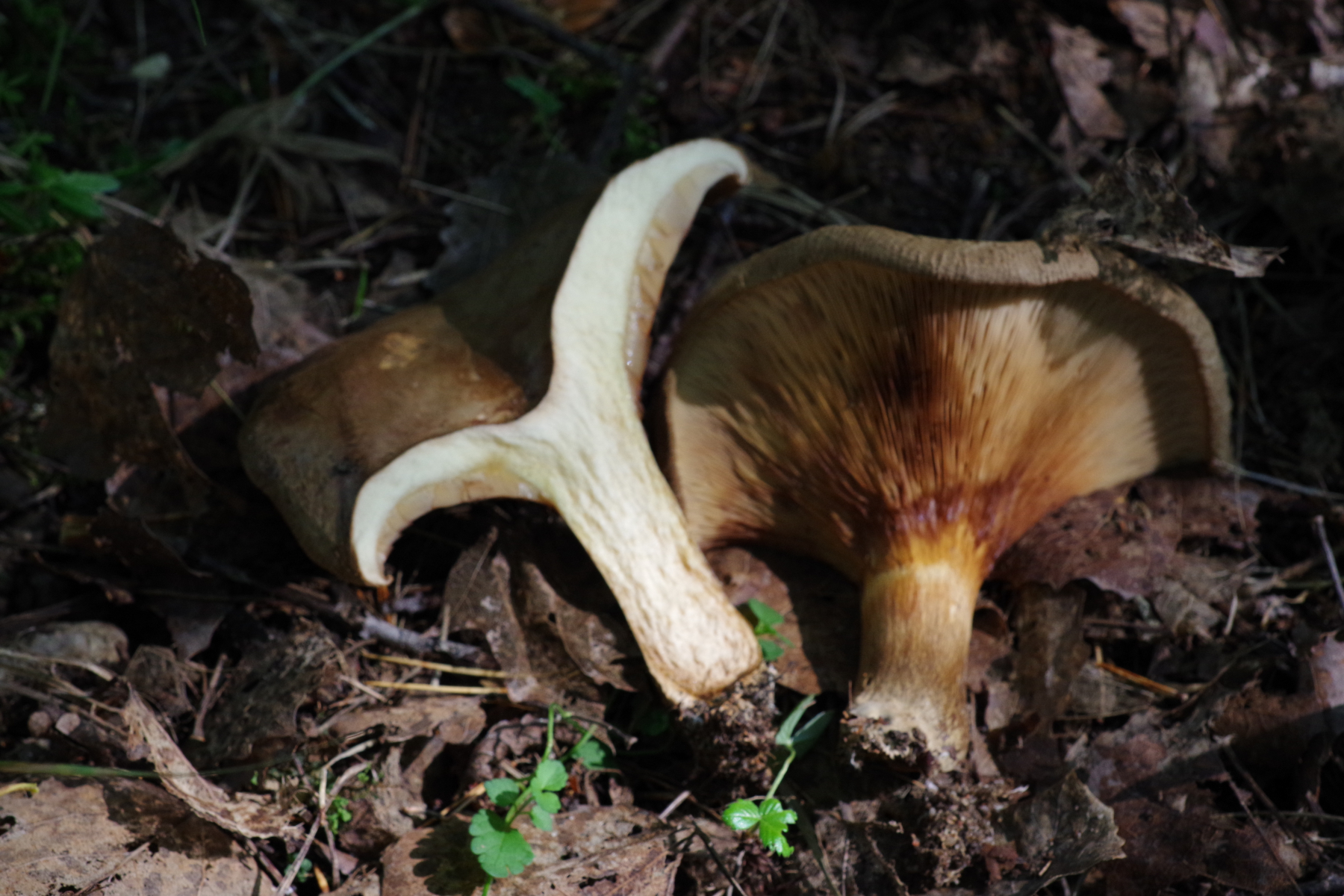 1) Vom Biotop her, der wuchs an einem Schwarzerlenhost, deutet erst mal vieles Richtung Paxillus rubicundulus. Größe etwa 12-13 cm. Im Schnitt am Stiel unten rötlich. Gekostet habe ich nicht und der Geruch war unauffällig.