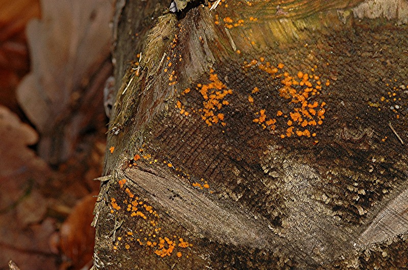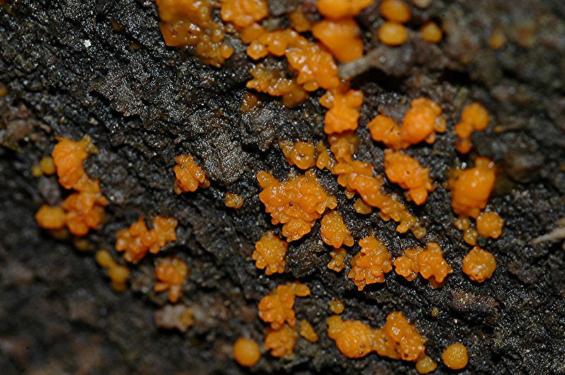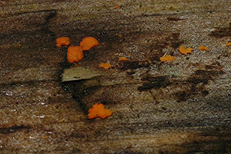 Ein unsicherer Tipp wäre tatsächlich die 2. Erscheinungsform von Dacrymyces stillatus (Zerfließende Gallertträne), also die orangefarbenen, unregelmäßig polsterförmigen, recht schleimigen Fruchtkörper, die ihre hyphige Zellen in kettenförmige Sporen umwandeln können.