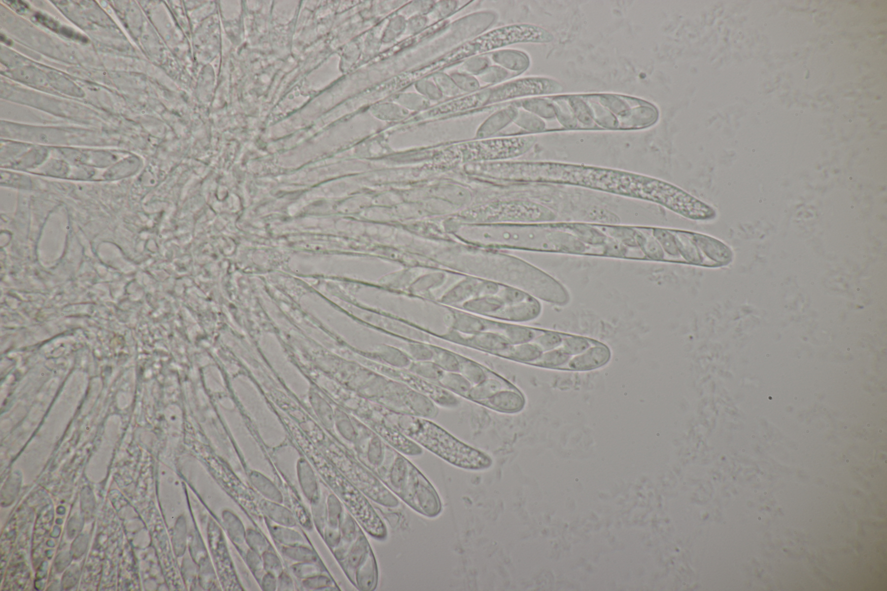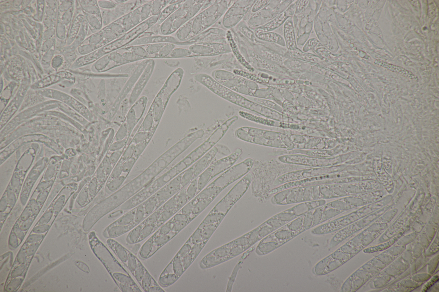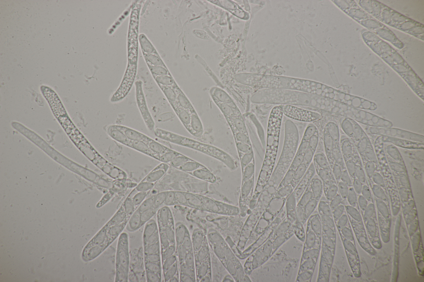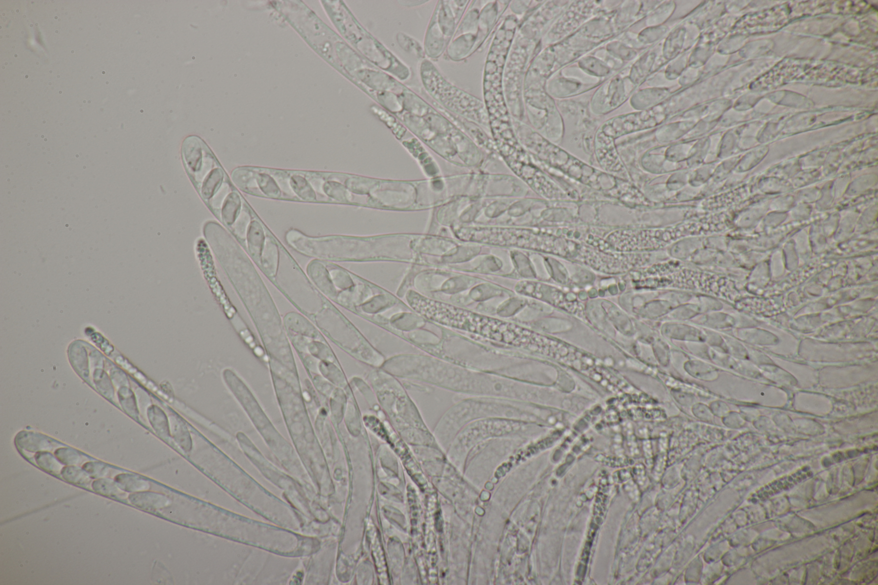 Sporen (noch im Ascus) messen (9.0-10.5) µm x (3.8-4.8) µm, Q=1.9-2.5 und haben an den beiden Enden wenige, sehr kleine Tröpfchen. Asci reagieren mit Lugol blau, die Paraphysen haben viele kleine Tröpfchen. Ob Haken vorhanden sind oder nicht, konnte ich leider nicht feststellen.