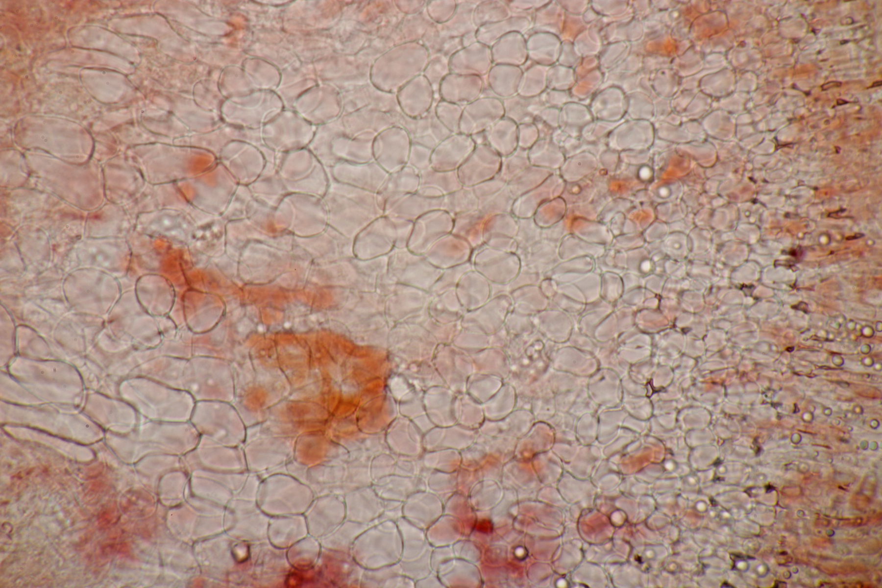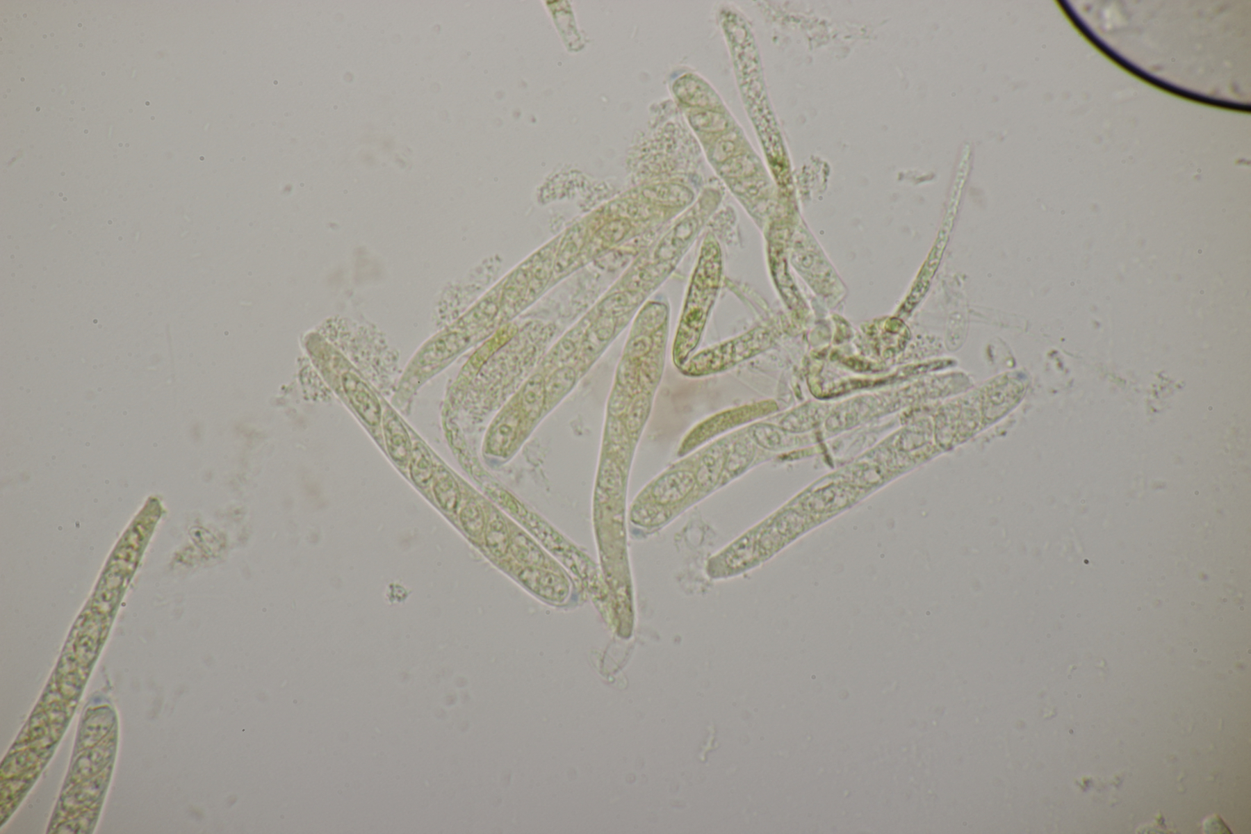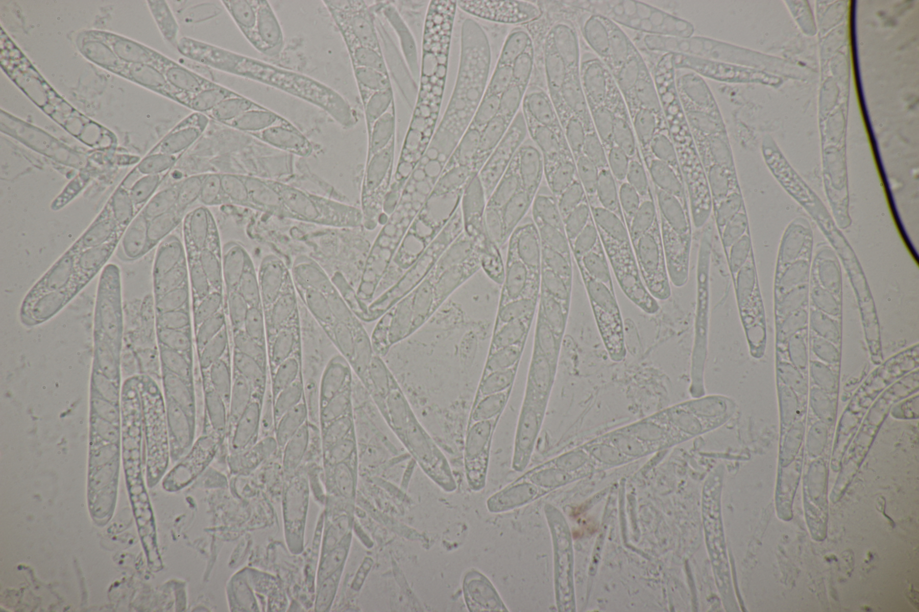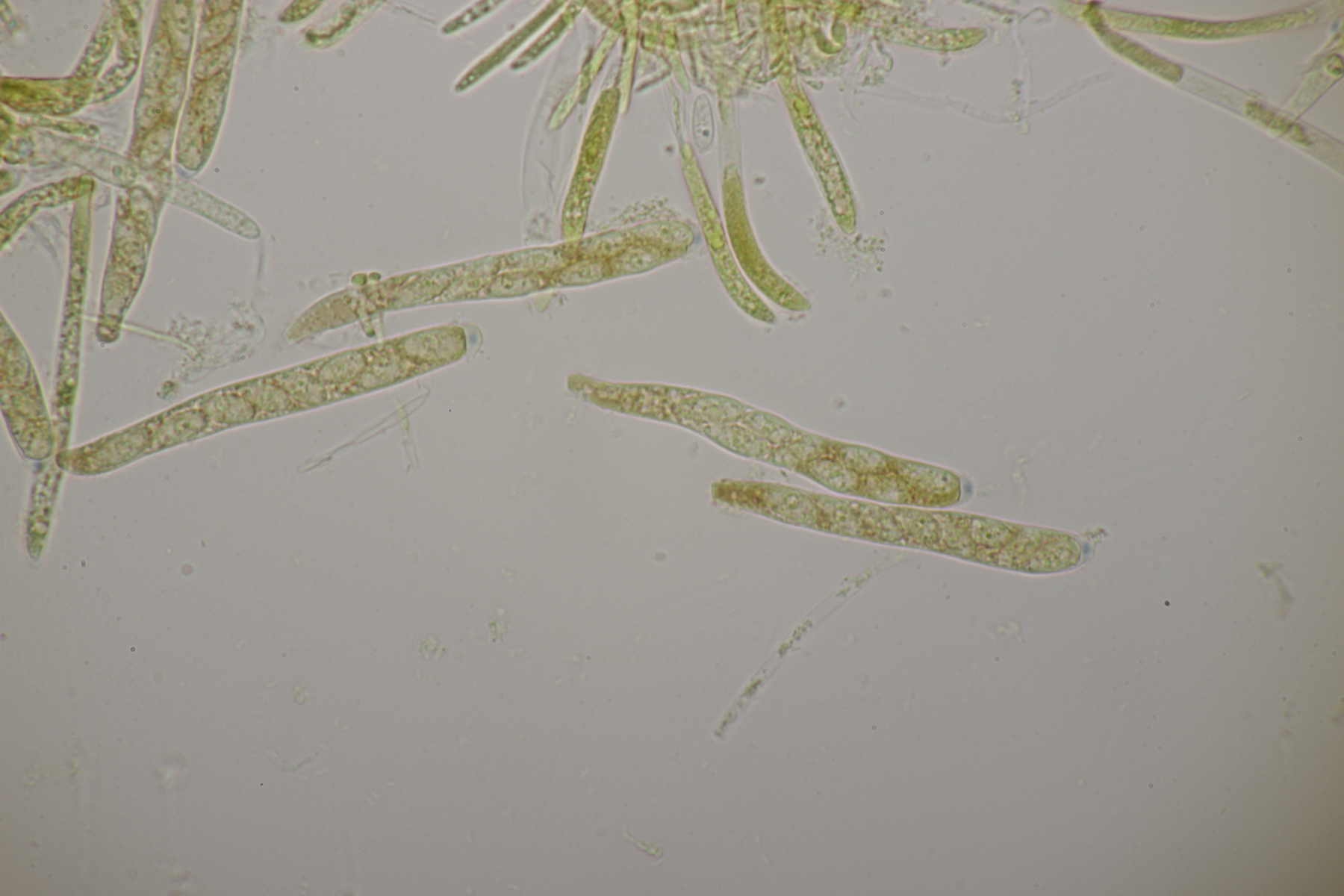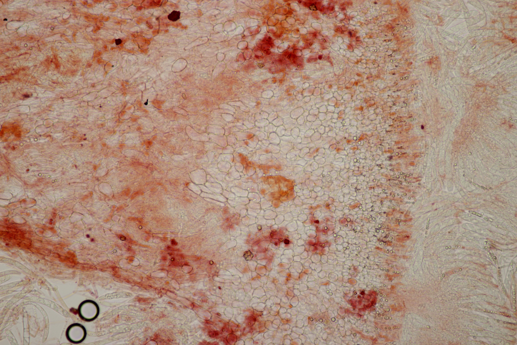 Sporen (noch im Ascus) messen (9.0-10.5) µm x (3.8-4.8) µm, Q=1.9-2.5 und haben an den beiden Enden wenige, sehr kleine Tröpfchen. Asci reagieren mit Lugol blau, die Paraphysen haben viele kleine Tröpfchen. Ob Haken vorhanden sind oder nicht, konnte ich leider nicht feststellen.